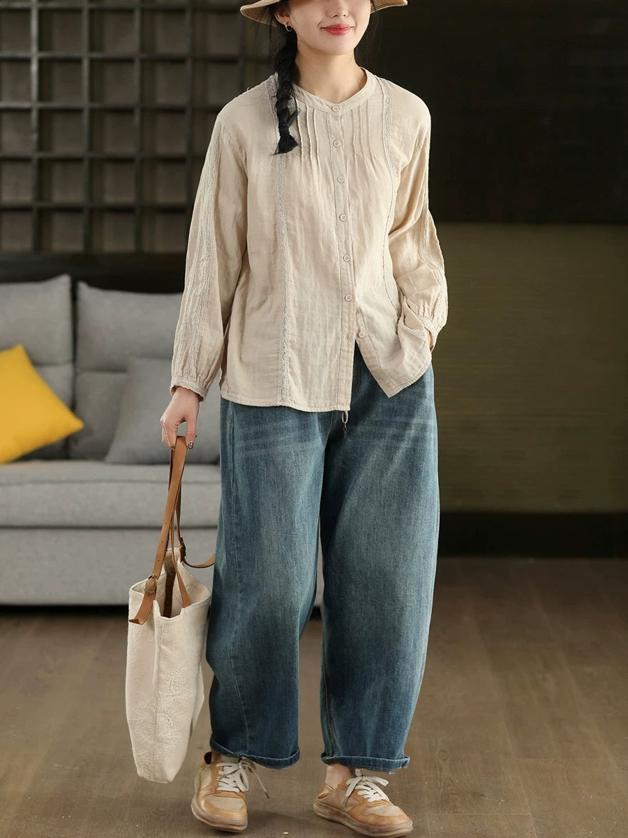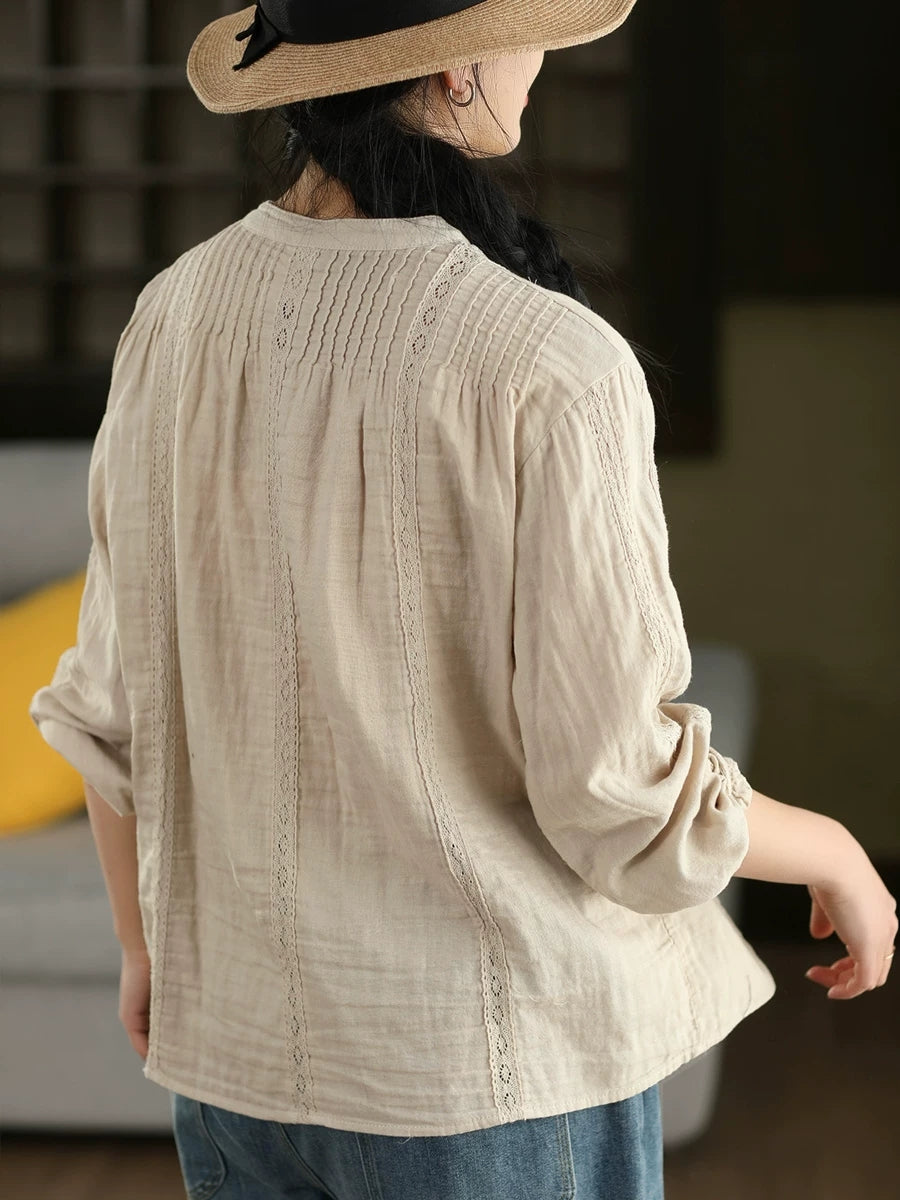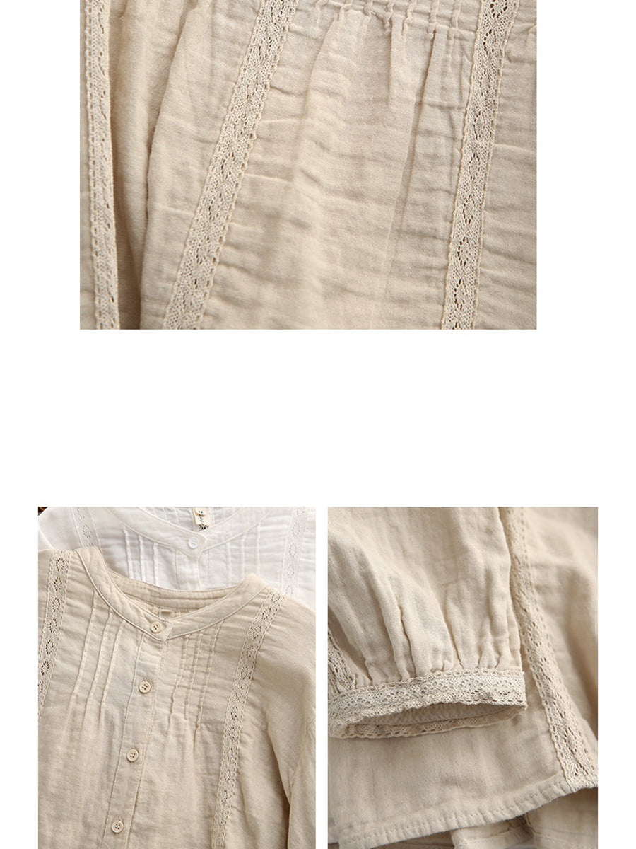 Women Spring Artsy Lace Spliced 100%Cotton Shirt