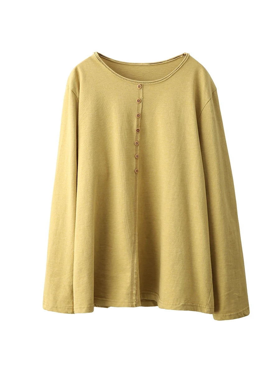 Women Spring Artsy Pure Color 100%Cotton O-Neck Blouse