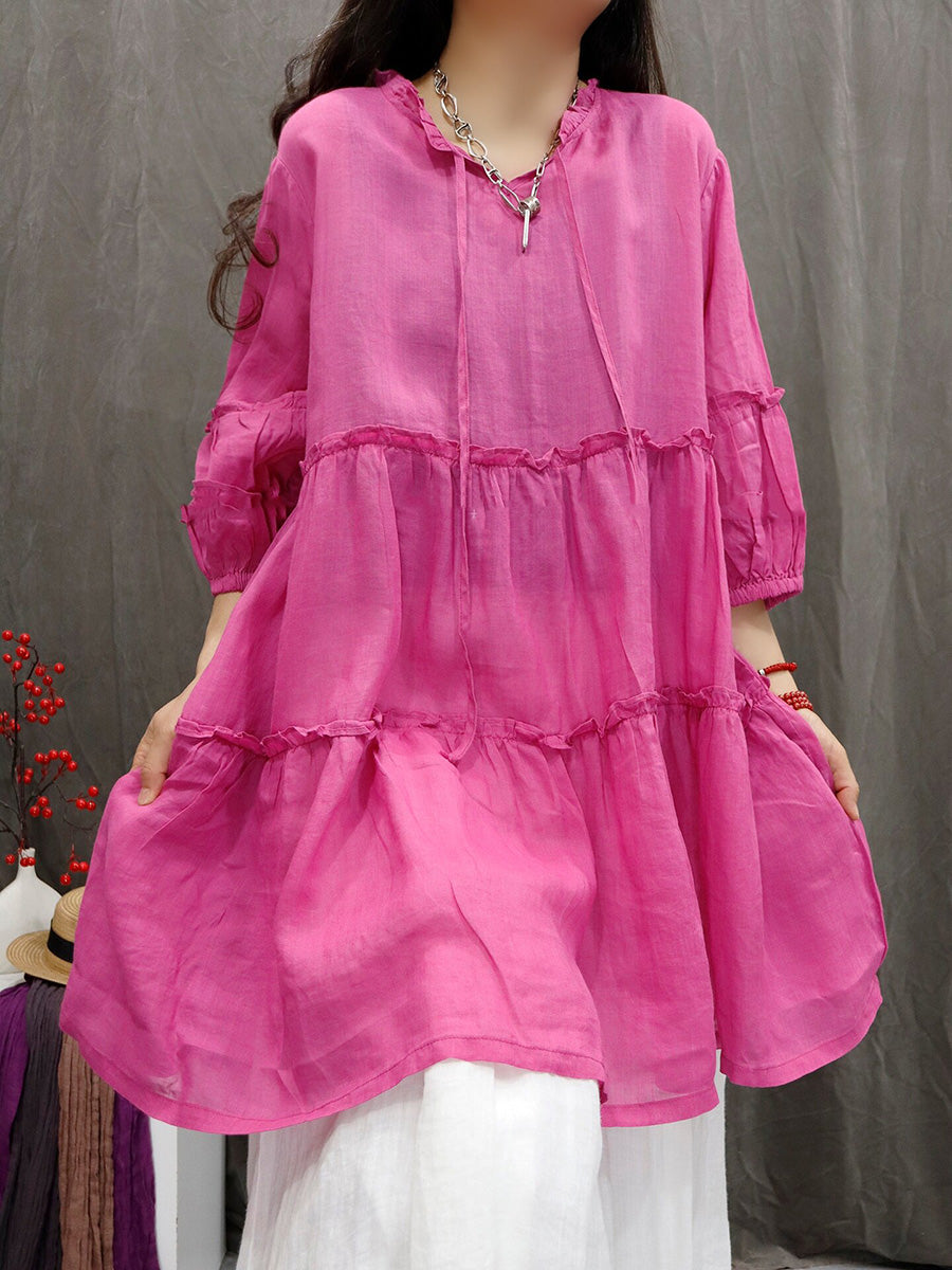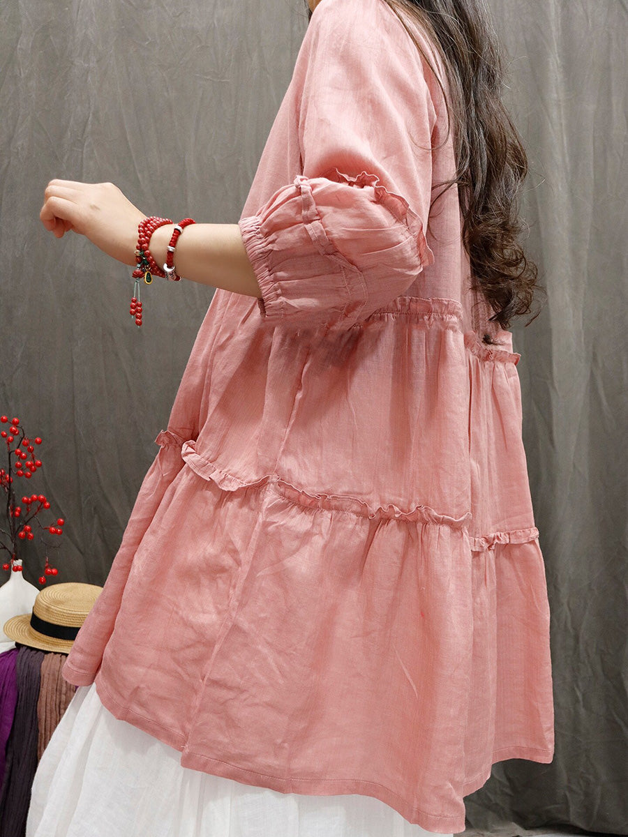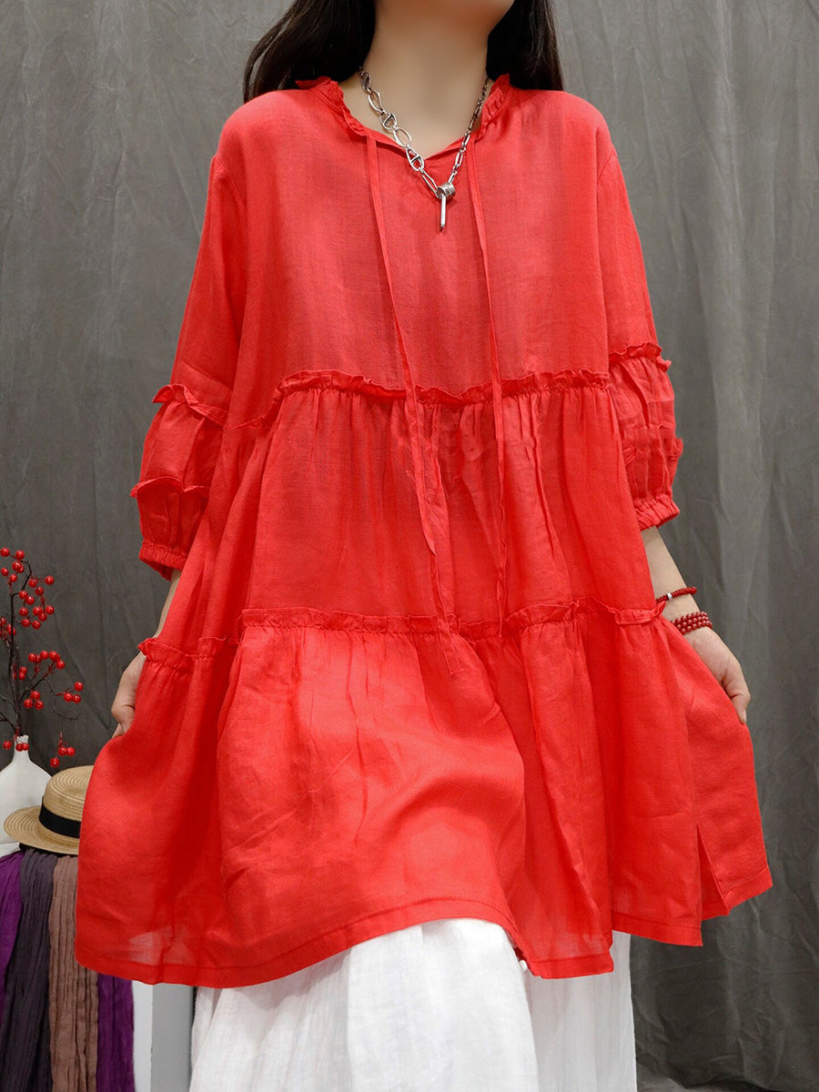 Women Spring Artsy Pure Color 100%Ramie V-Neck Blouse