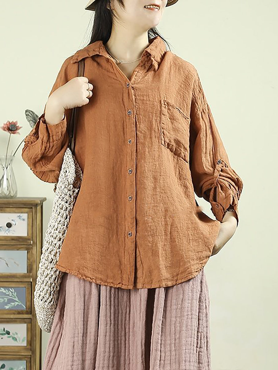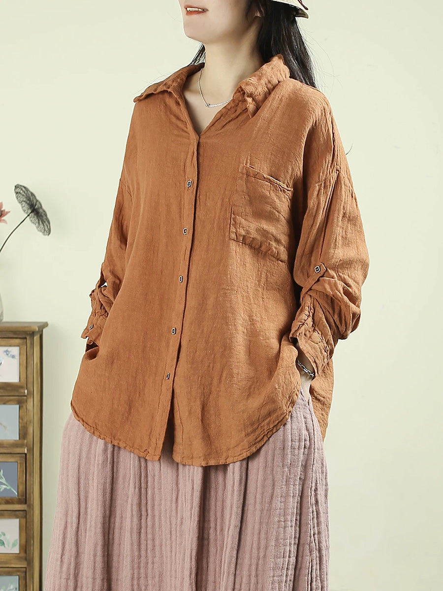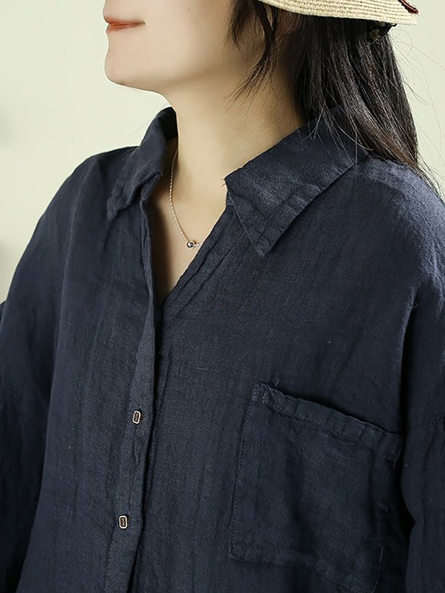 Women Spring Pure Color Turn-down Collar 100%Linen Shirt