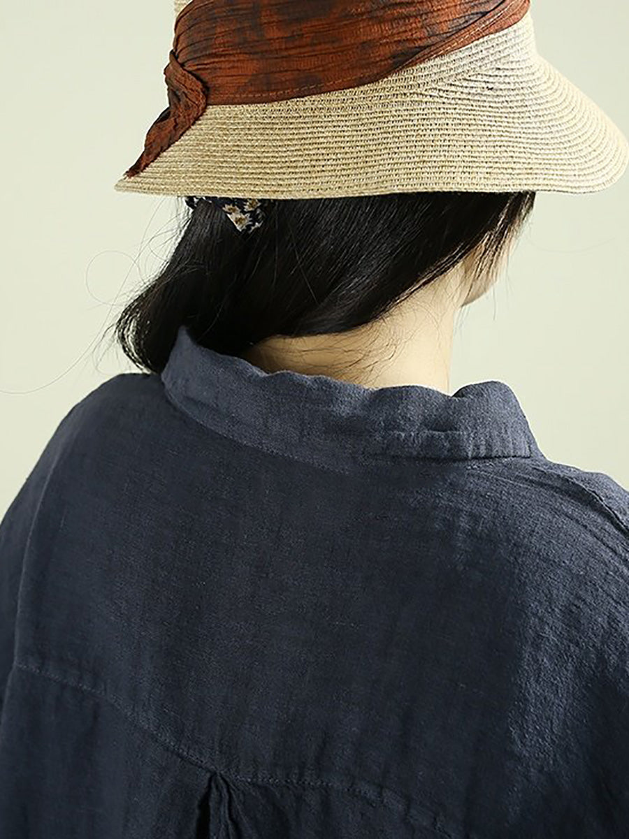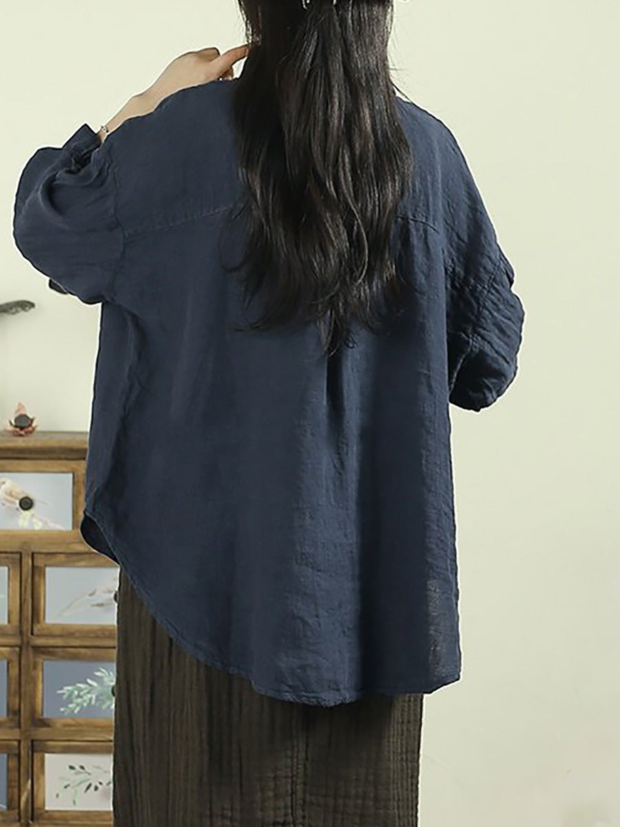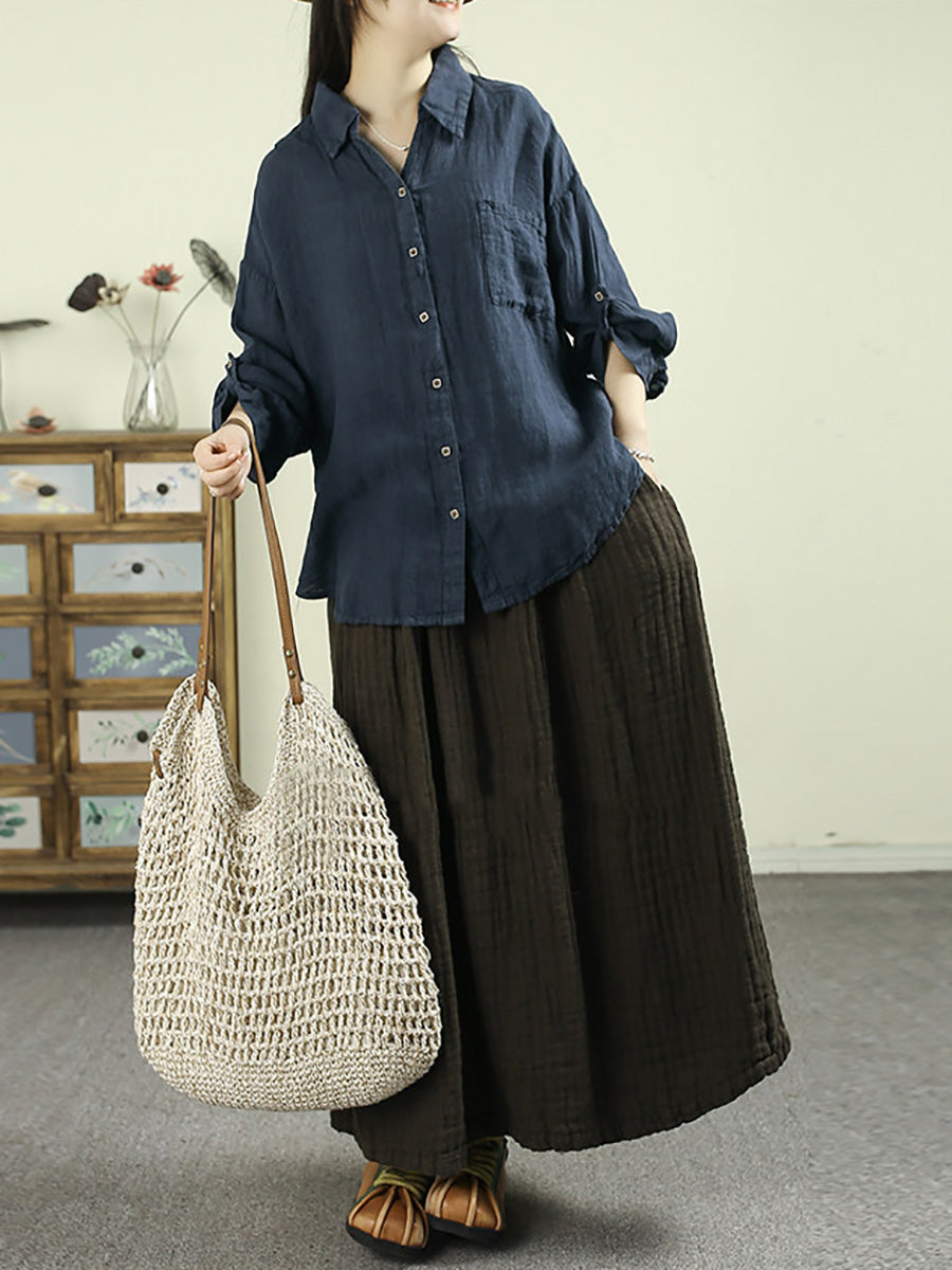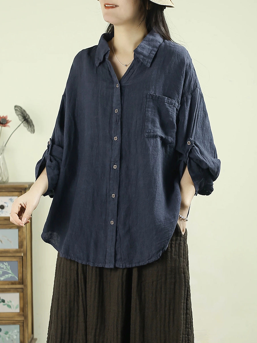Women Spring Pure Color Turn-down Collar 100%Linen Shirt