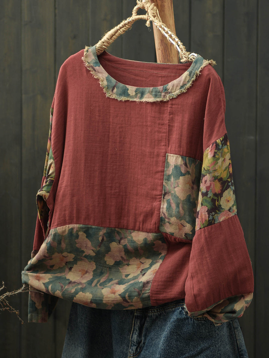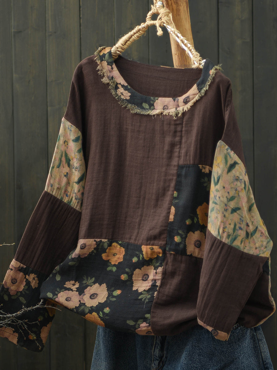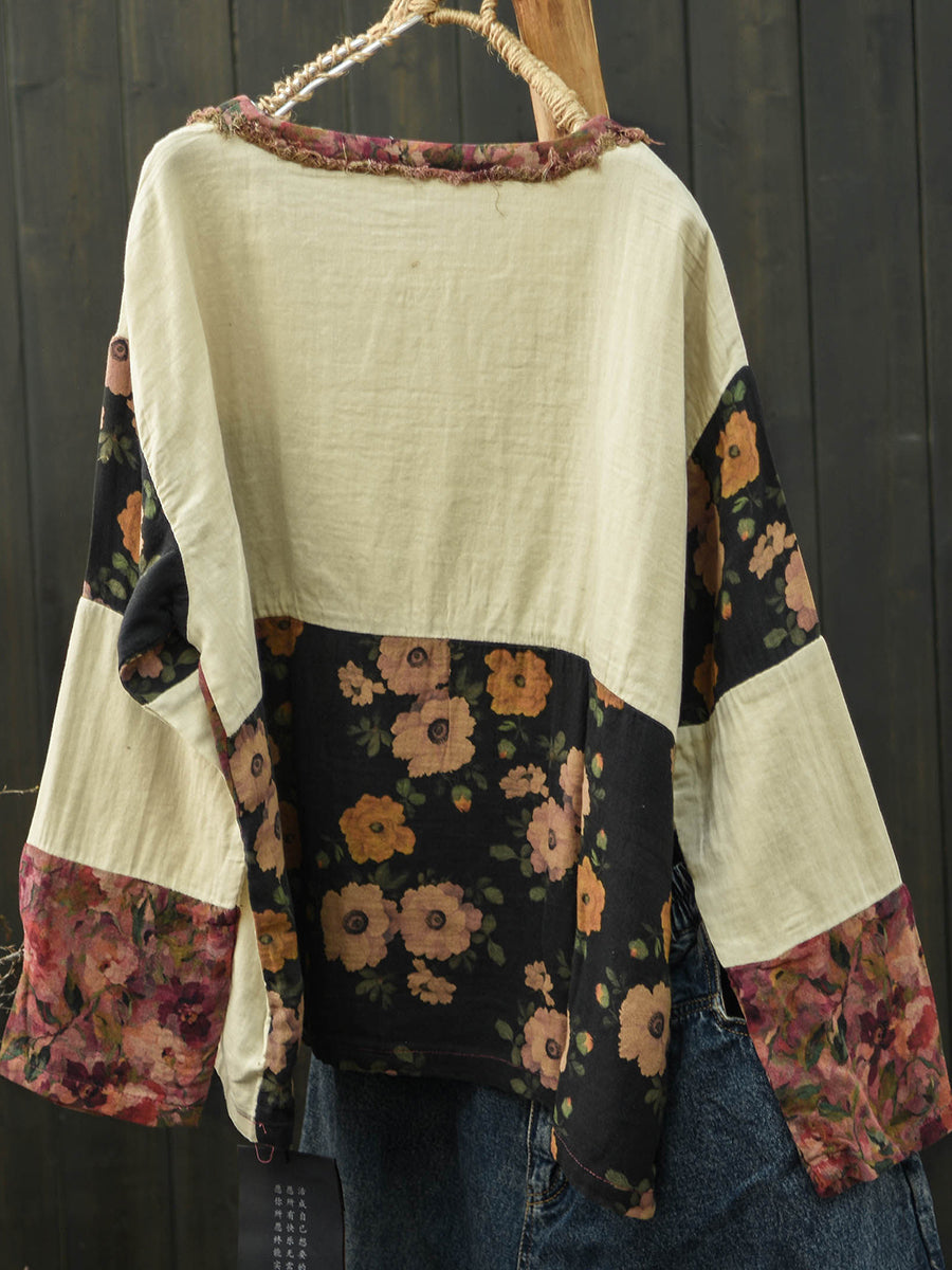 Women Spring Retro Floral Patch Cotton Shirt