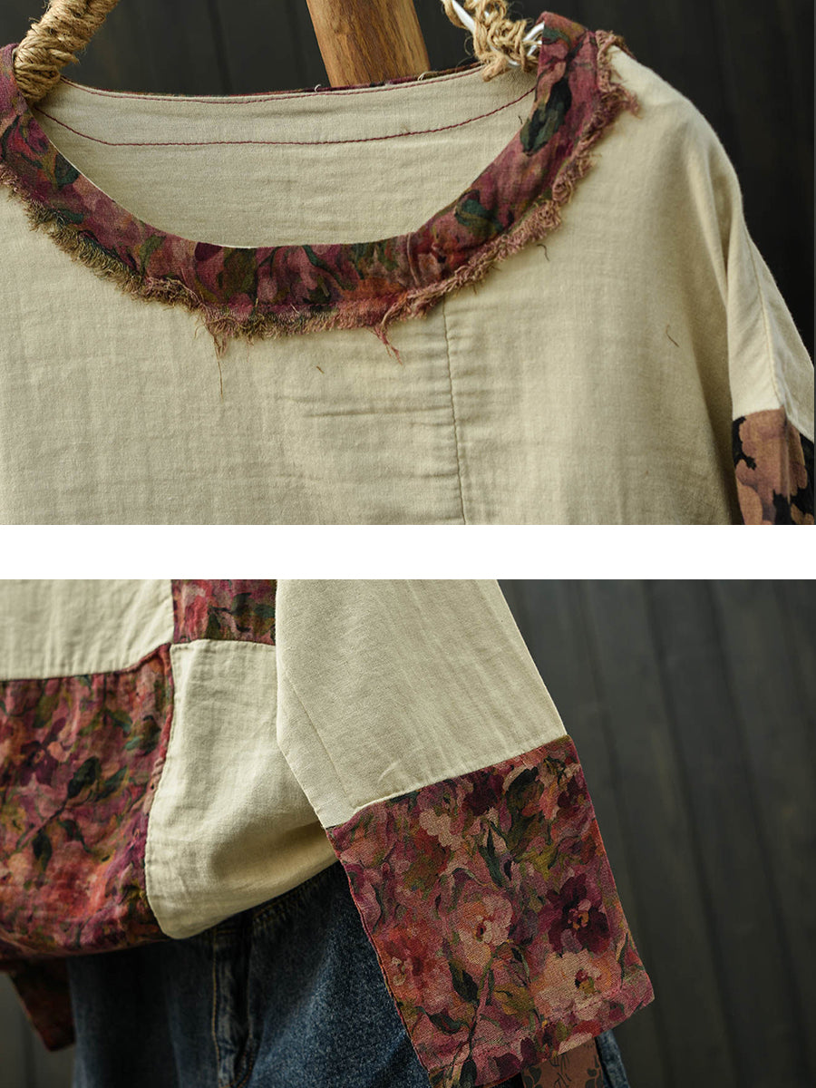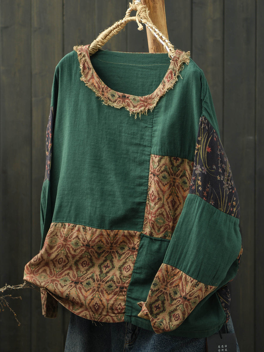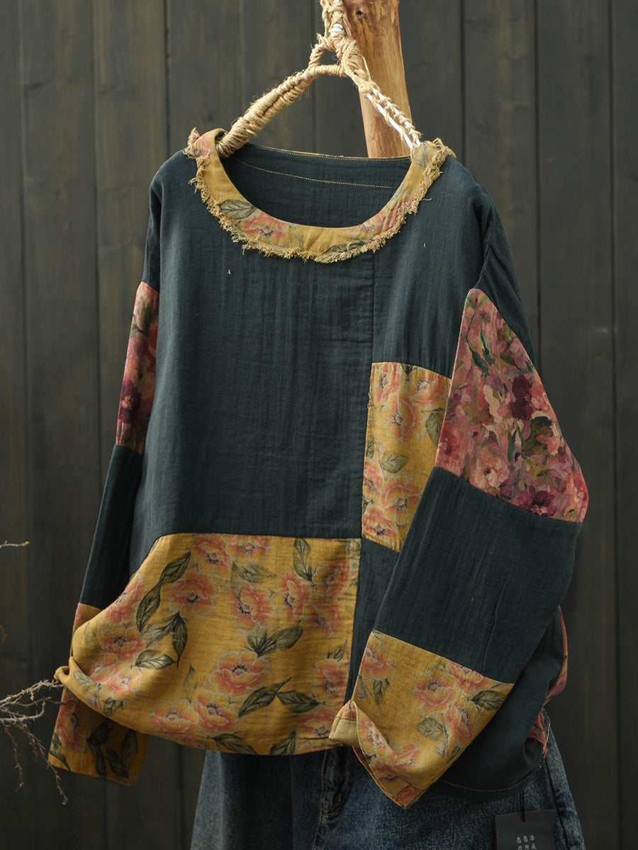 Women Spring Retro Floral Patch Cotton Shirt