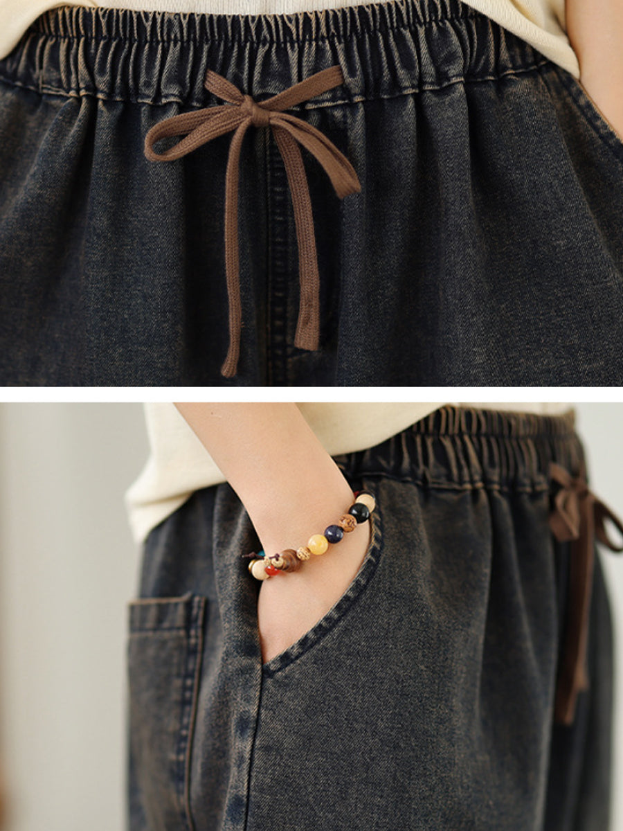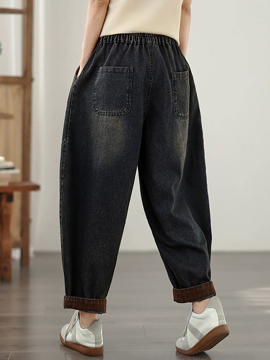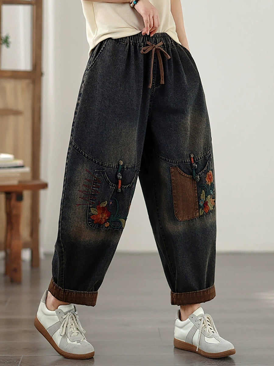 Women Spring Vintage Embroidery Patchwork Denim Harem Pants