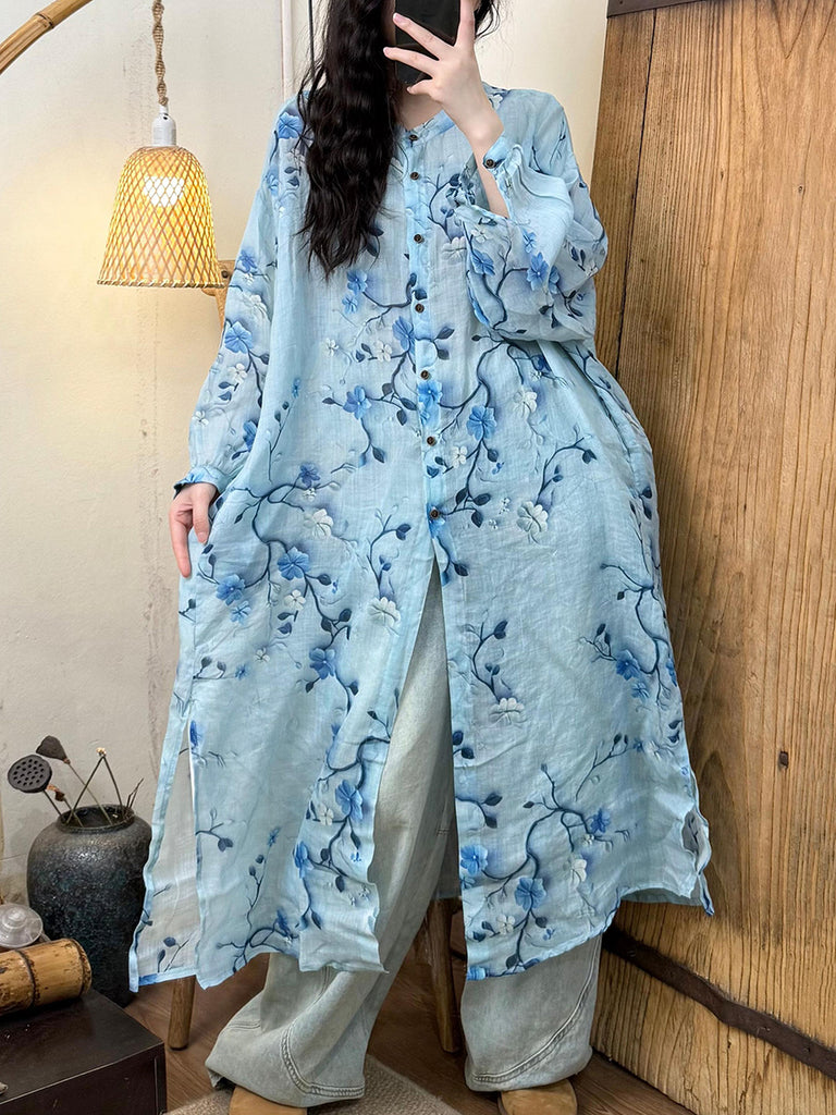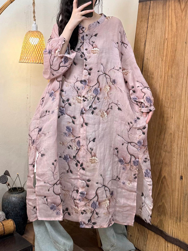 Women Summer Artsy Tie-dye Stand Collar Ramie Dress