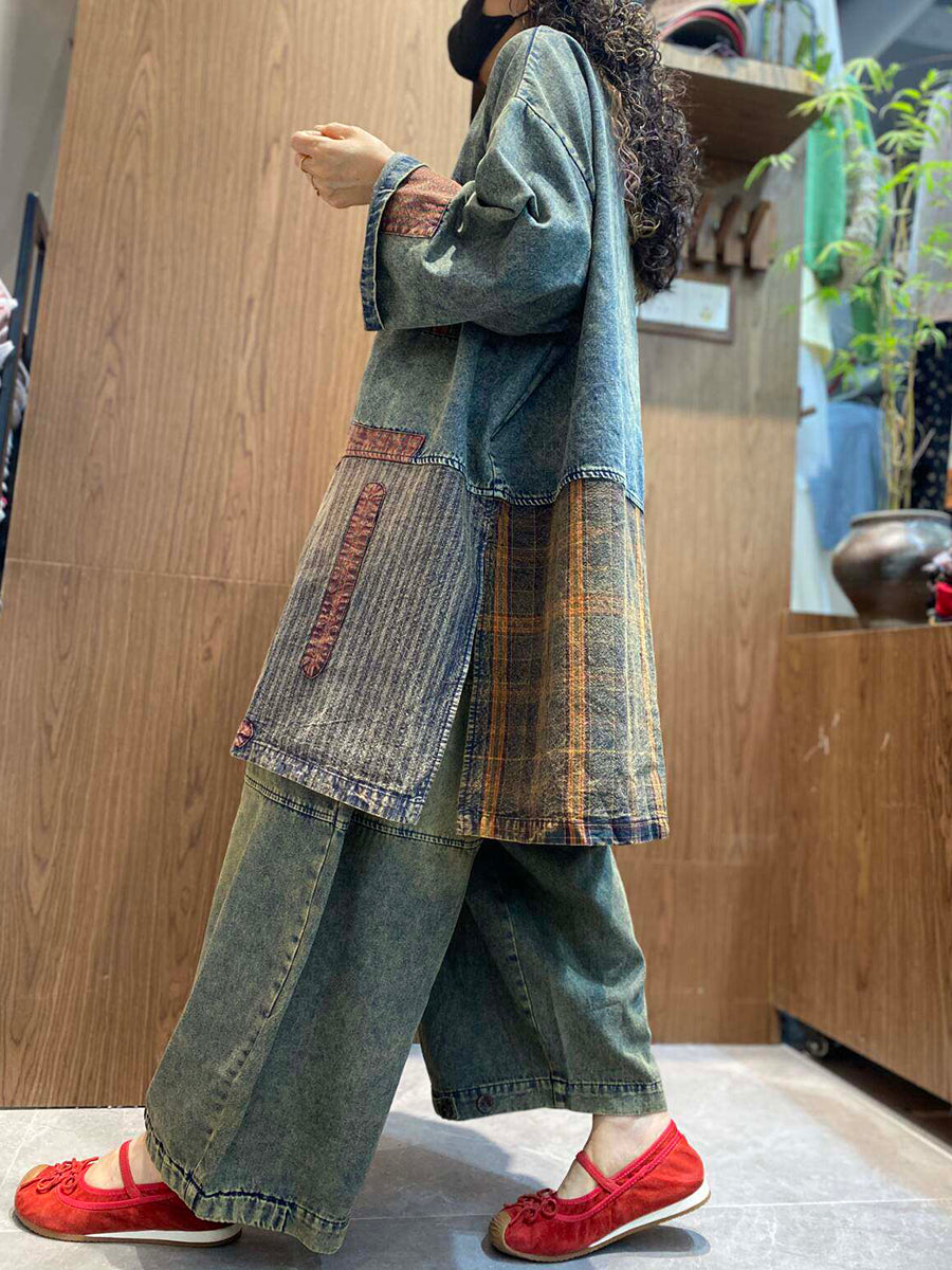 Women Spring Retro Patchwork Denim Blouse