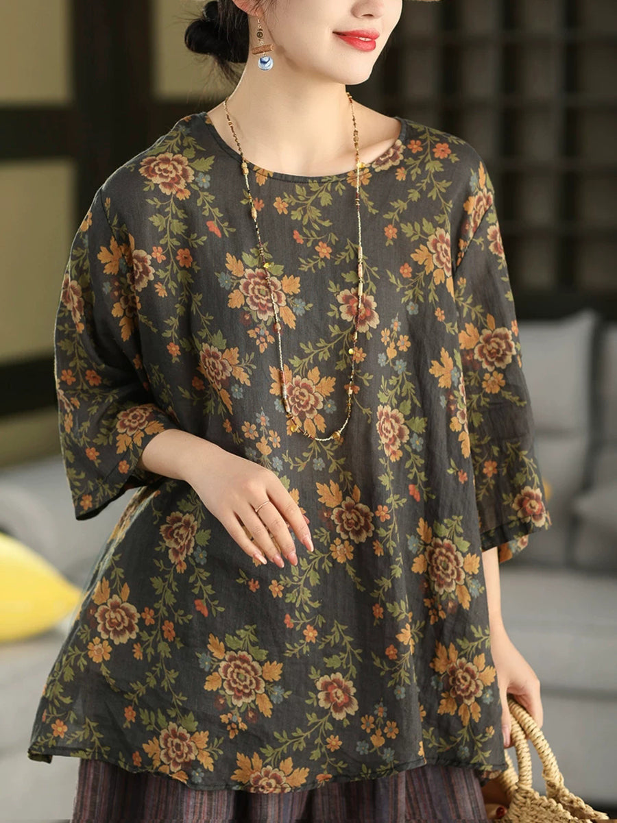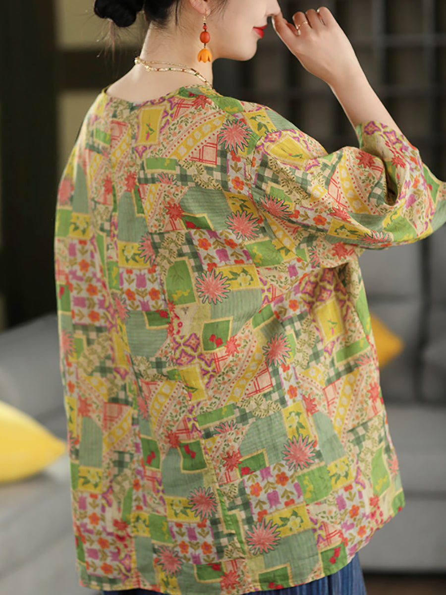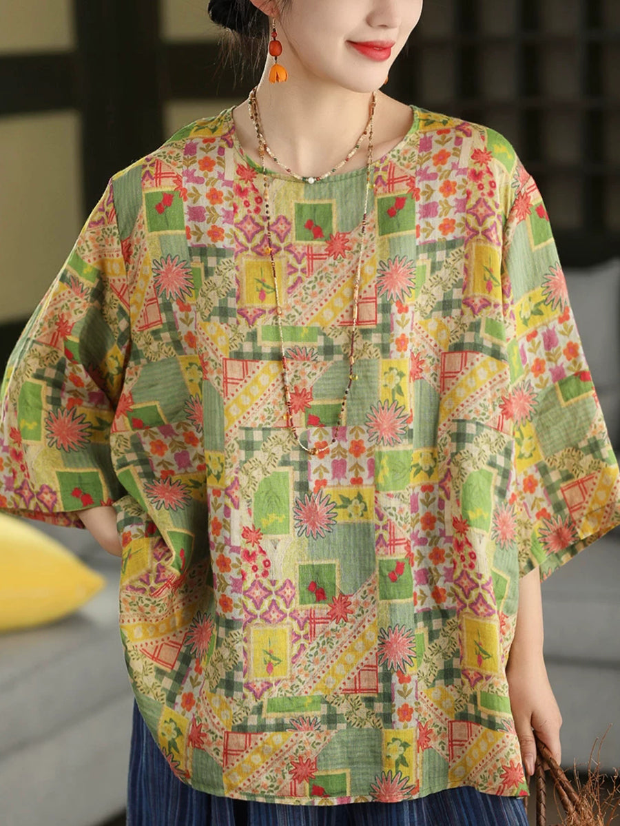 Women Summer Retro Patchwork O-Neck 100%Ramie Blouse