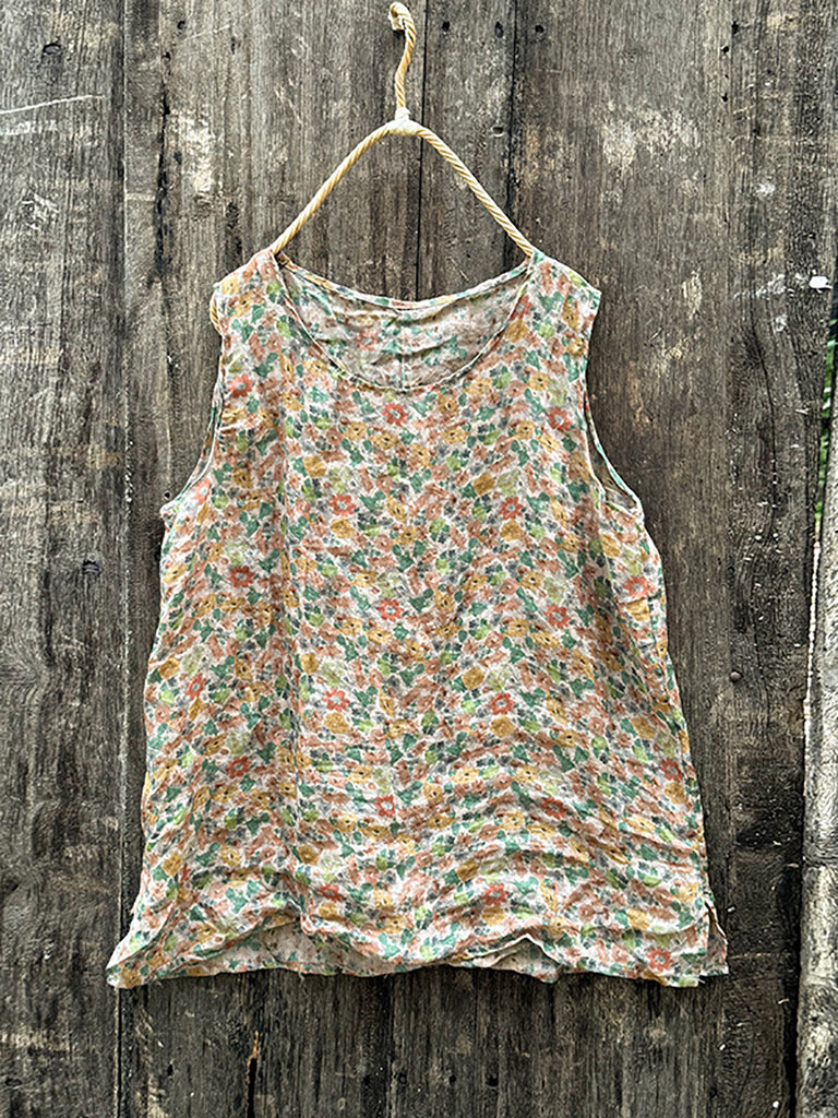 Women Summer Vintage Floral O-Neck Ramie Vest