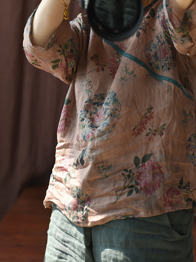 Women Summer Vintage Floral V-Neck Ramie Shirt