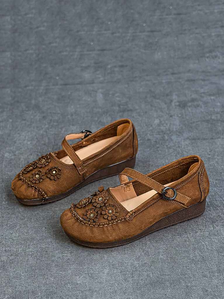 Women Summer Vintage Flower Leather Low Heel Shoes