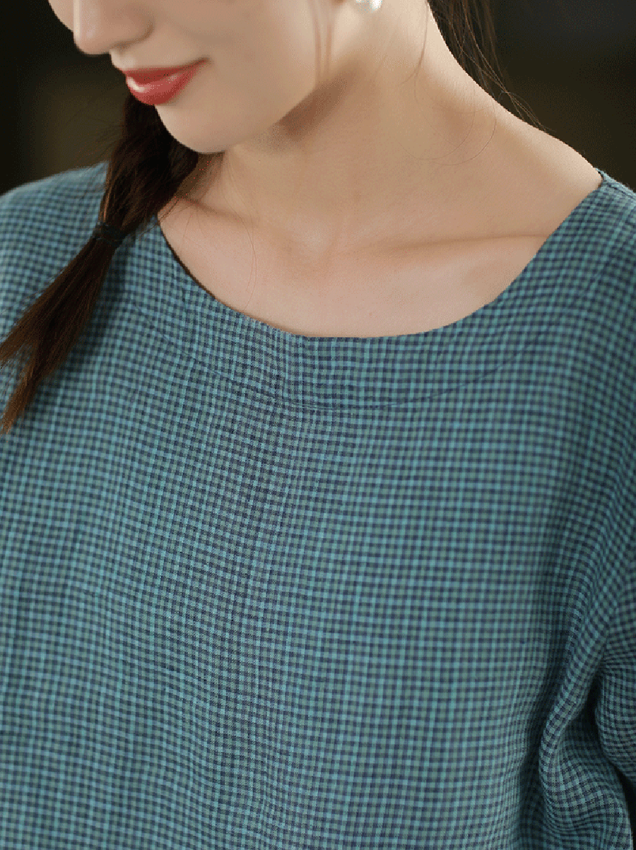 Women Summer Vintage Plaid O-Neck 100%Linen Dress