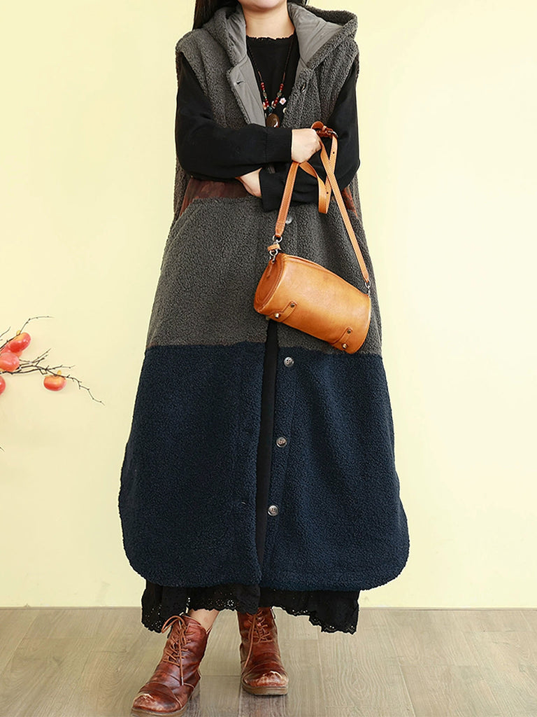 Women Winter Fleece Colorblock Hooded Padded Vest Coat