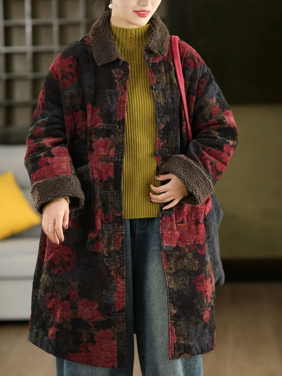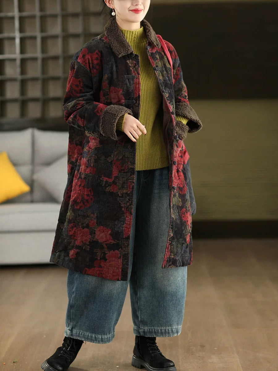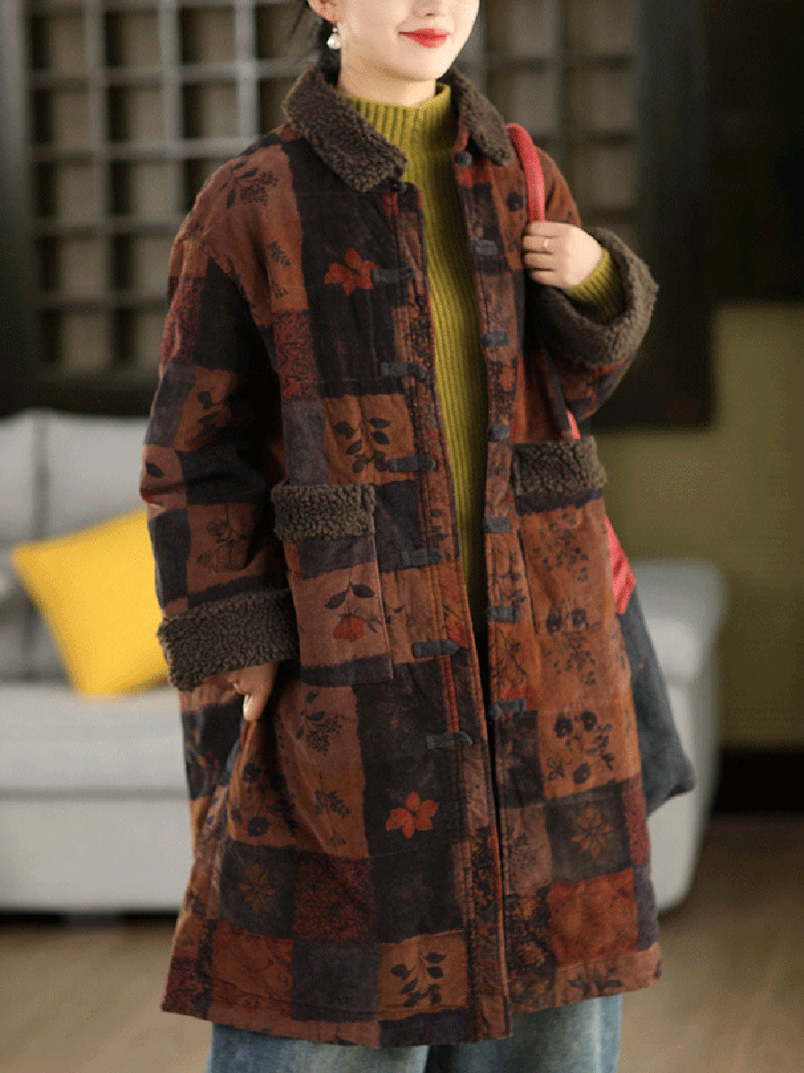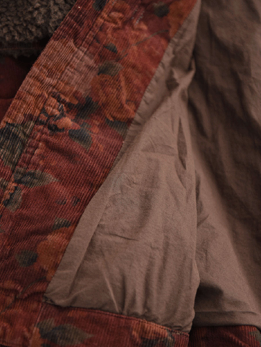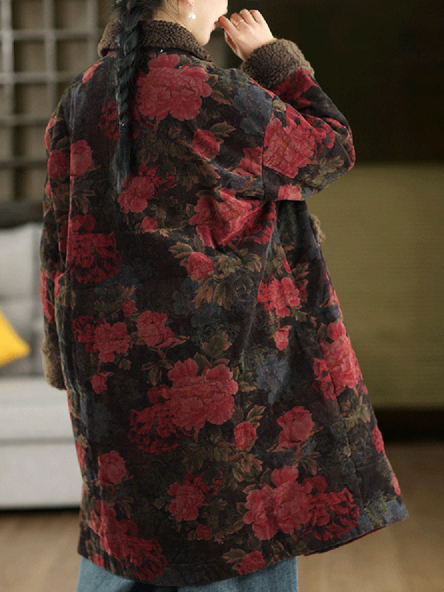 Women Winter Retro Flower Fleece Spliced Corduroy Coat