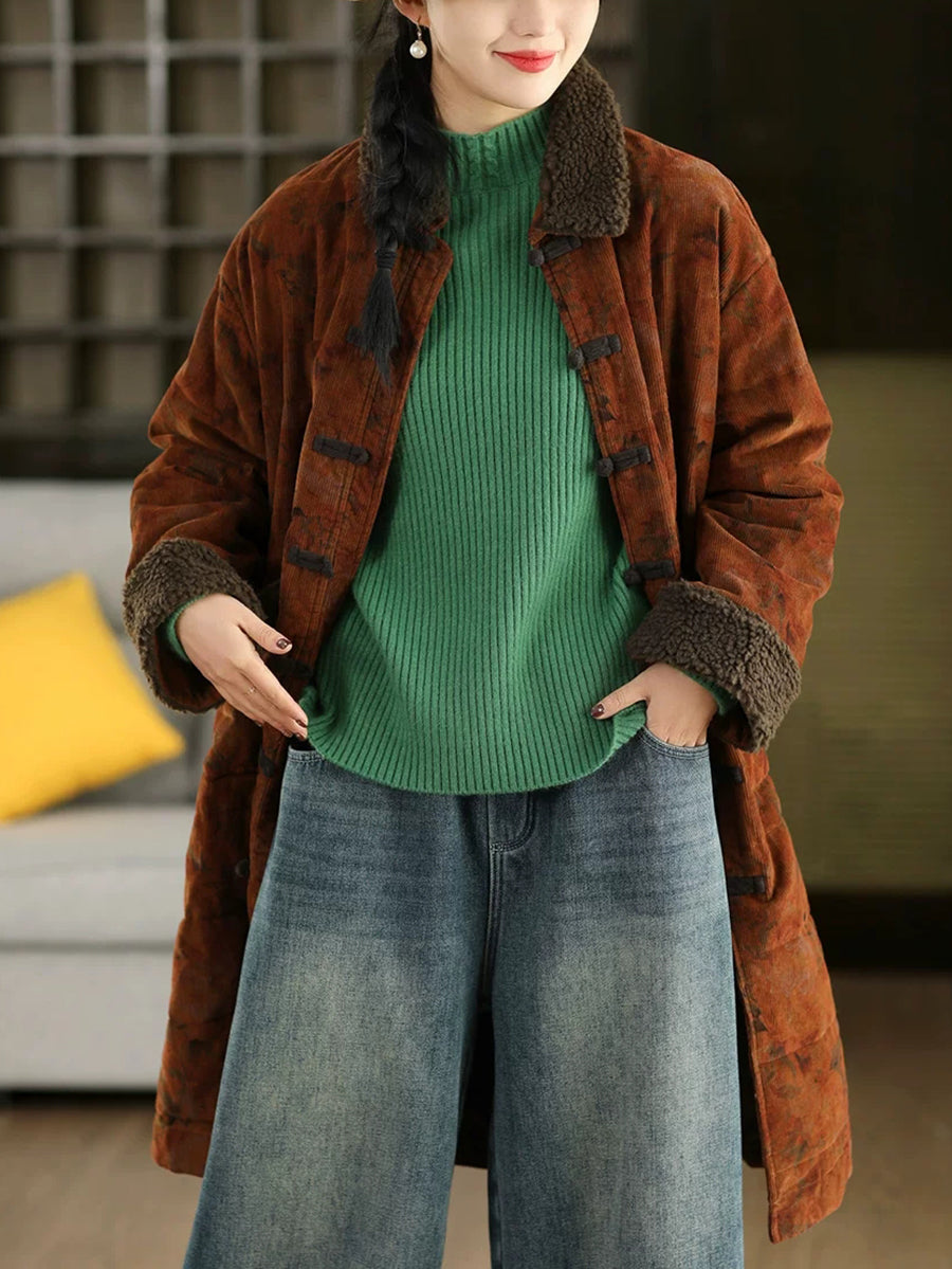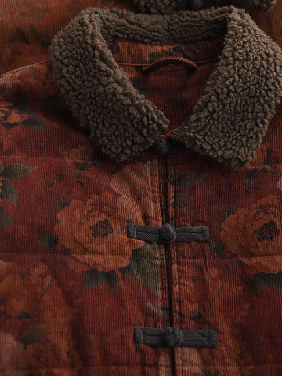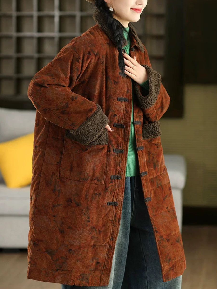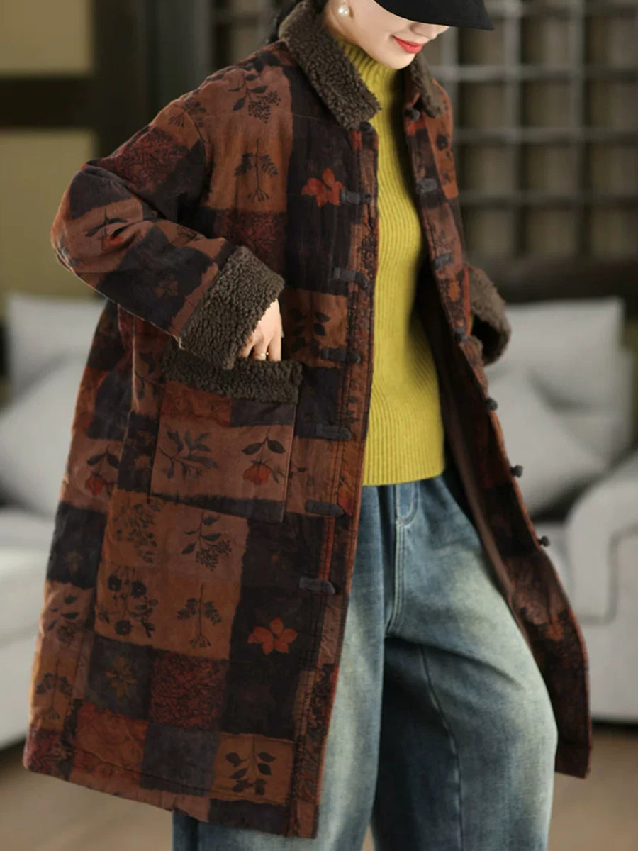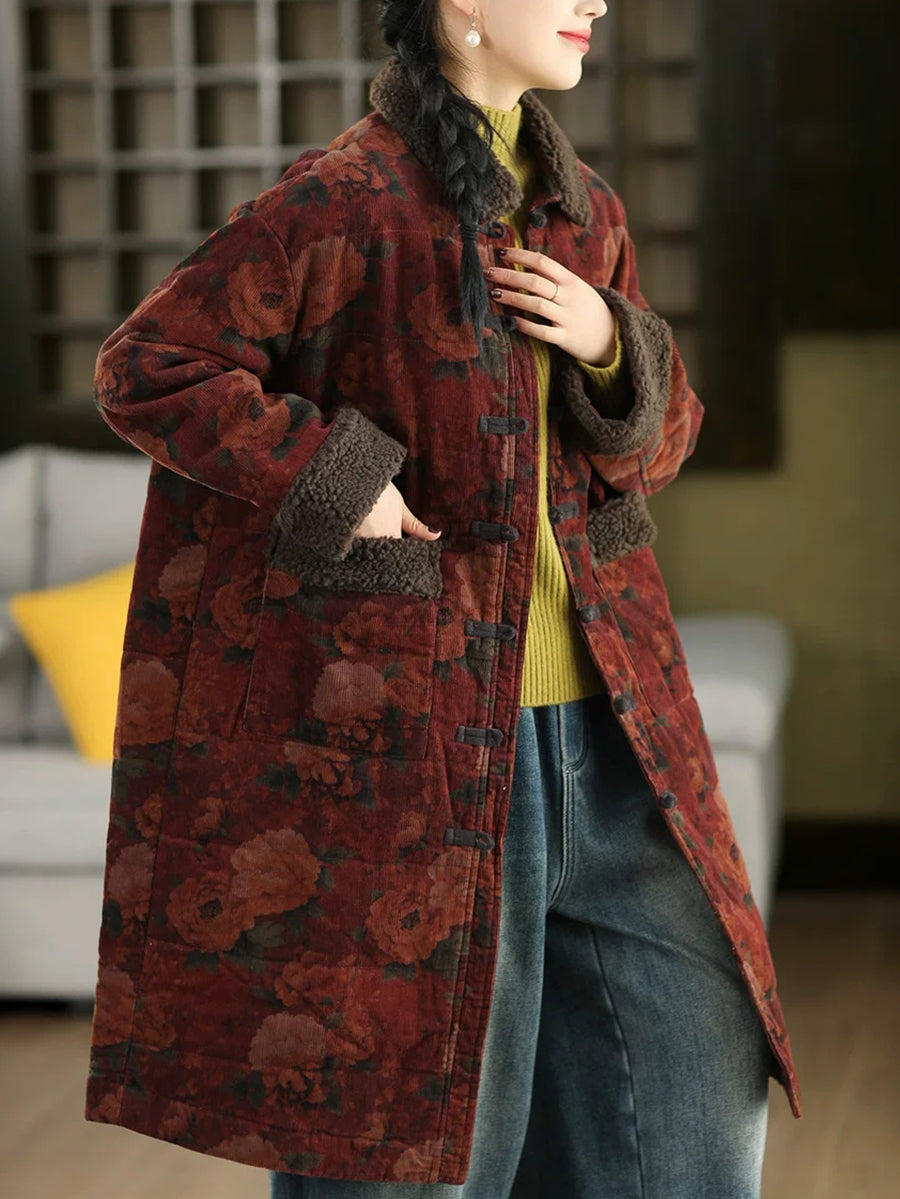 Women Winter Retro Flower Fleece Spliced Corduroy Coat