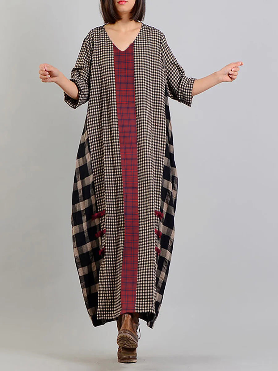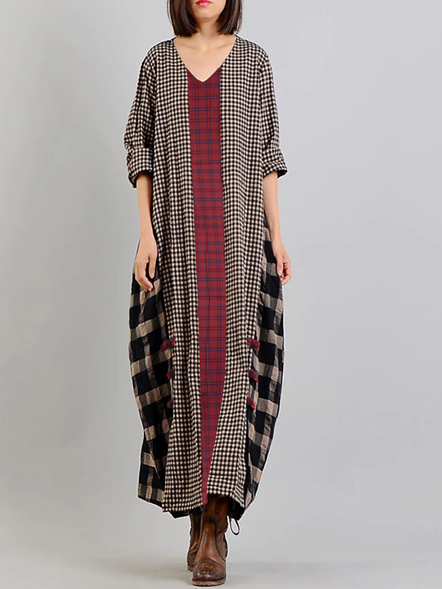 שמלת פשתן רטרו כותנה משובצת בצבעים שונים