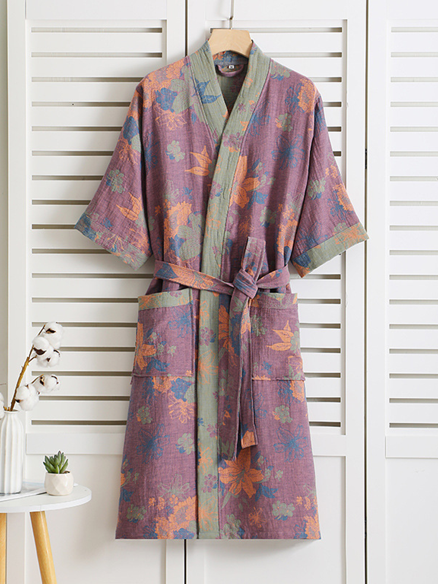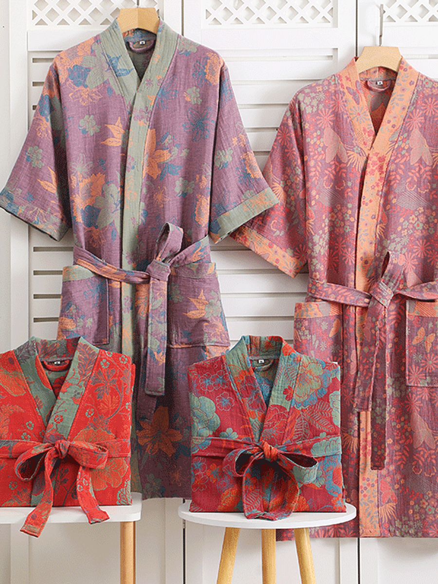 חלוק קל משקל ונושם זה, העשוי מ-100% כותנה טהורה גזה דו-שכבתית, כולל גזרה רפויה ודוגמא פרחונית אלגנטית. עם חגורה מתכווננת ואורך ארוך, הוא מציע נוחות וסגנון להרפיה שלכם.