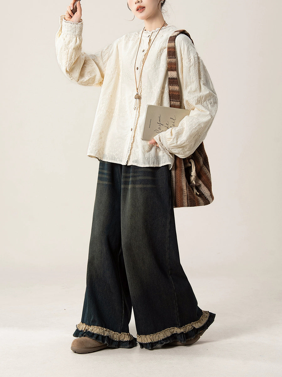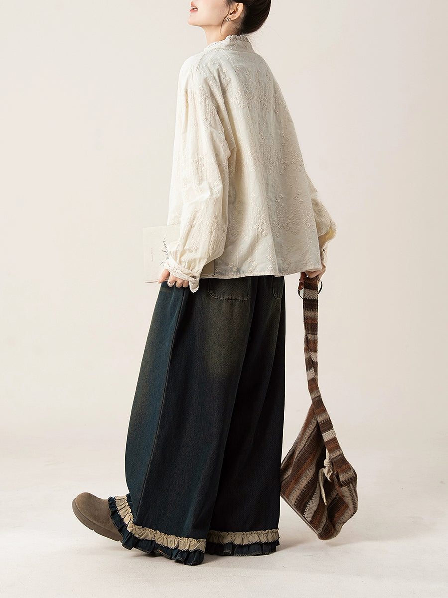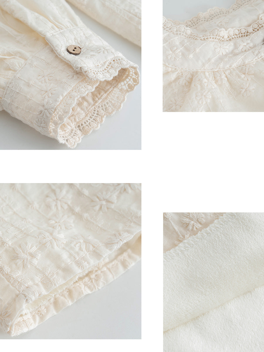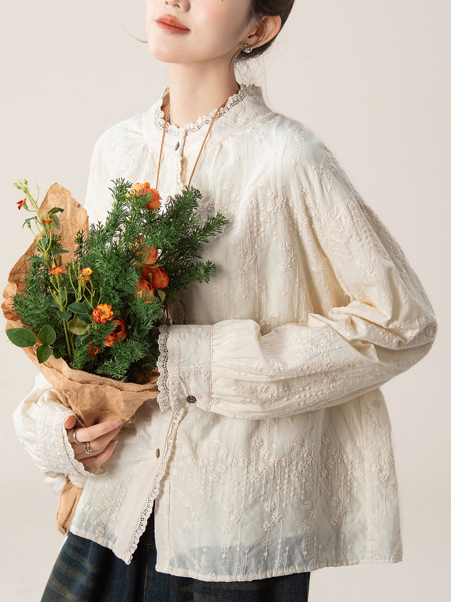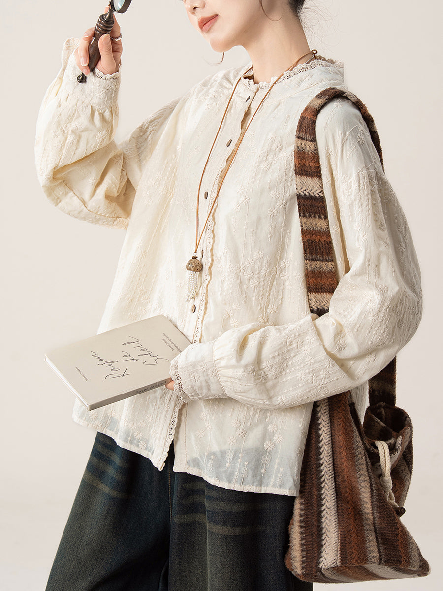 חולצת צווארון תחרה רקמה עם רקמה אומנותית לסתיו לנשים