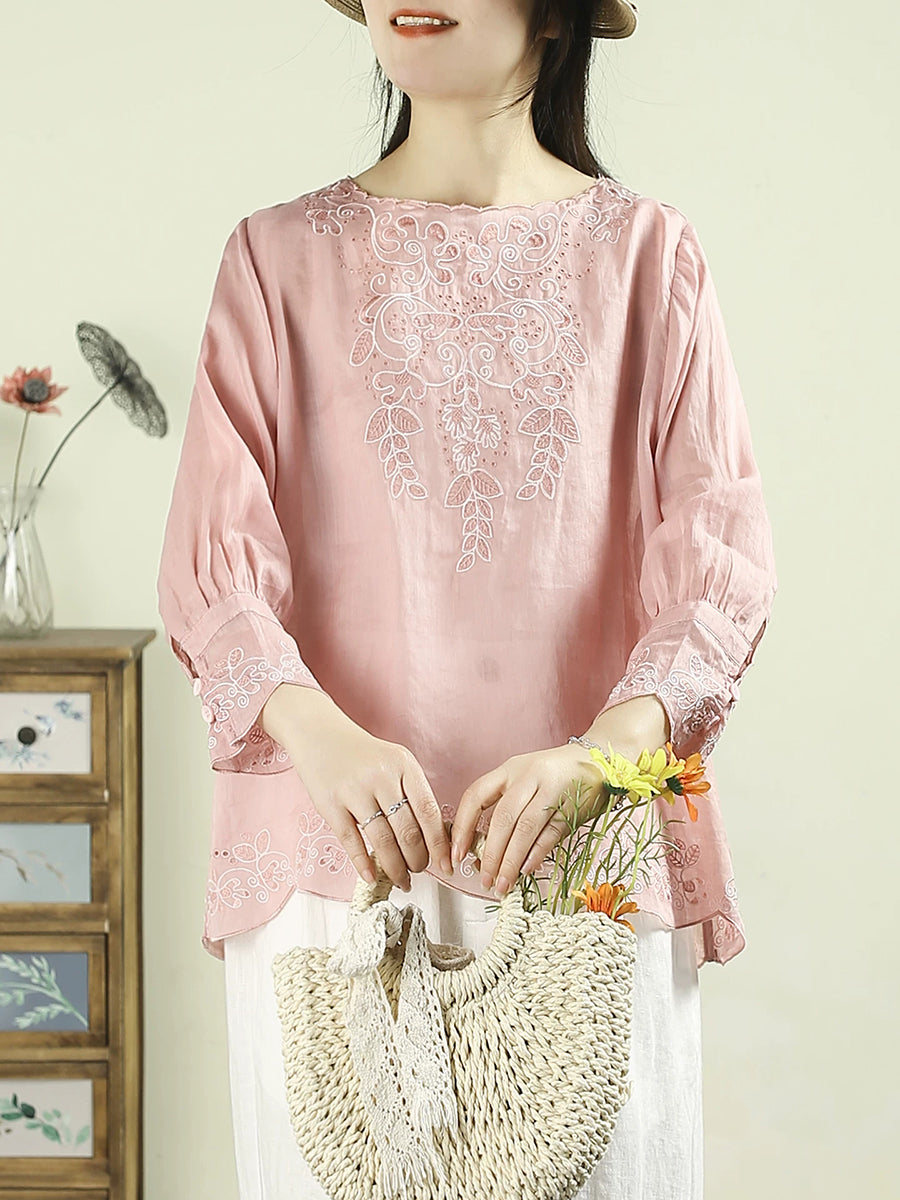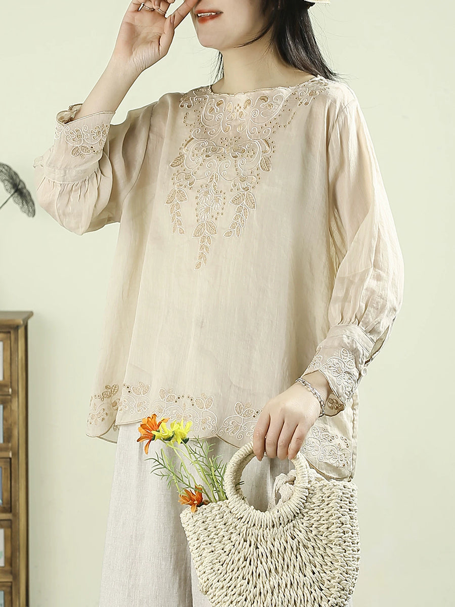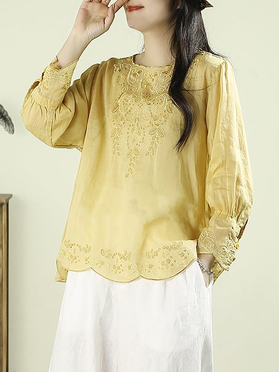 חולצת אביב אומנותית לנשים עם רקמה וצווארון O 100% רמי