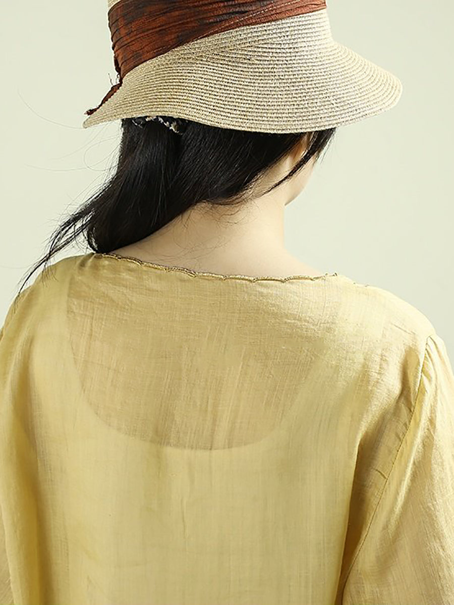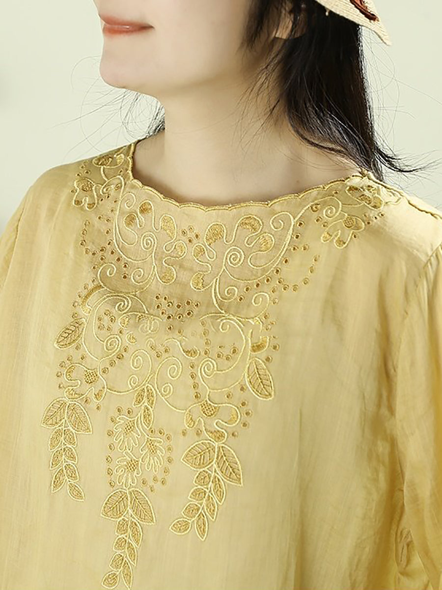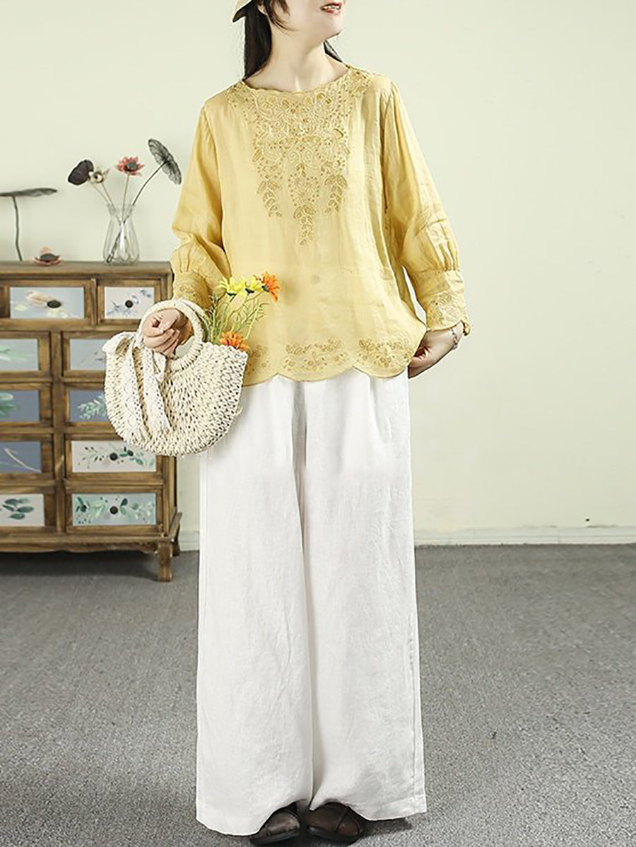 חולצת אביב אומנותית לנשים עם רקמה וצווארון O 100% רמי