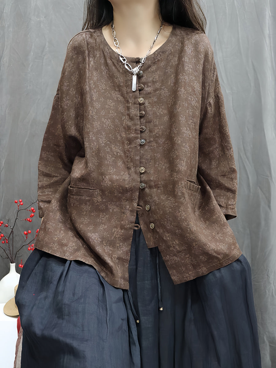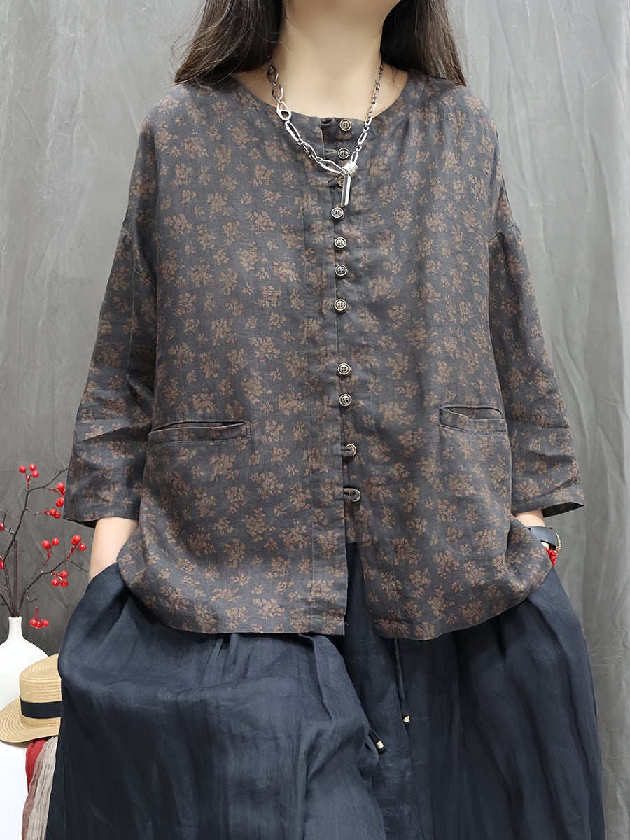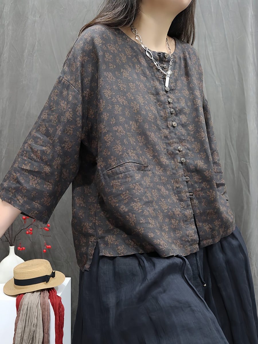 חולצת O-צוואר פרחונית אביבית לנשים מ-100% פשתן