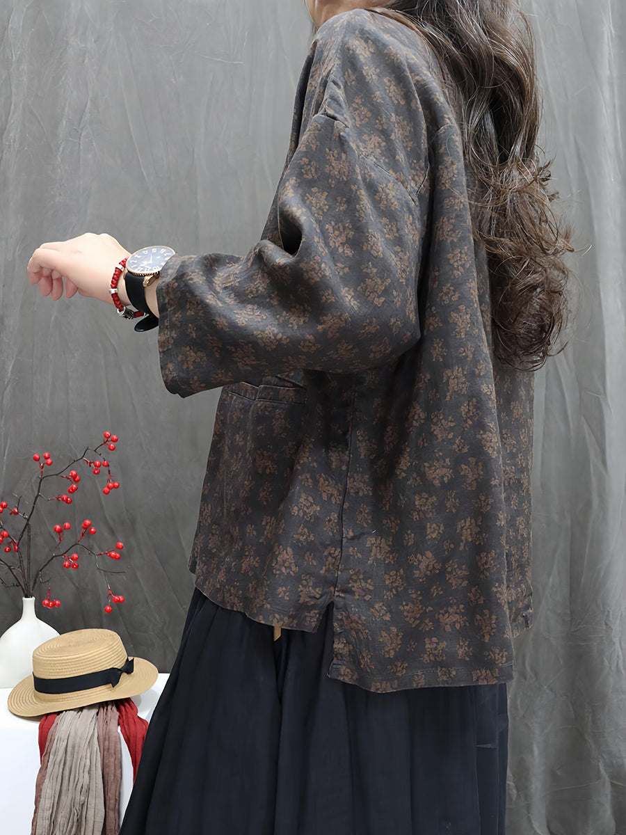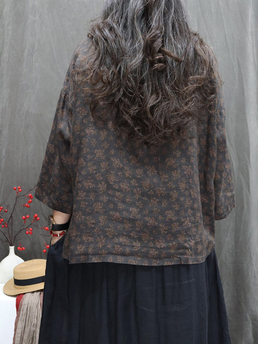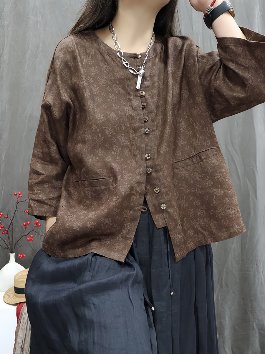 חולצת O-צוואר פרחונית אביבית לנשים מ-100% פשתן