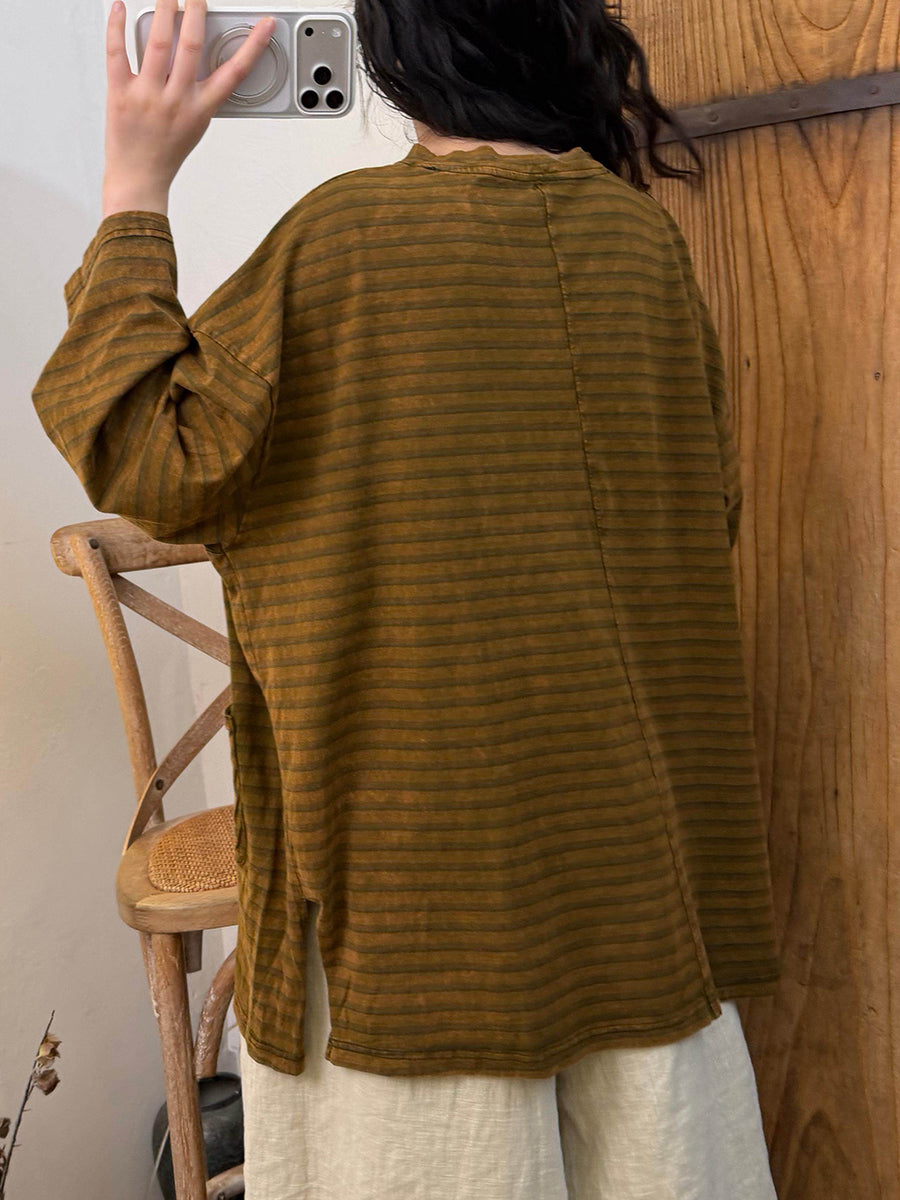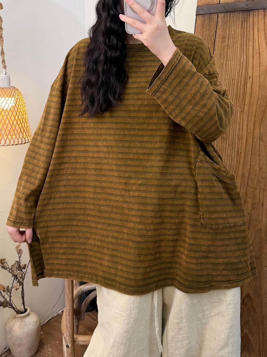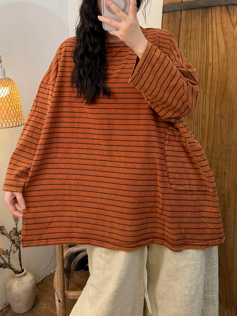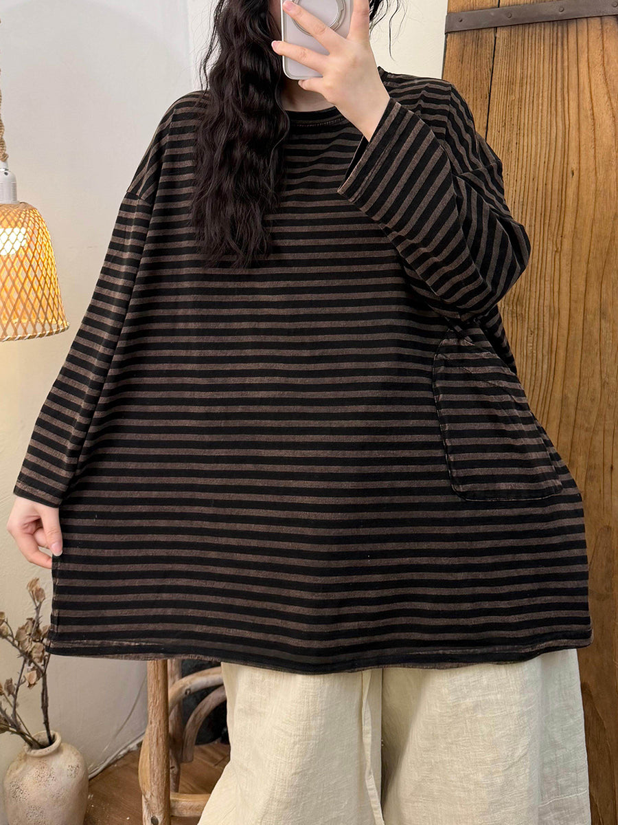 חולצת O-צוואר כותנה עם פסים באביב לנשים