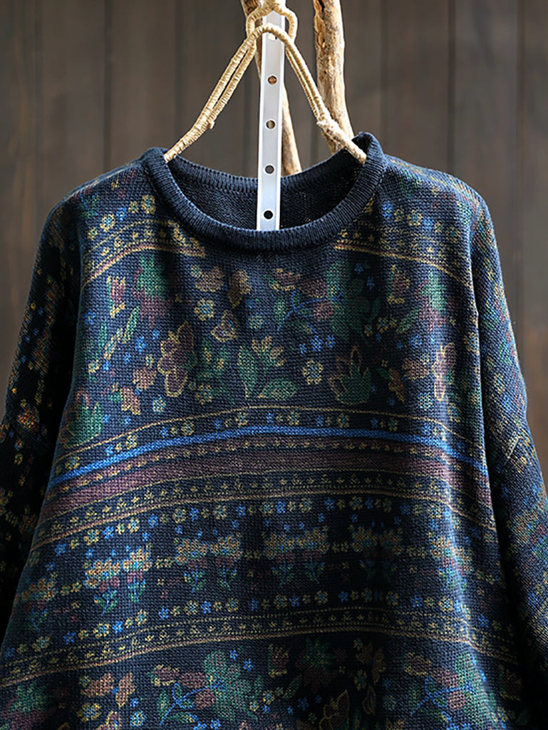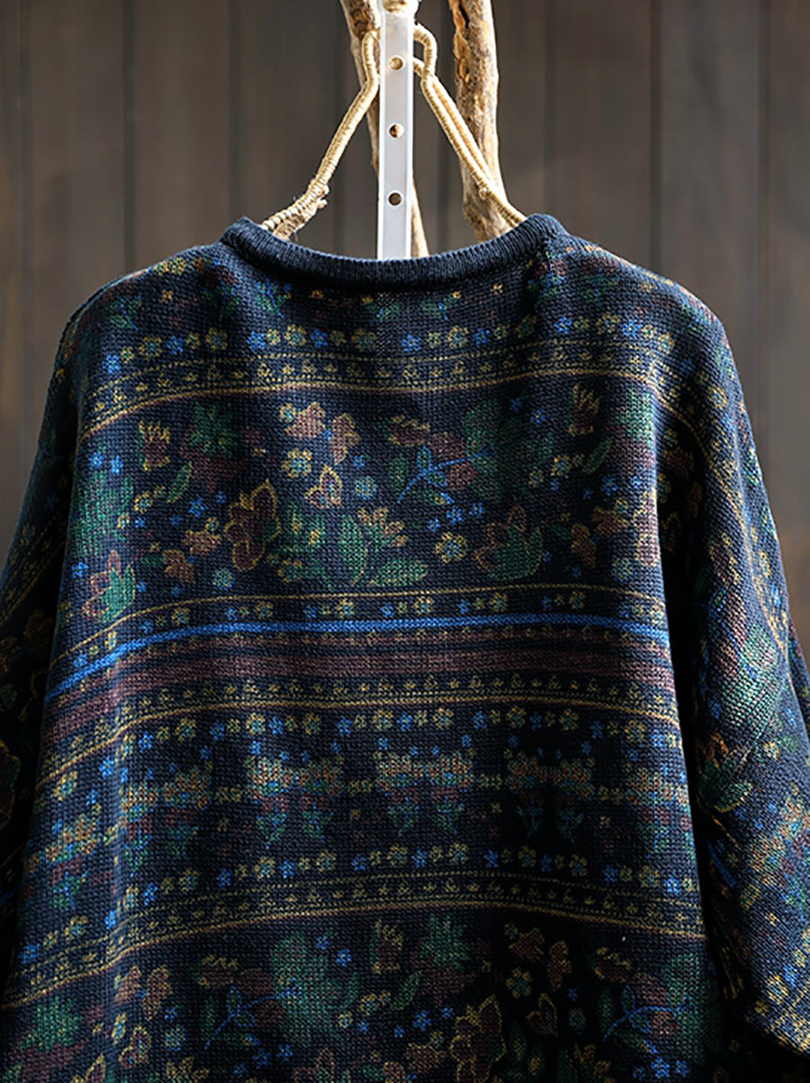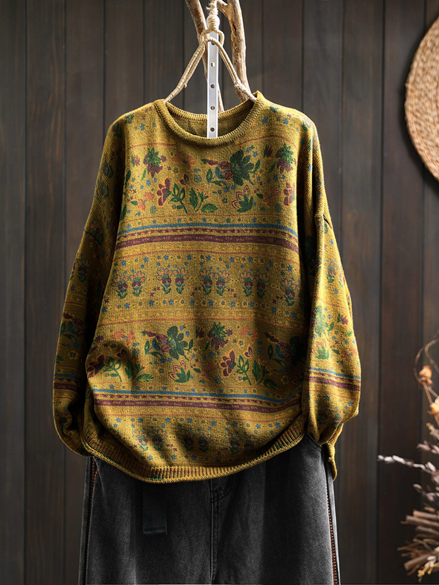 סוודר סרוג פרחוני עם צווארון O וצווארון פרחוני לנשים בסתיו