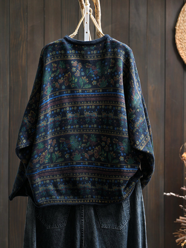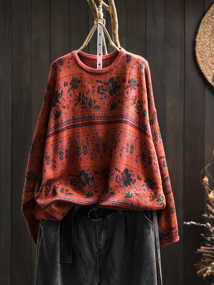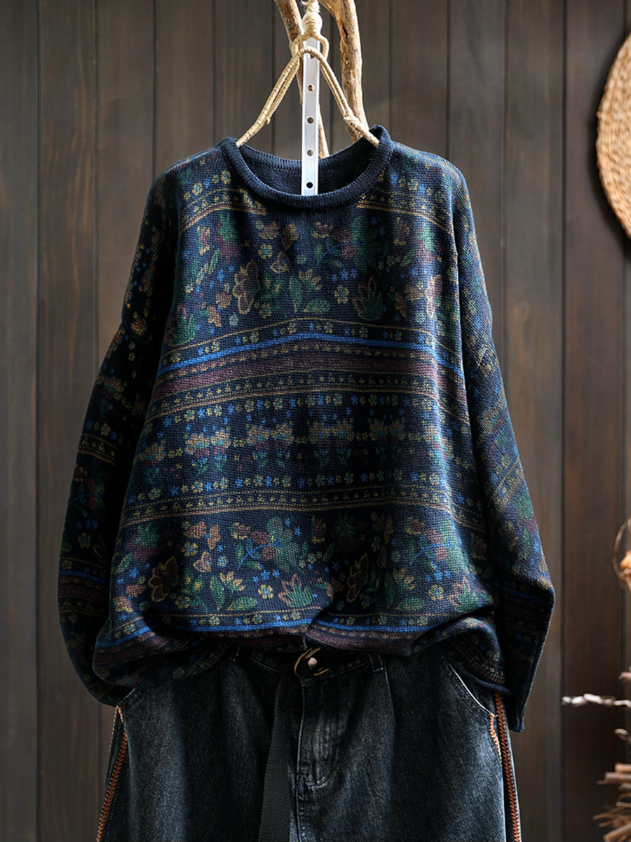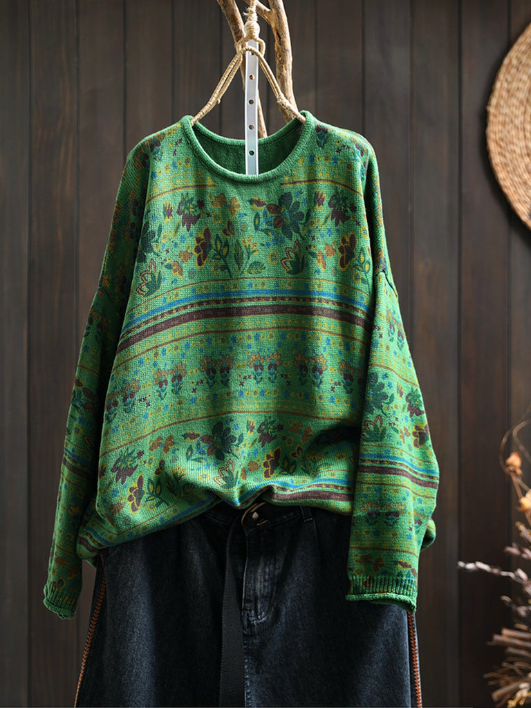 סוודר סרוג פרחוני עם צווארון O וצווארון פרחוני לנשים בסתיו