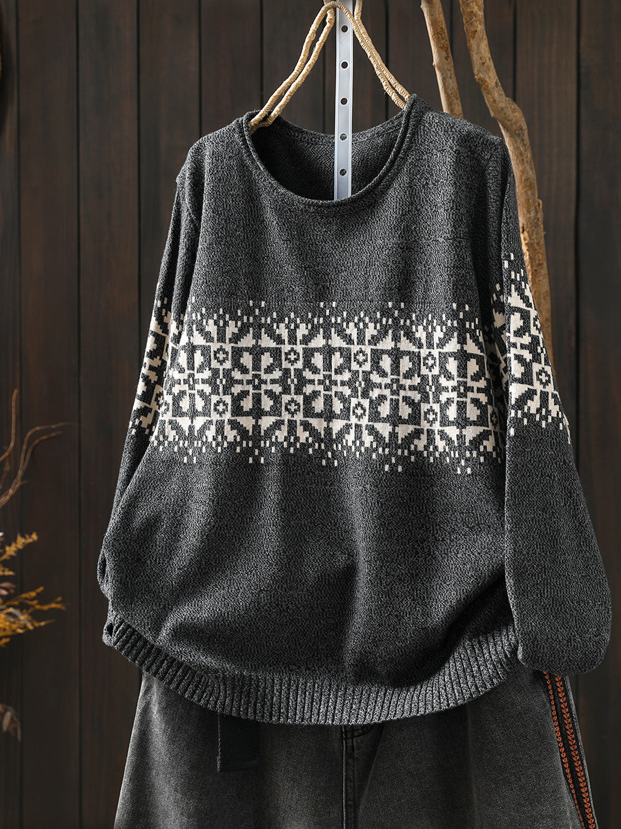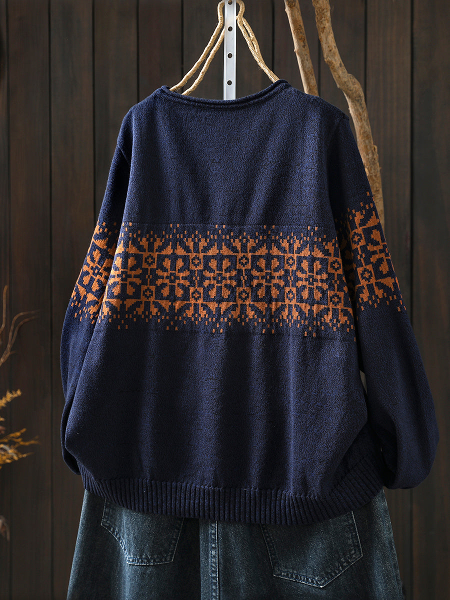 סוודר סרוג פרחוני עם צווארון O וצווארון פרחוני לנשים בסתיו