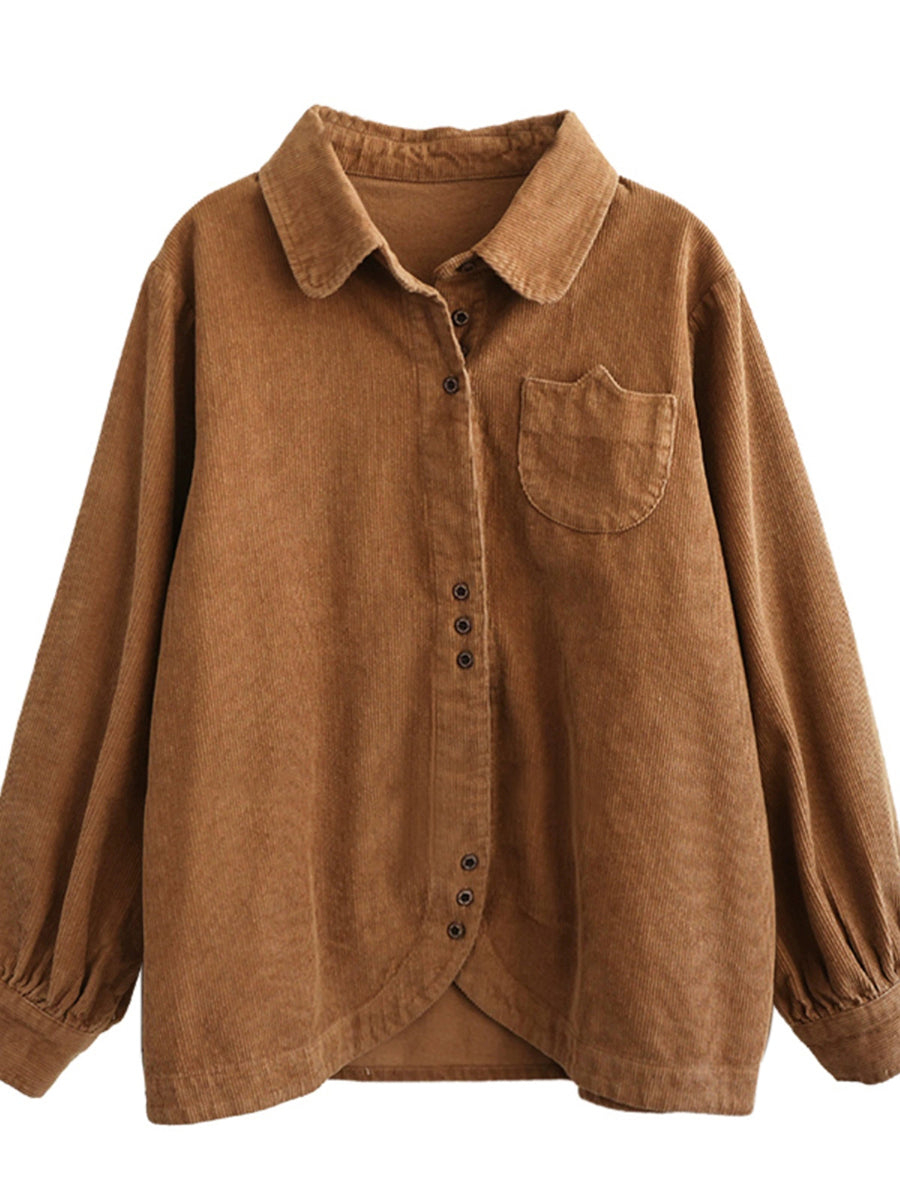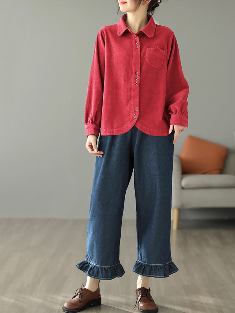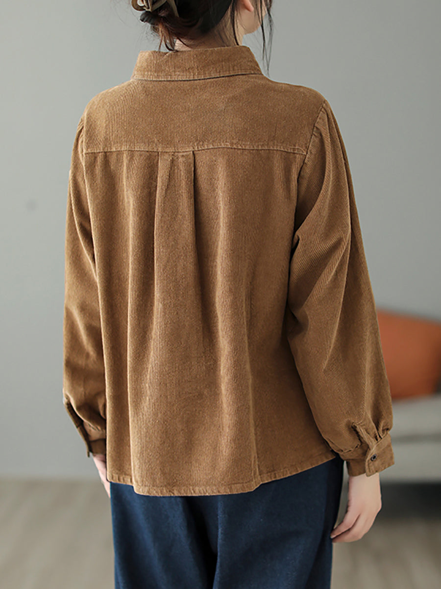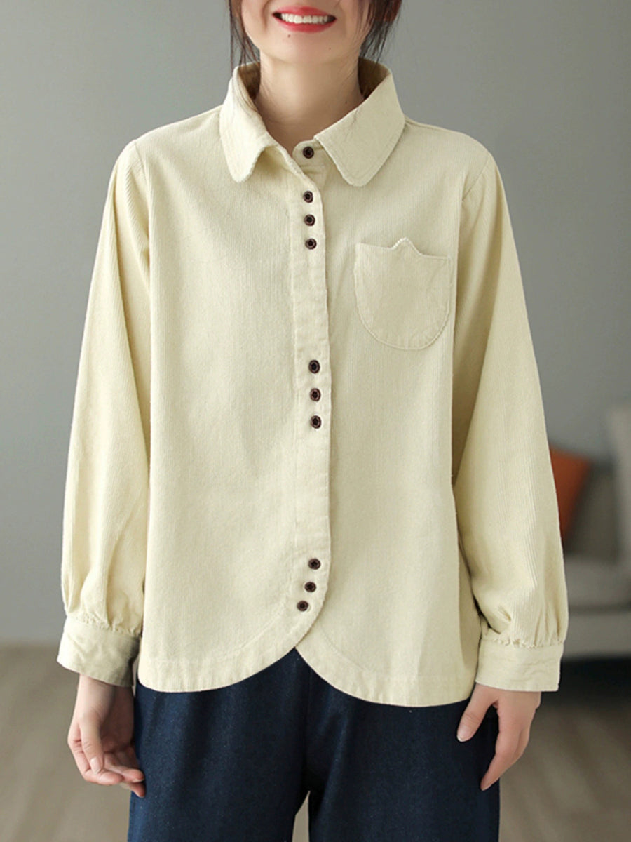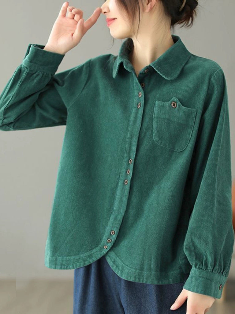 חולצת קורדרוי בצבע טהור לנשים בסתיו עם צווארון מתקפל