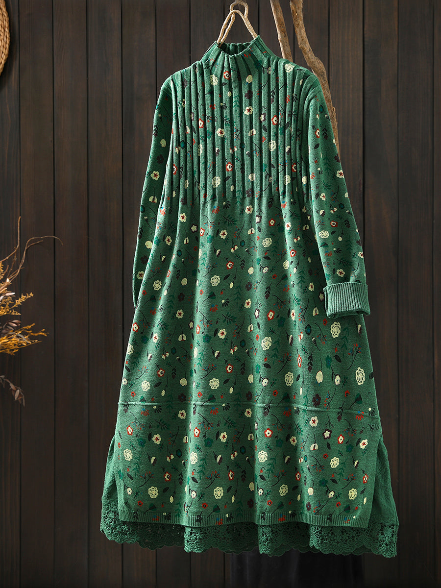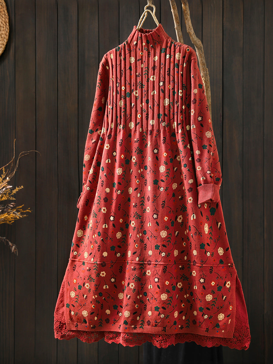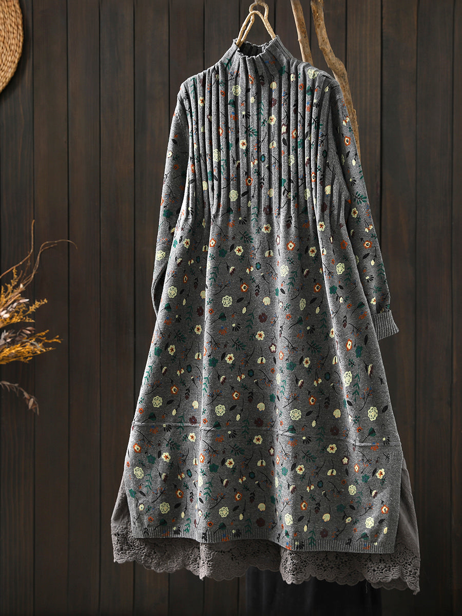 שמלת סרוגה פרחונית וינטג' לנשים בסגנון סתיו עם צווארון גולף