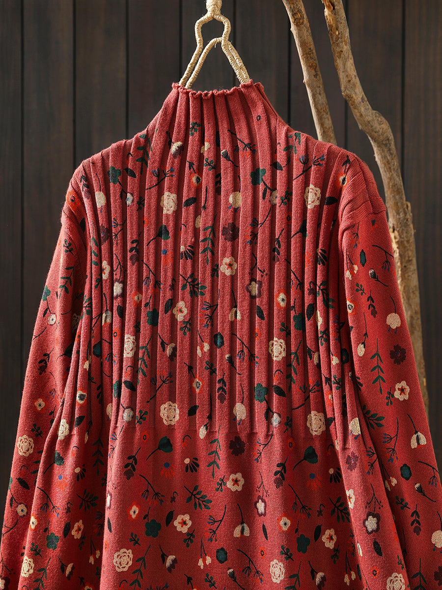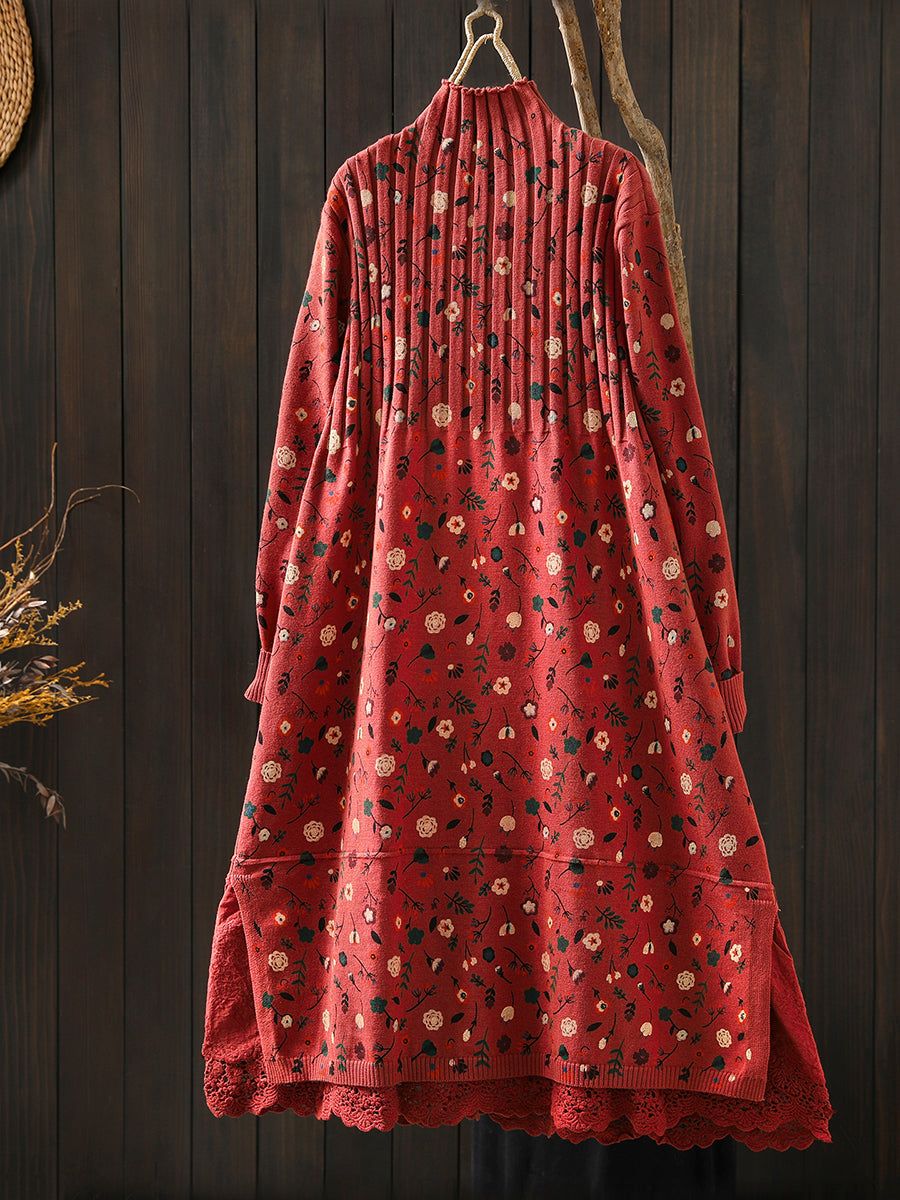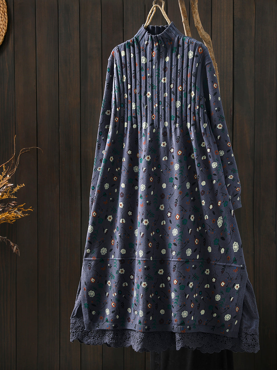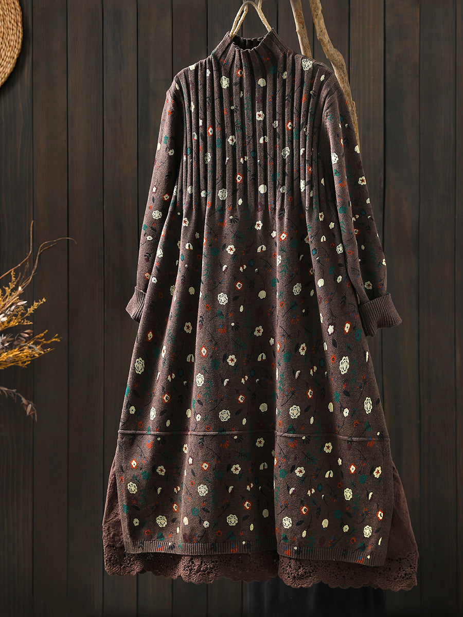 שמלת סרוגה פרחונית וינטג' לנשים בסגנון סתיו עם צווארון גולף