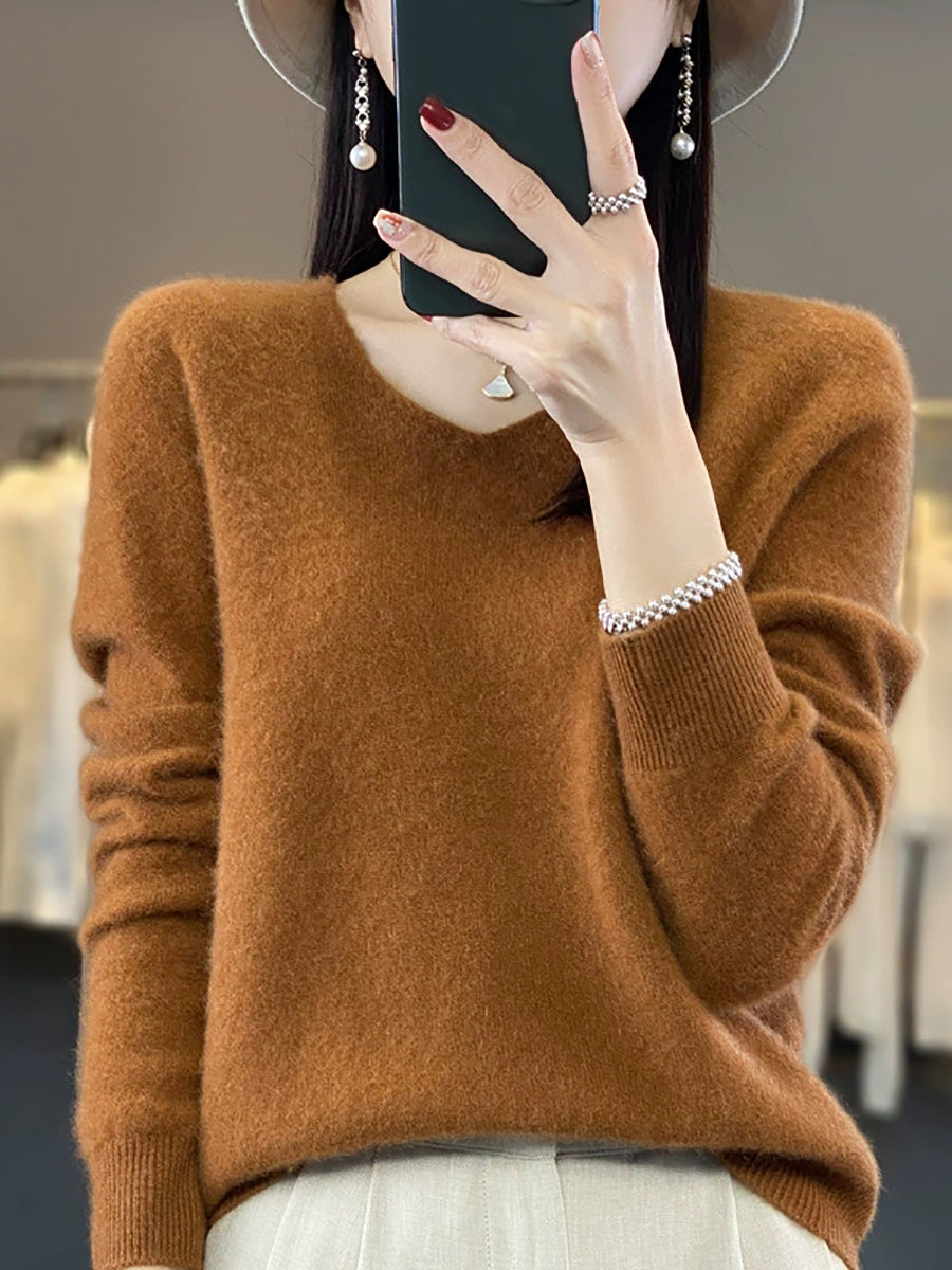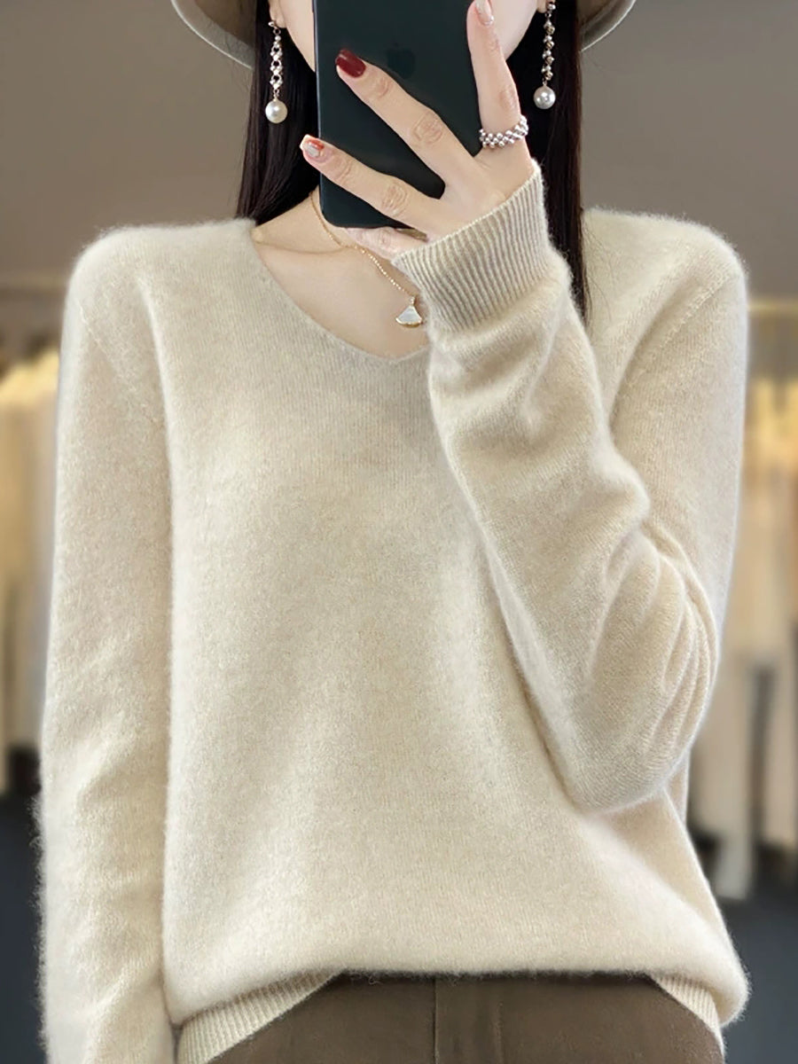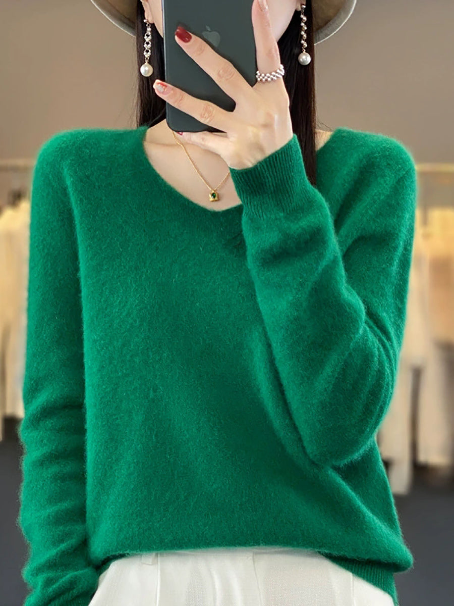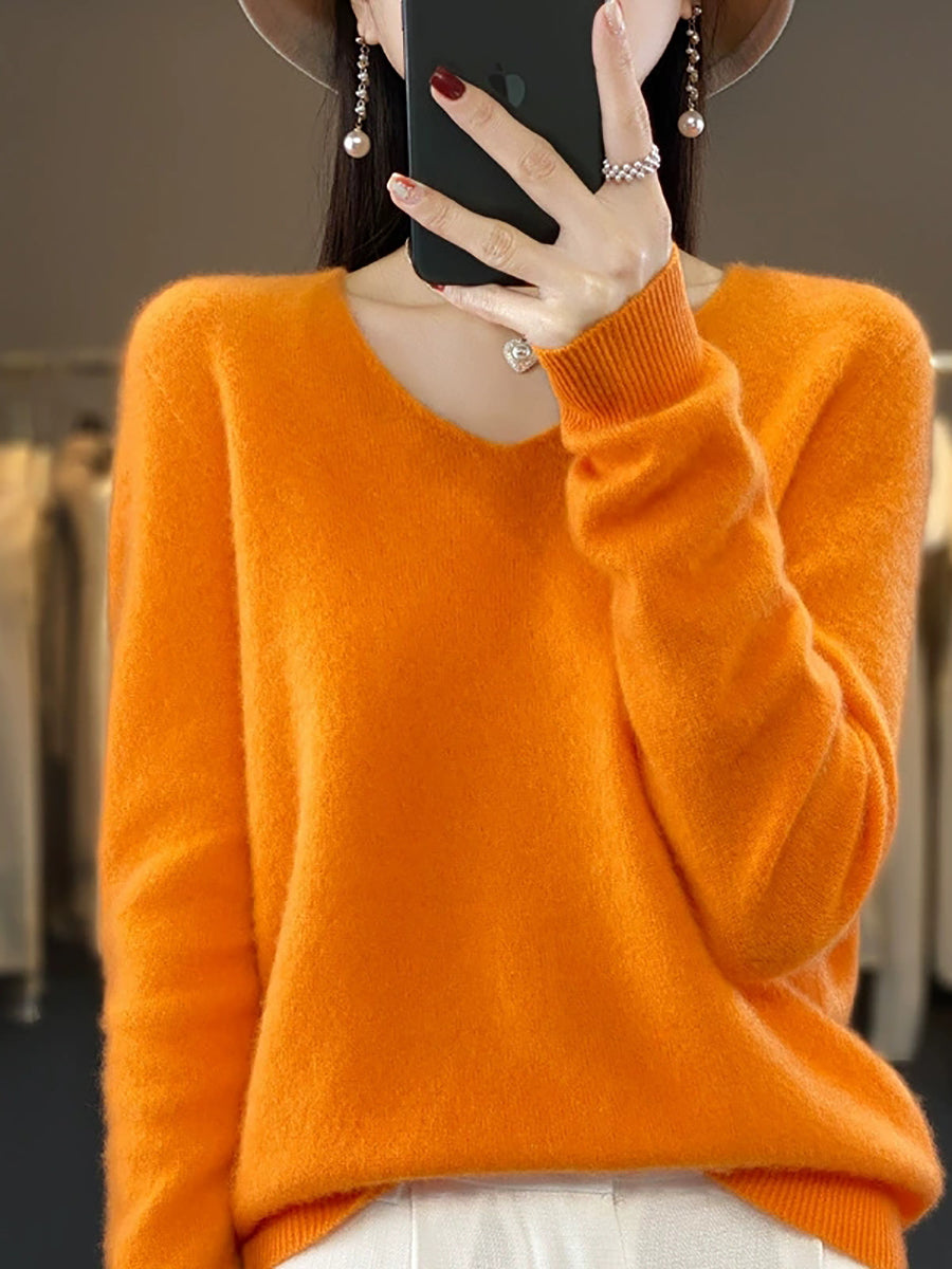סוודר צמר עם צווארון V בצבע טהור לנשים, קז'ואל