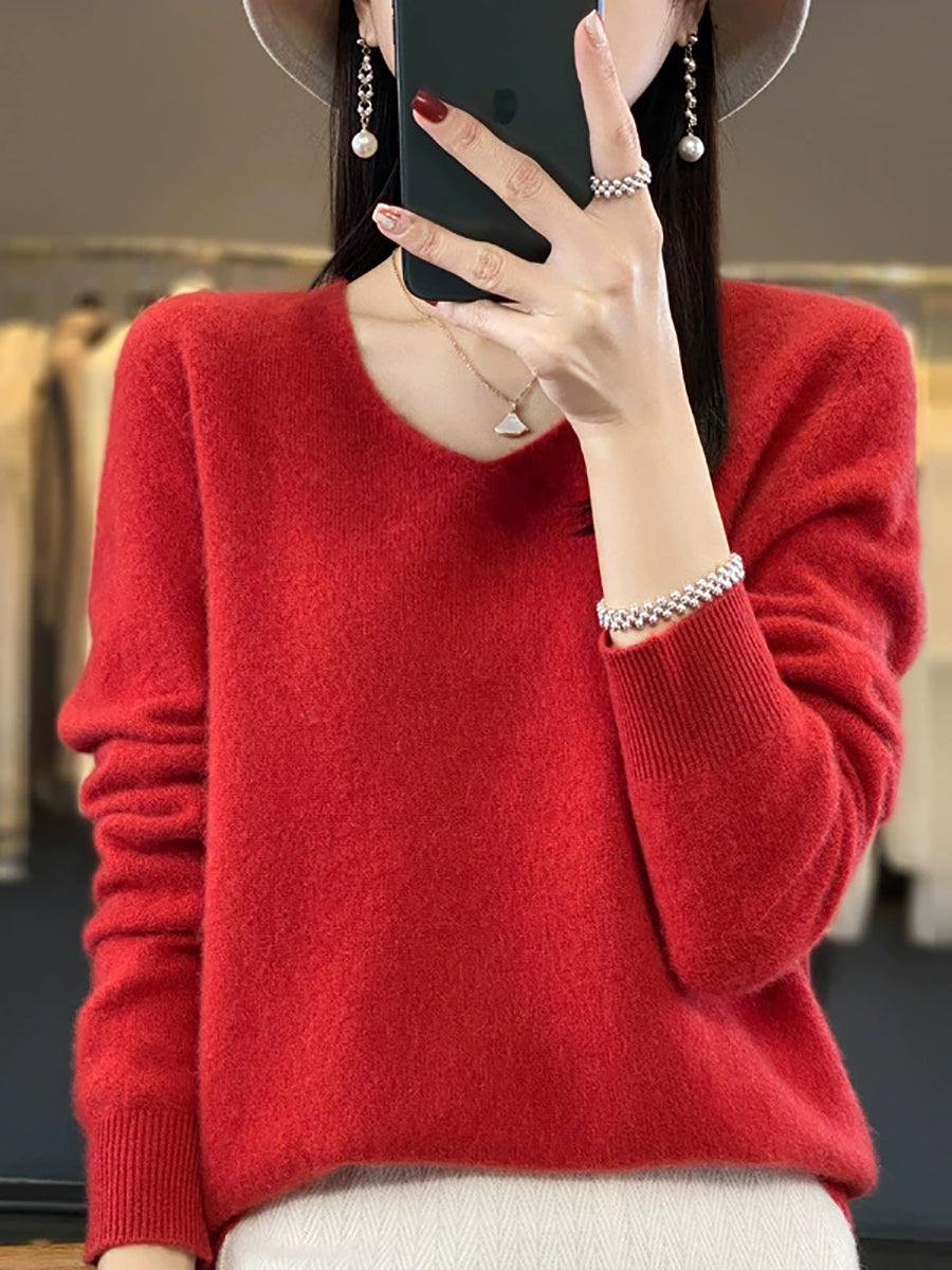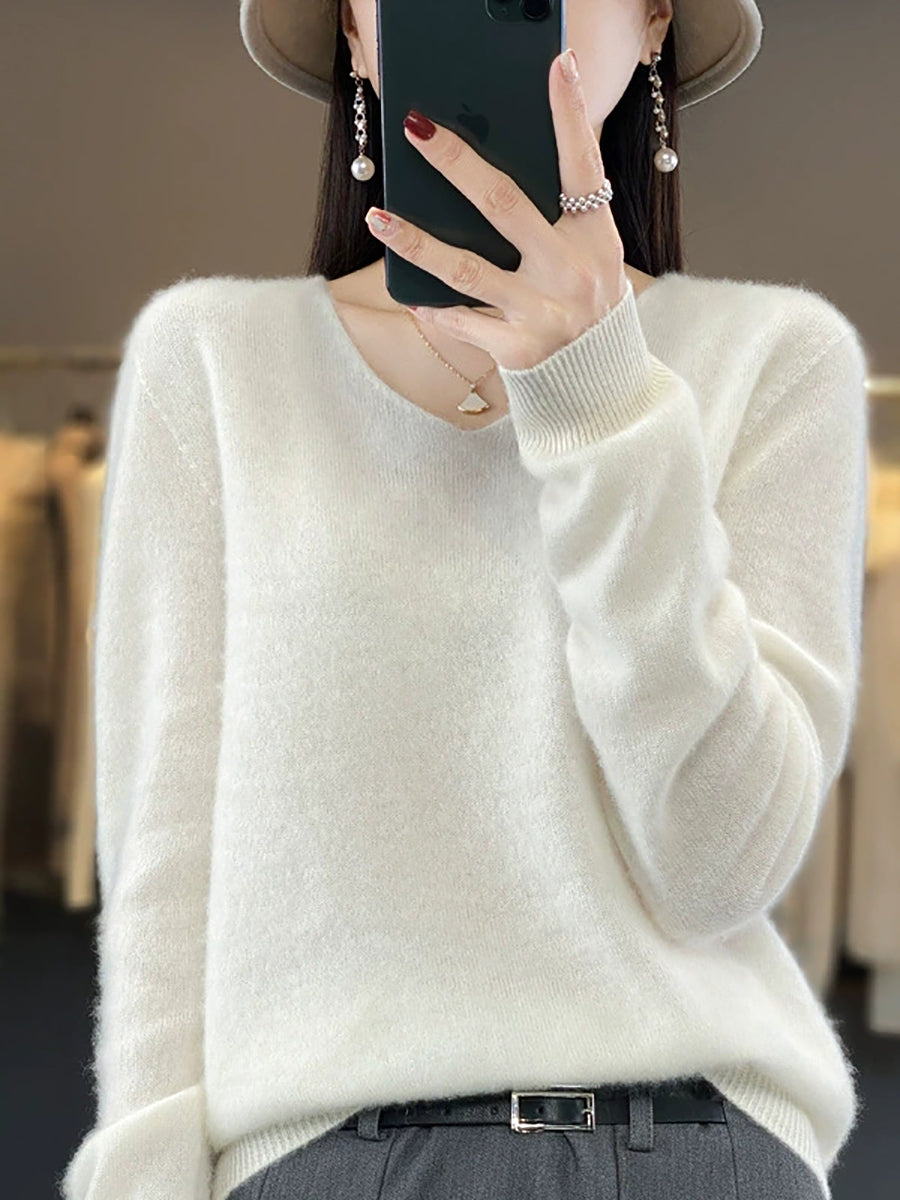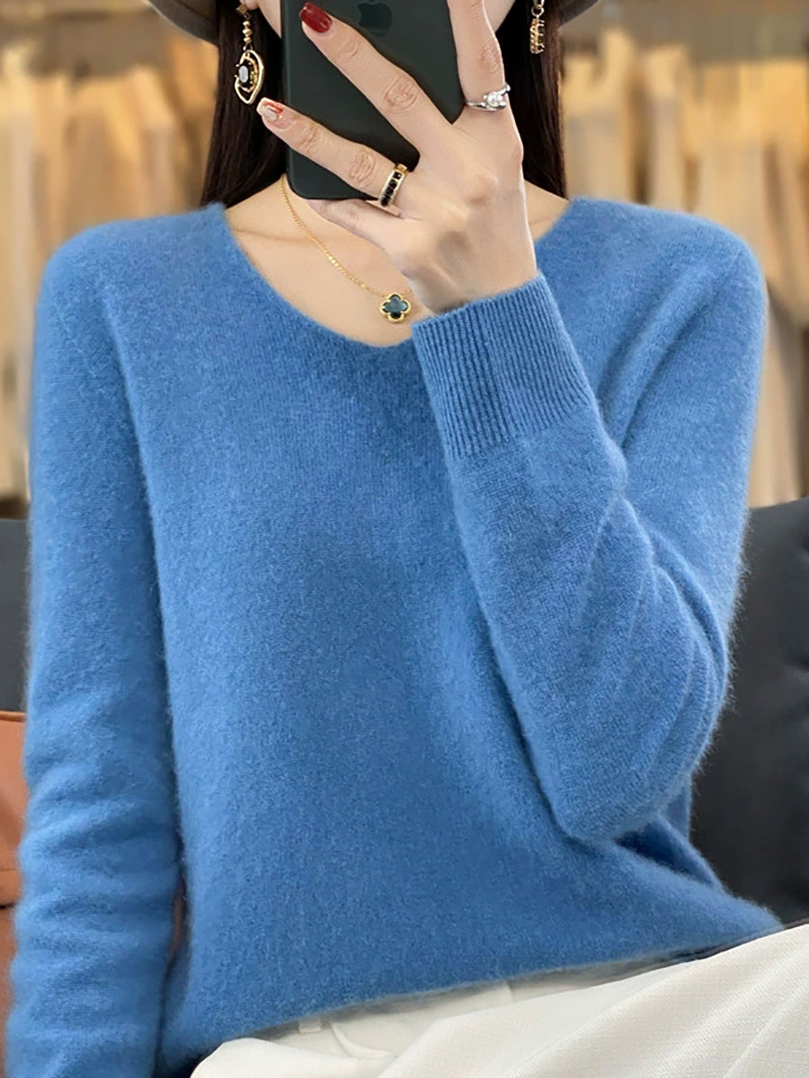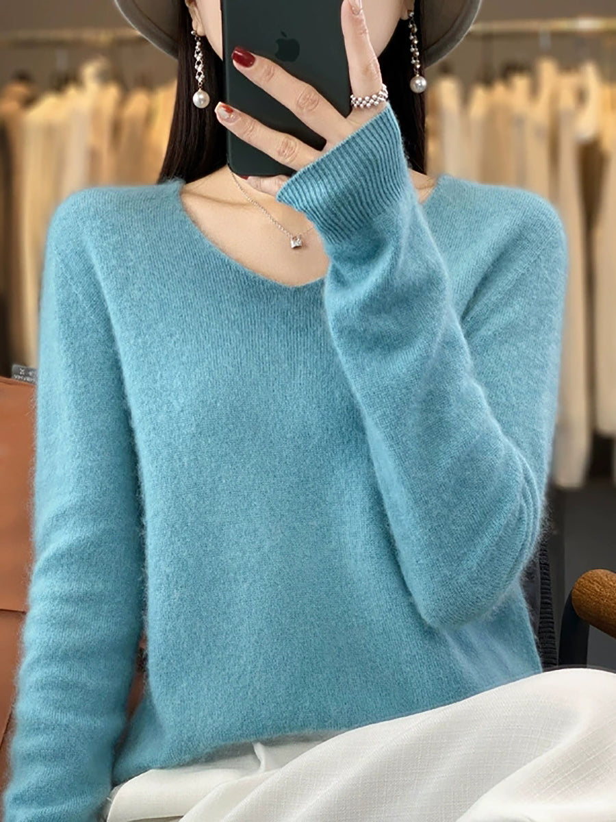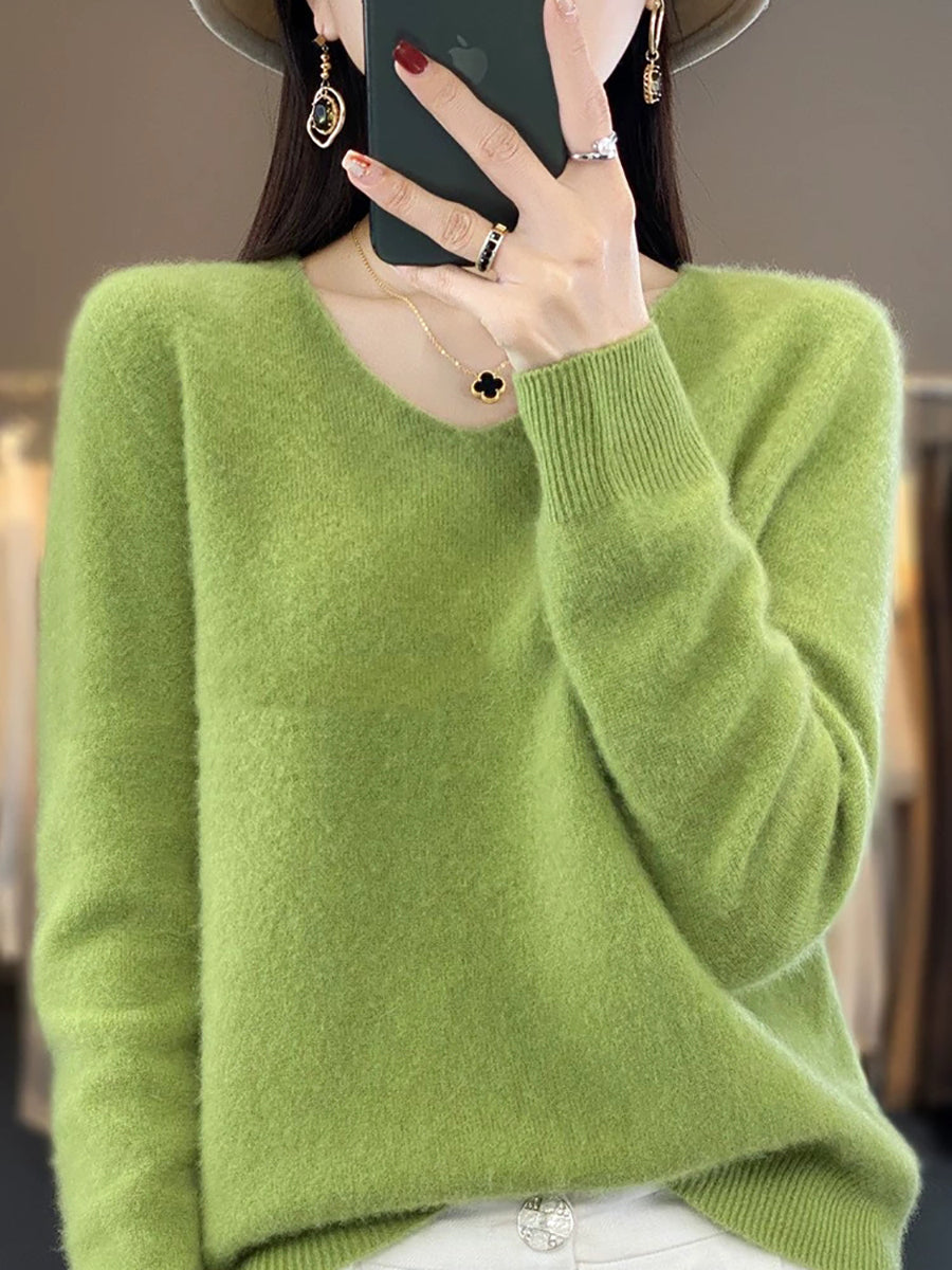 סוודר צמר עם צווארון V בצבע טהור לנשים, קז'ואל