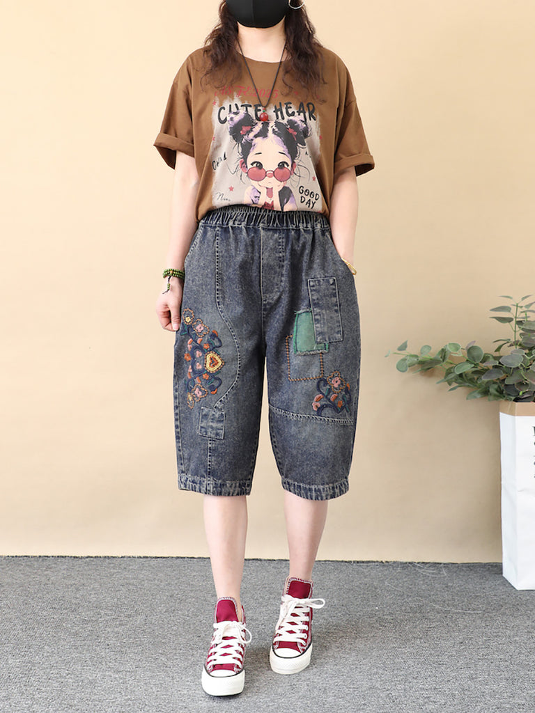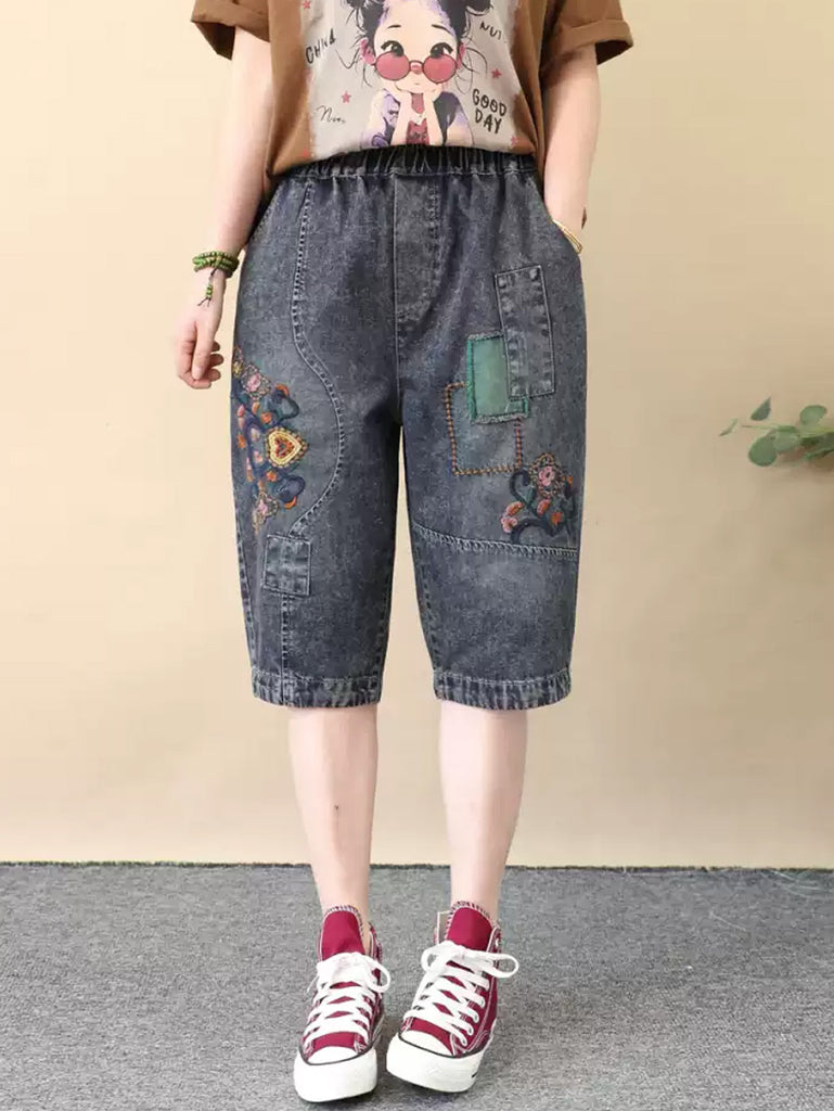 מכנסי ג'ינס עם רקמת פרחים רטרו לנשים
