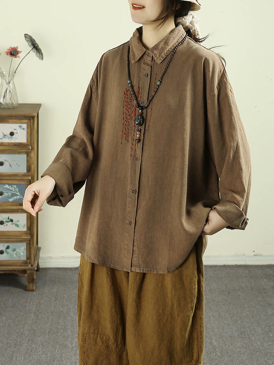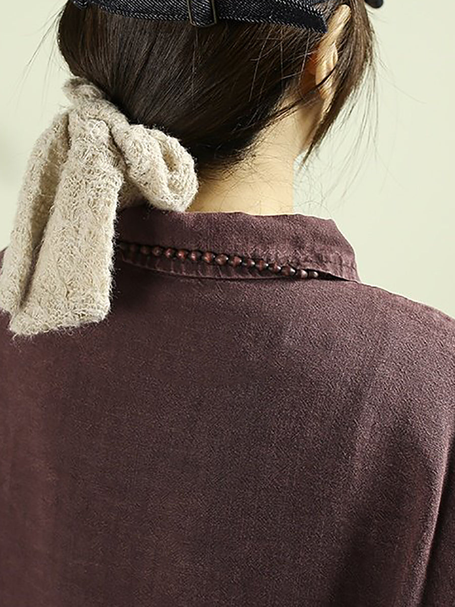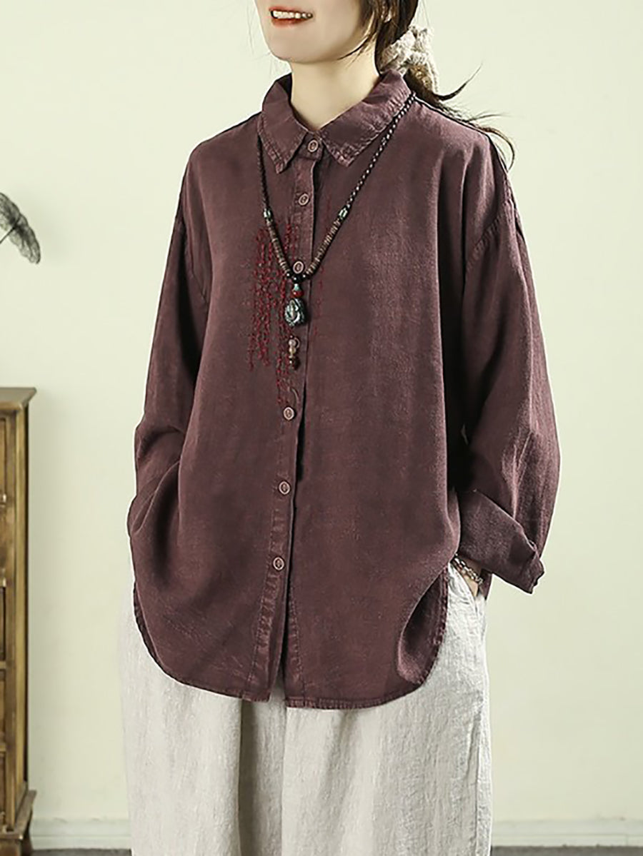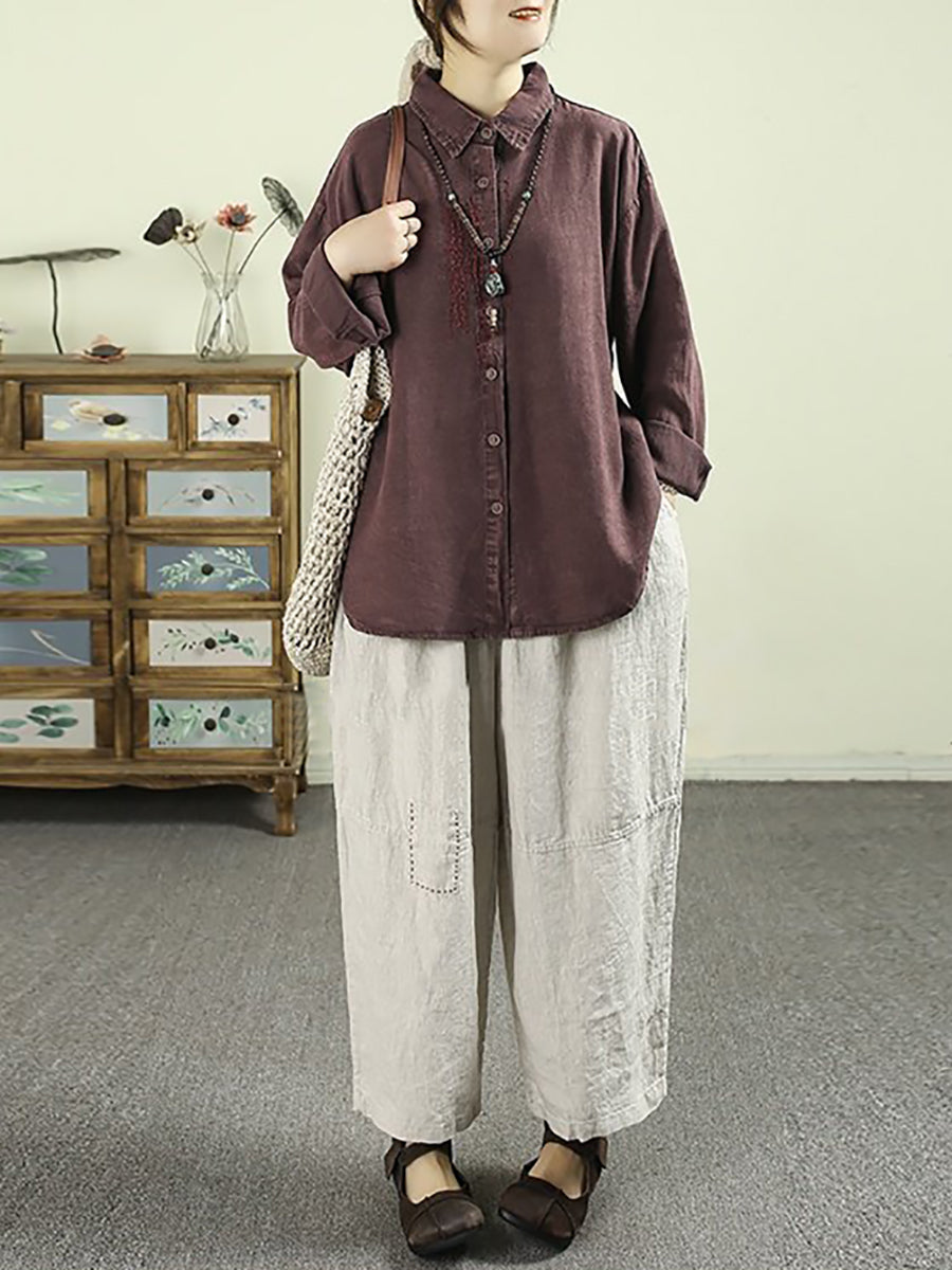 חולצת אביב רטרו לנשים עם צווארון הפוך בצבע טהור 100% פשתן