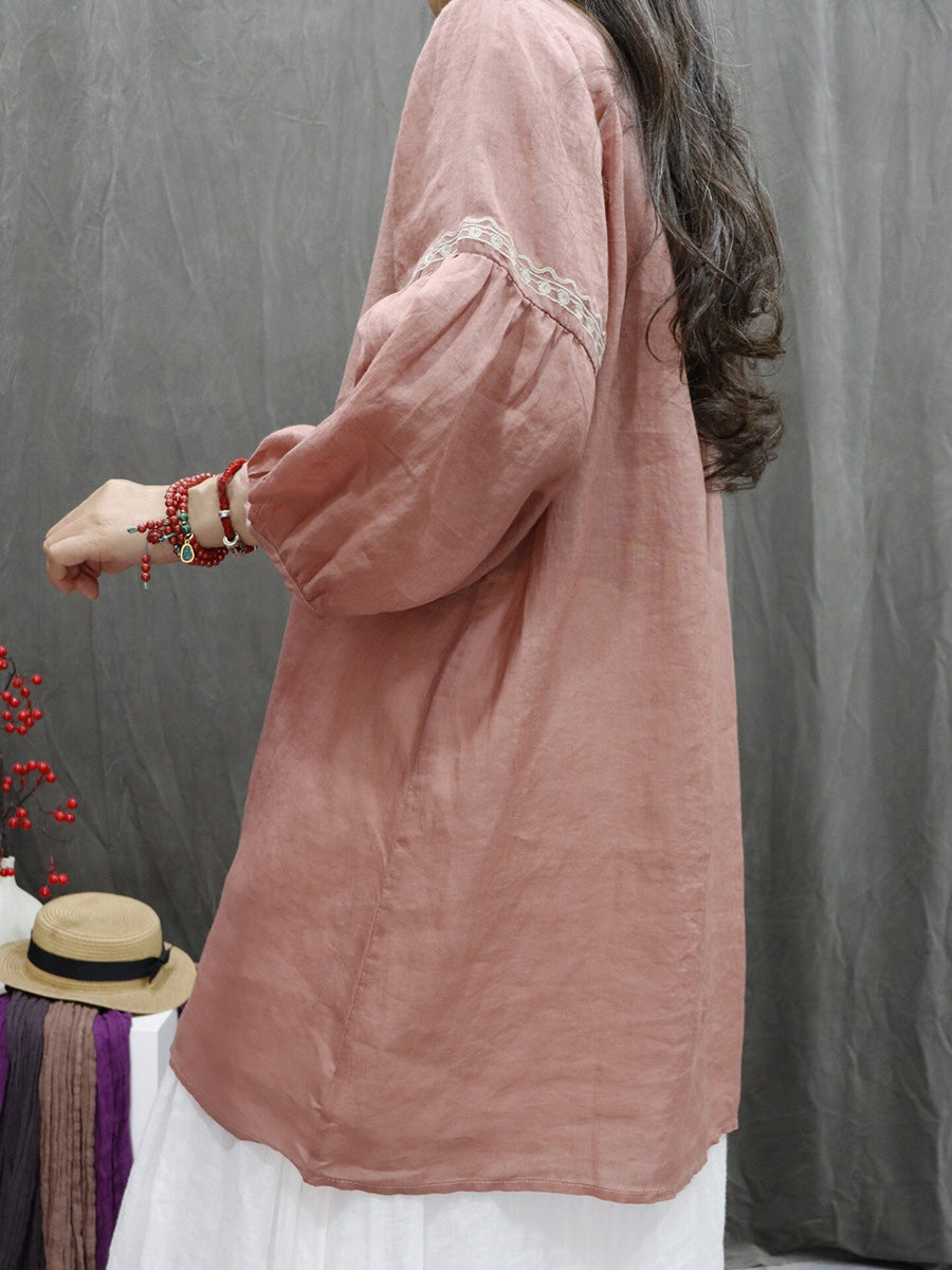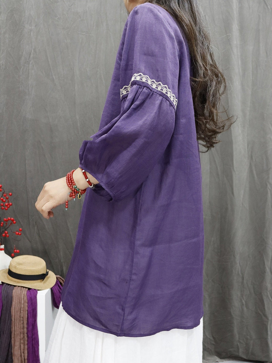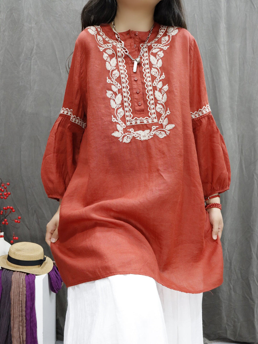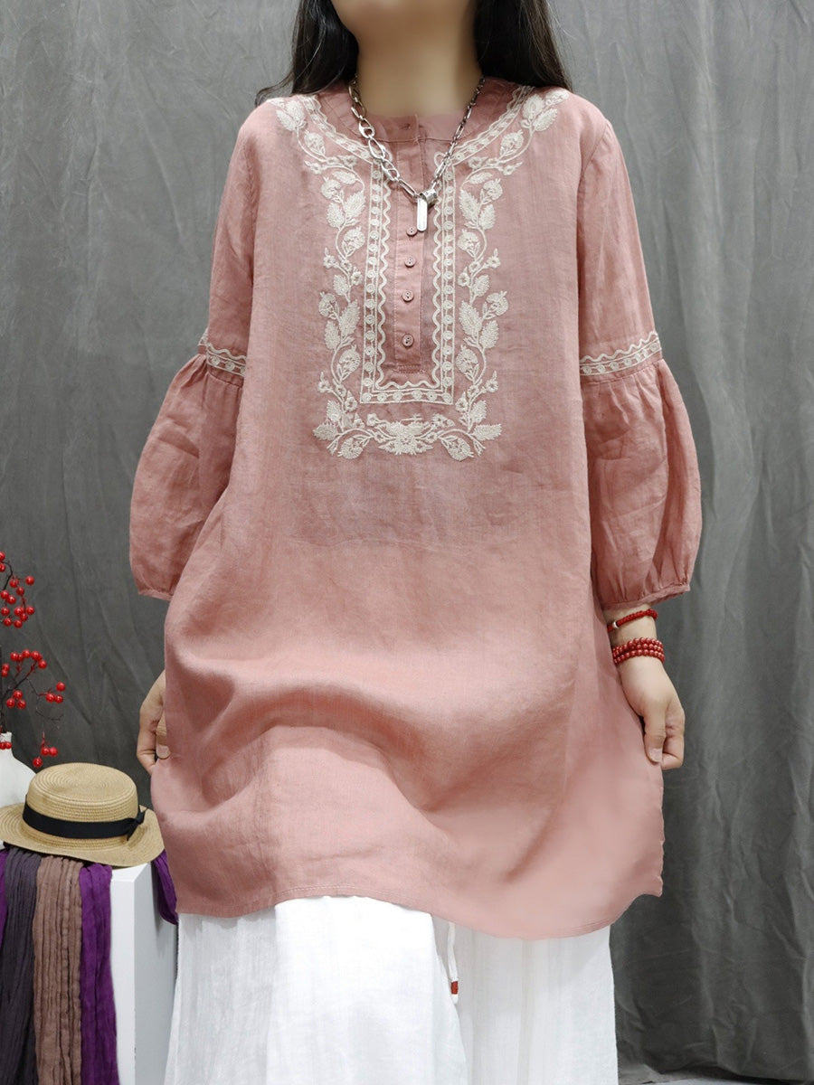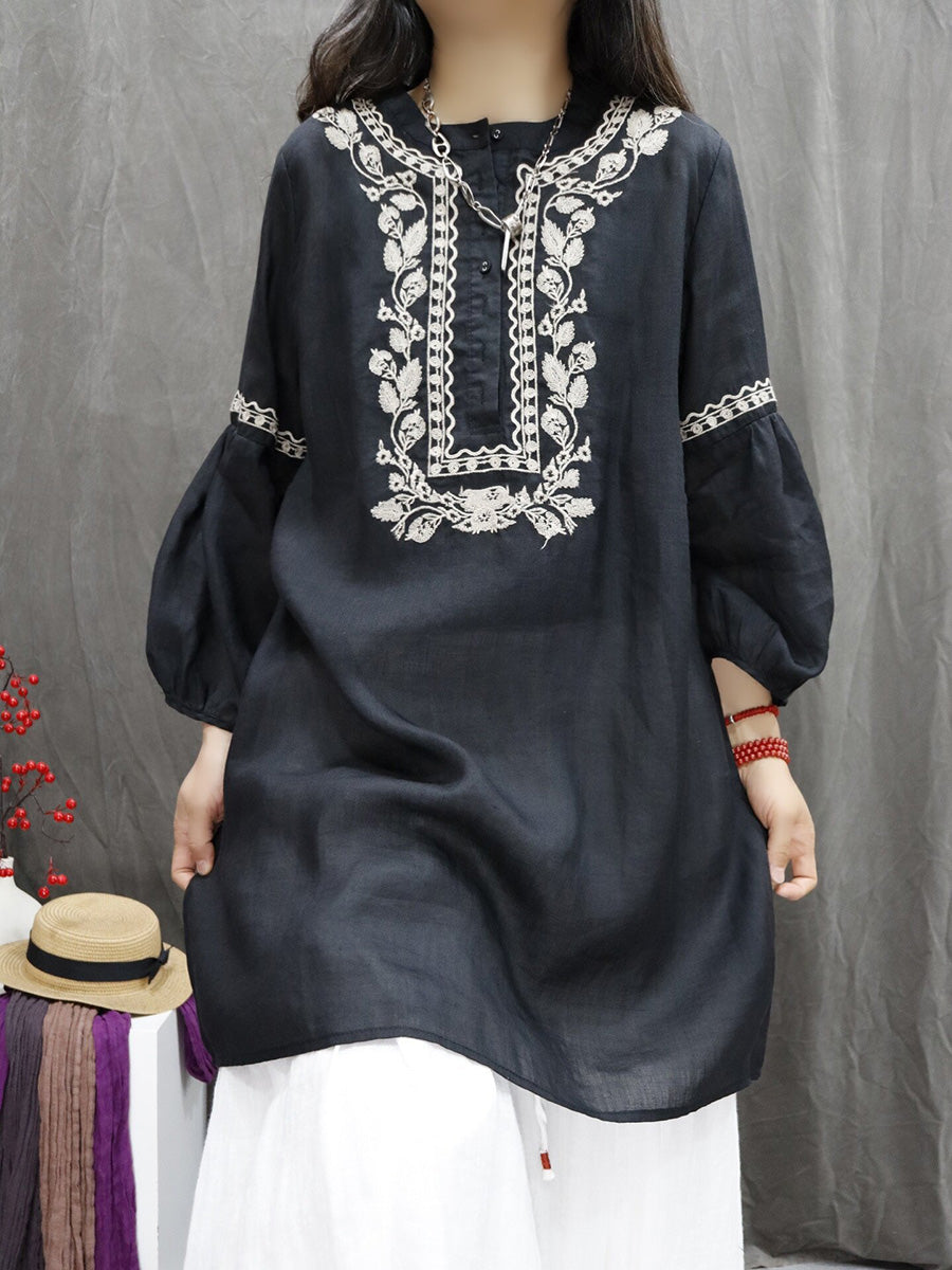 חולצת O-צוואר עם רקמת פרחים אמנותית לאביב לנשים 100% רמי