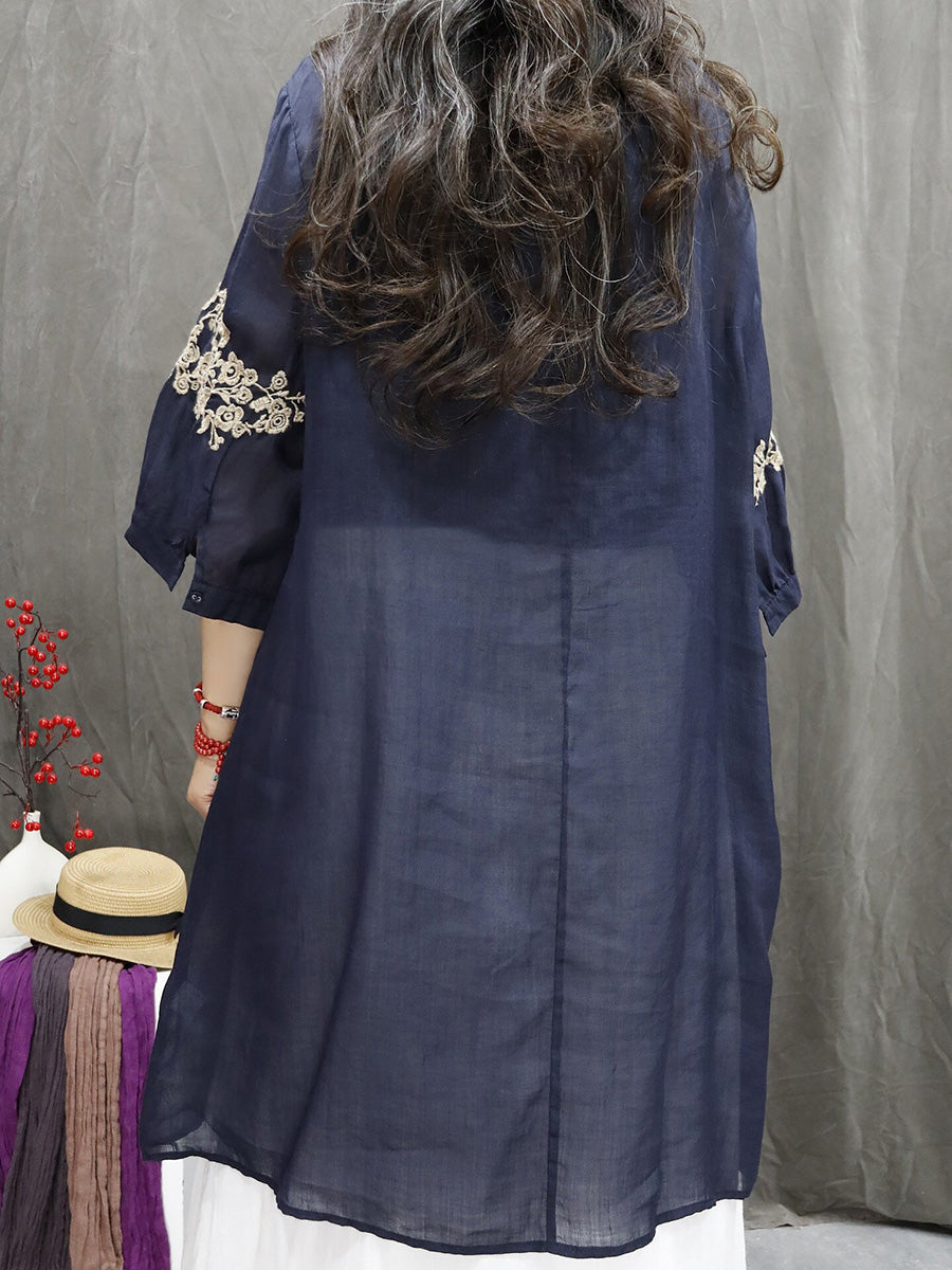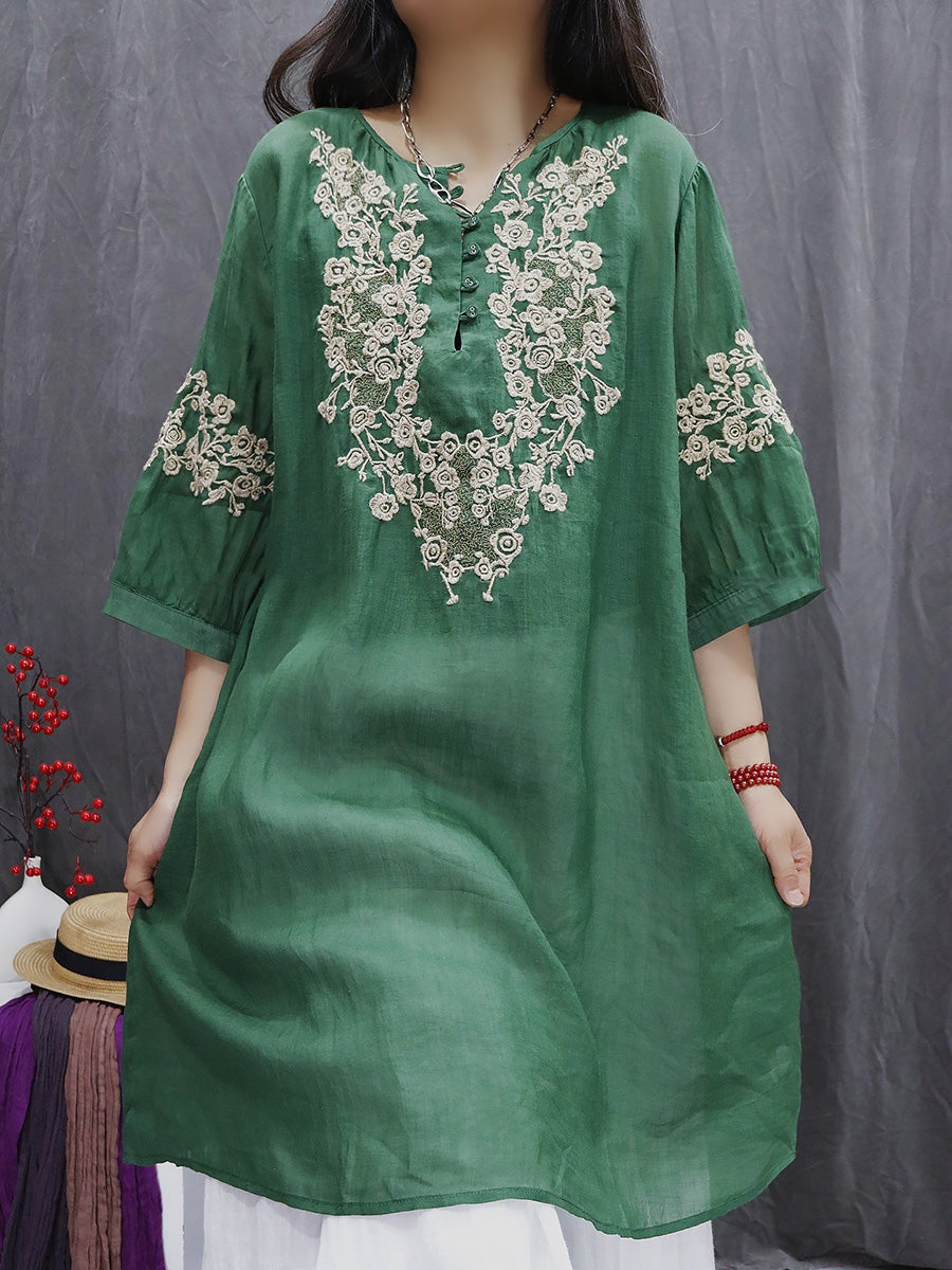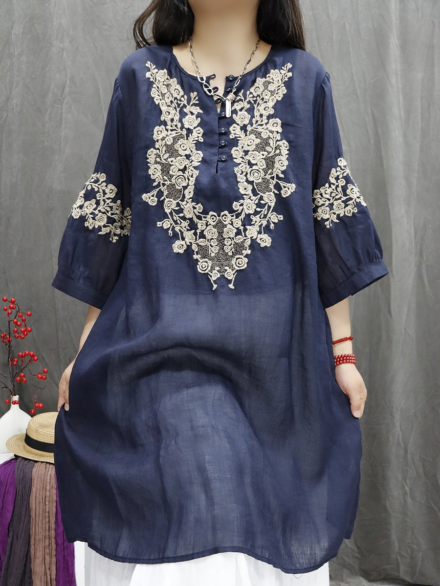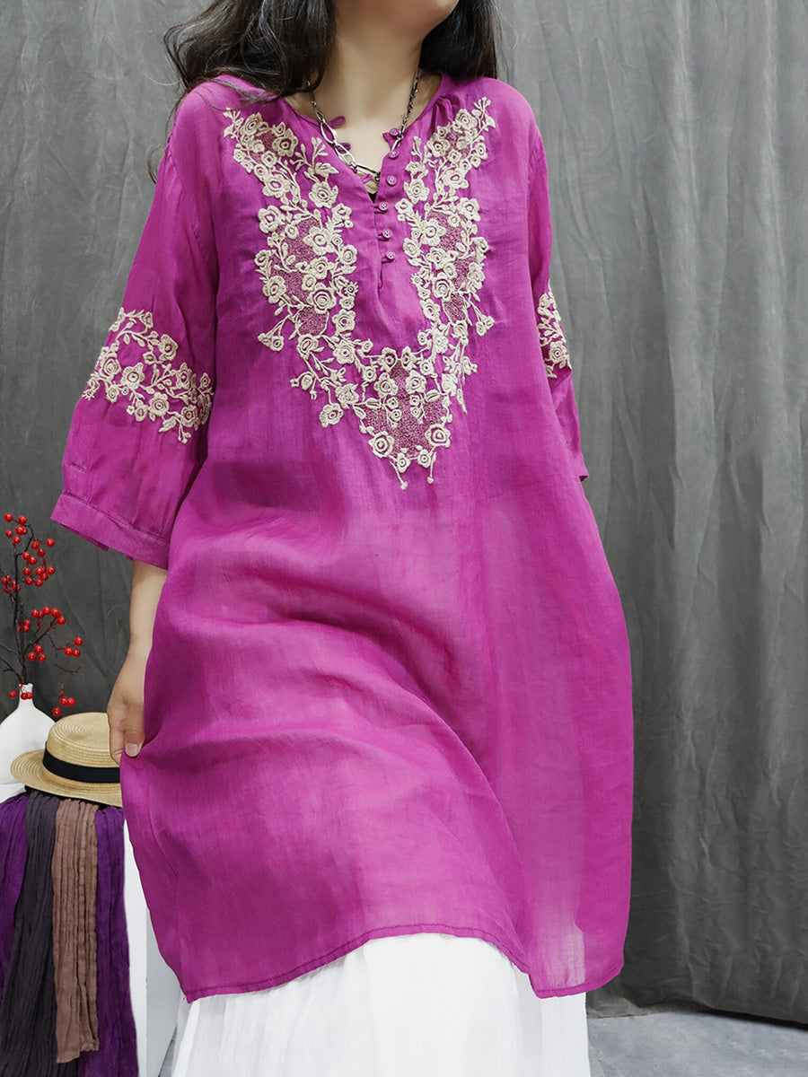 חולצת אביב לנשים עם צווארון V ורקמה פרחונית 100% רמי