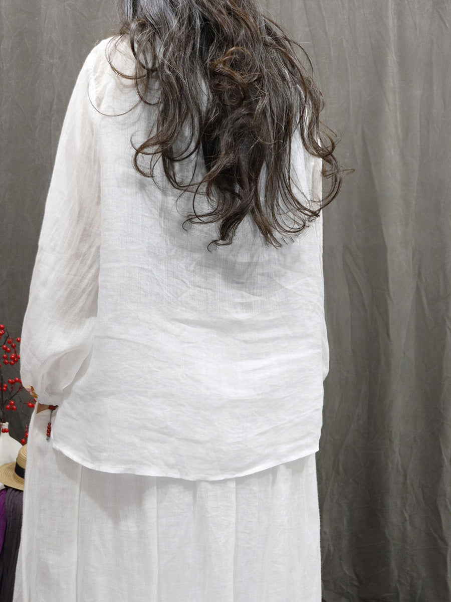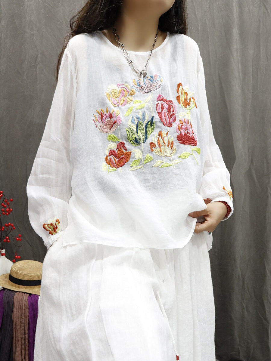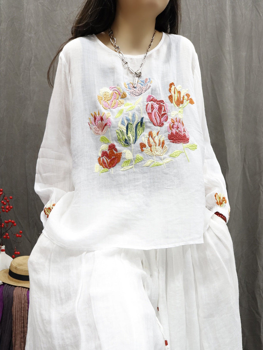 חולצת אביב לנשים עם צווארון O ורקמה פרחונית אומנותית 100% רמי