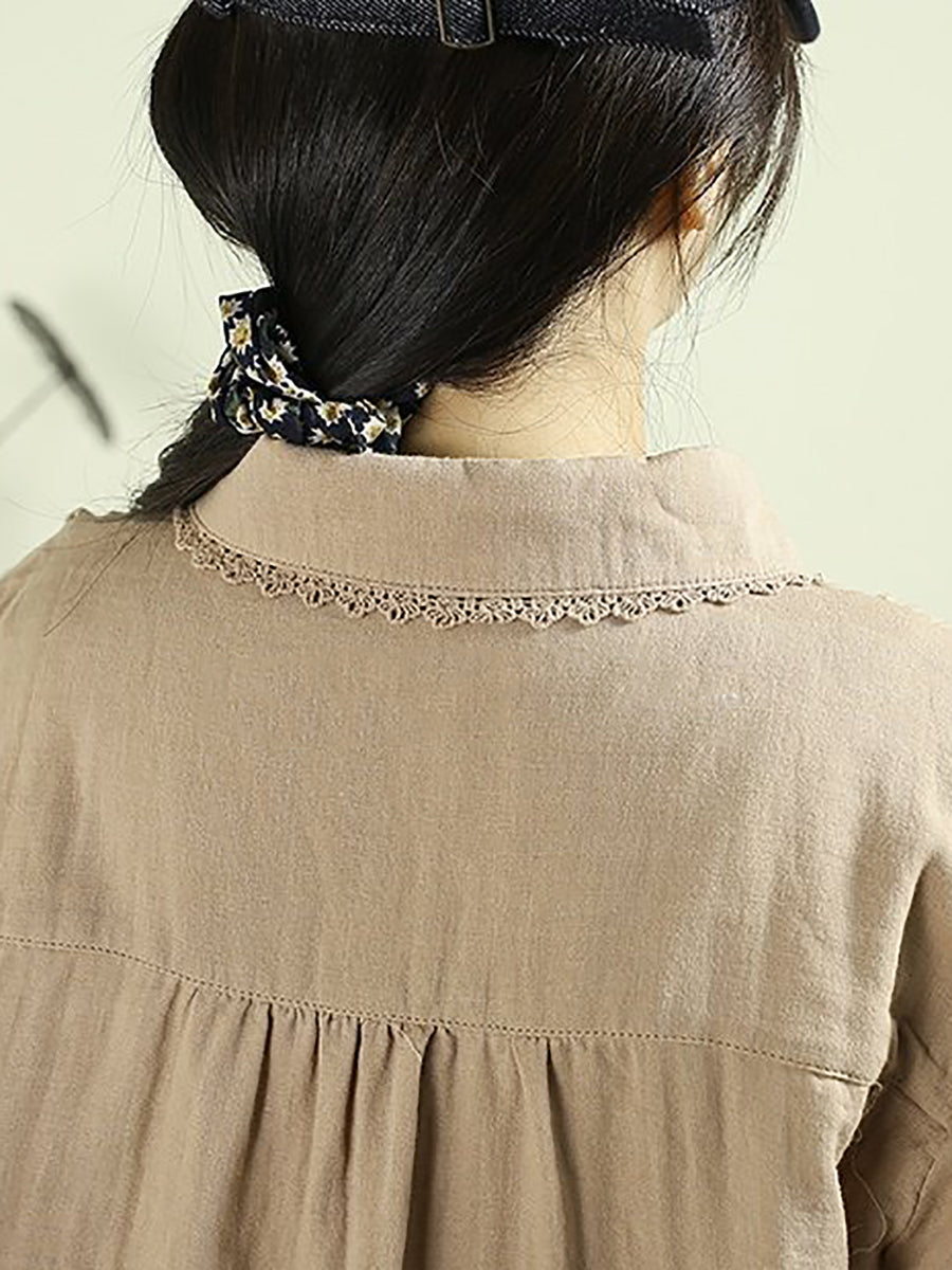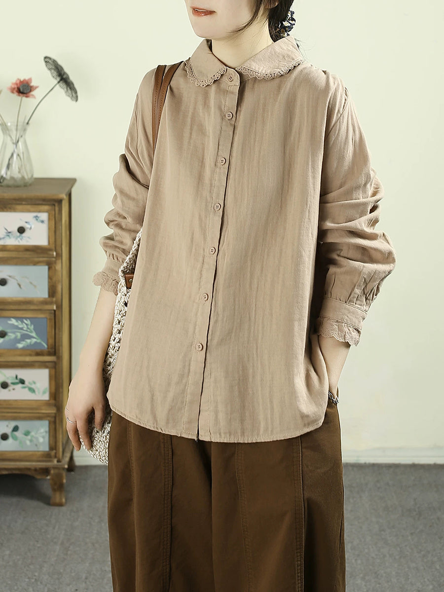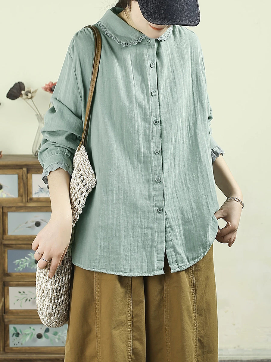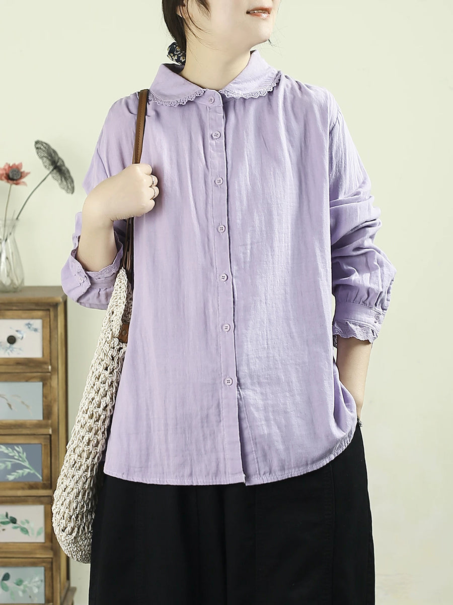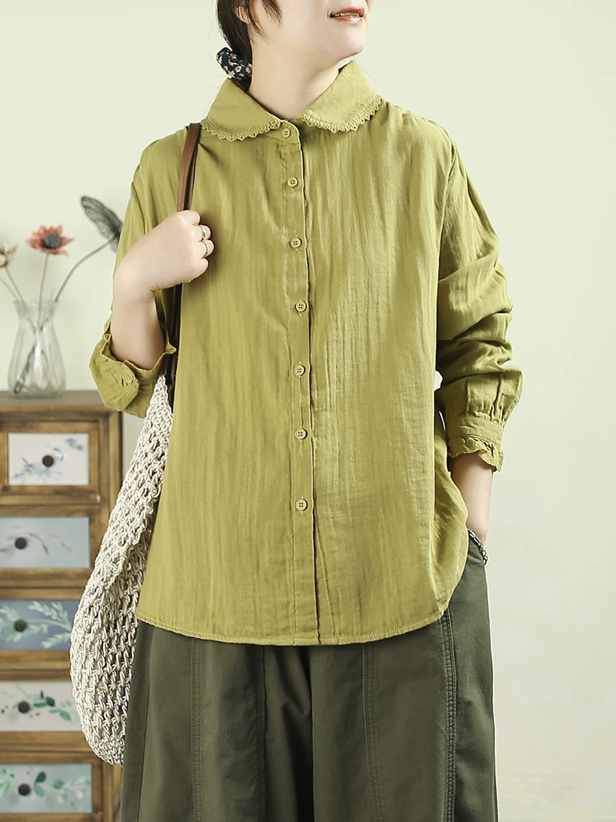 חולצת אביב לנשים עם צווארון הפוך, צבע טהור 100% כותנה, אומנותית