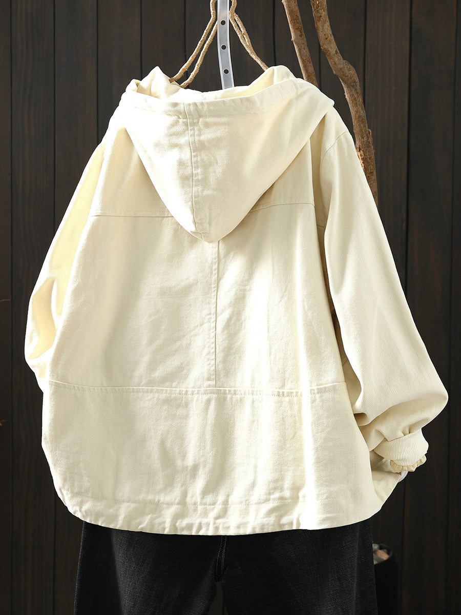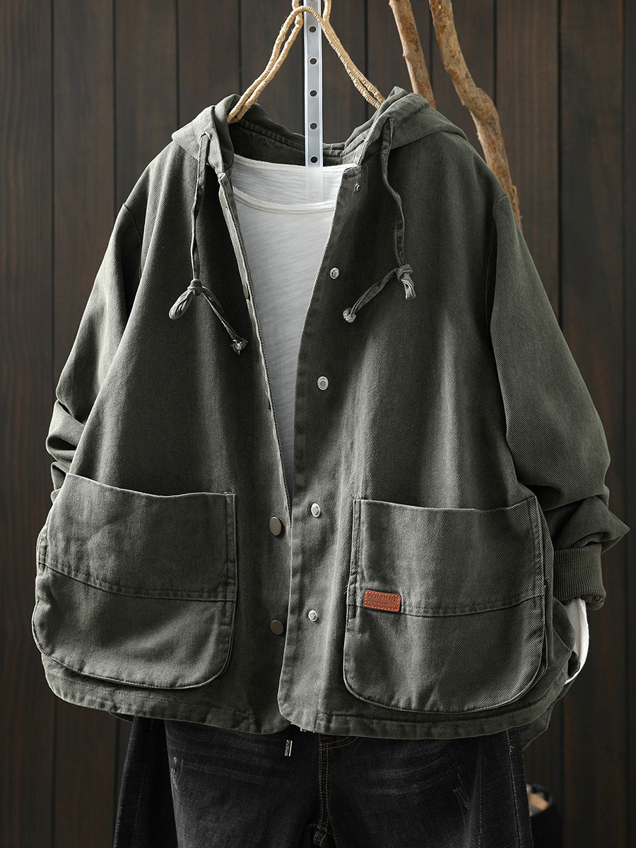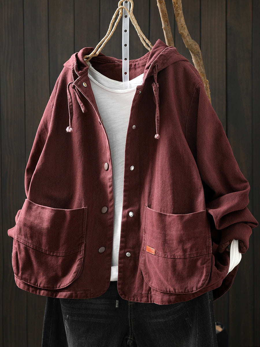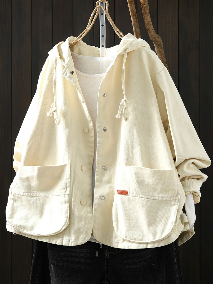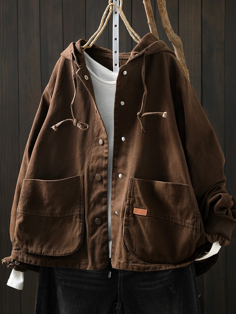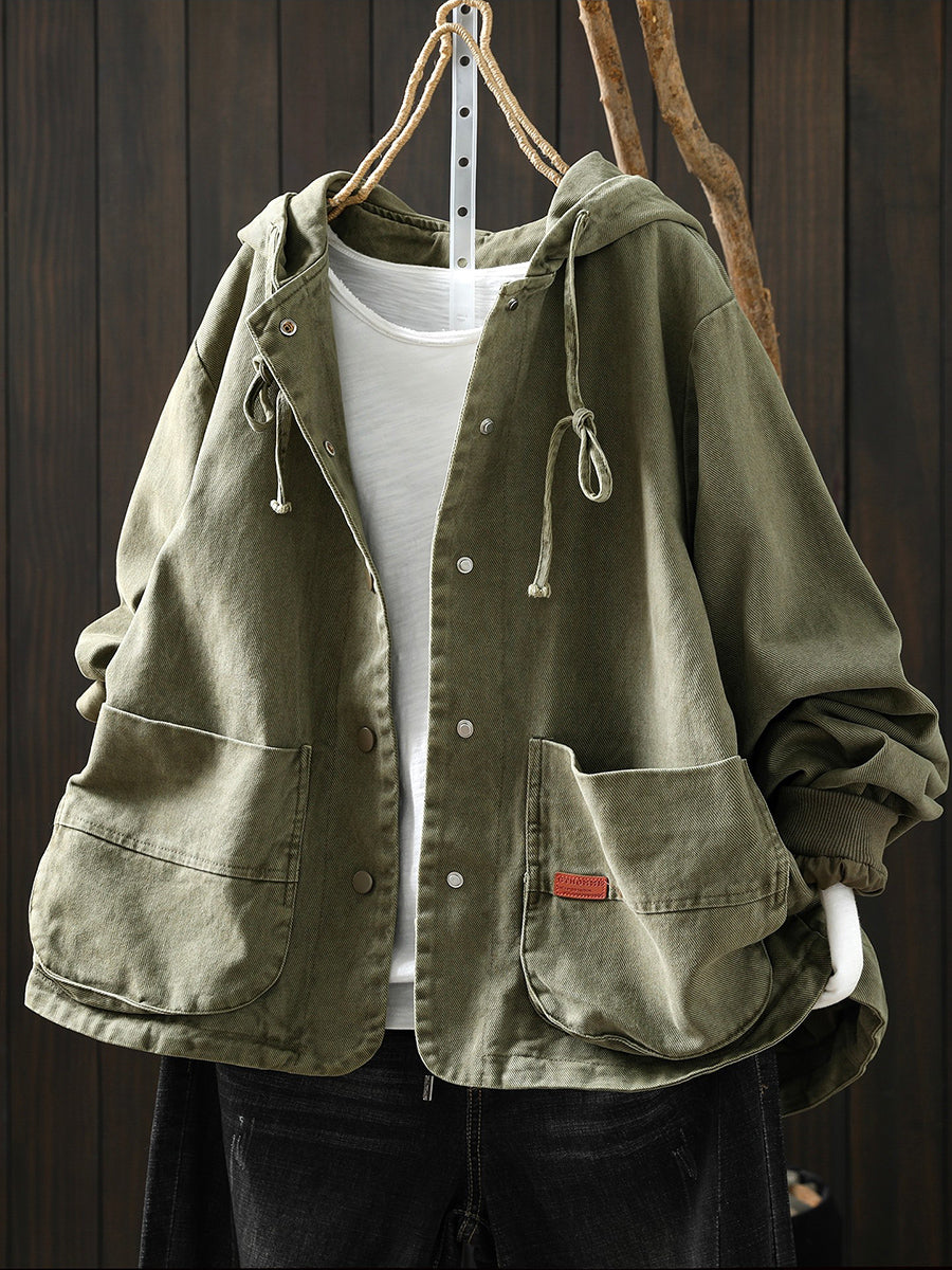 מעיל כותנה קז'ואל לנשים באביב עם קפוצ'ון בצבע טהור