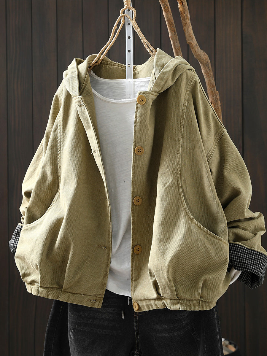 מעיל כותנה קז'ואל לנשים באביב עם קפוצ'ון בצבע טהור