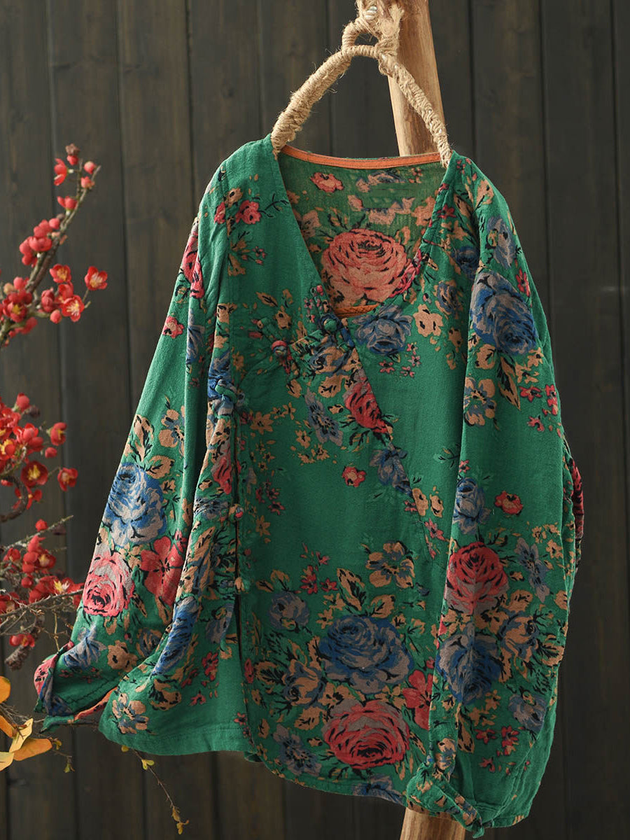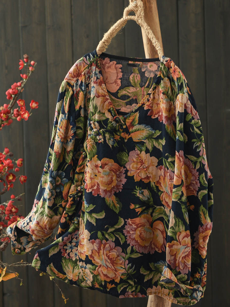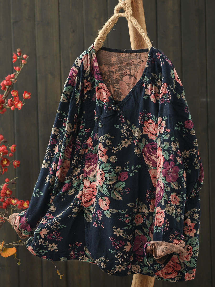 חולצת כותנה עם צווארון V פרחוני ואביב לנשים