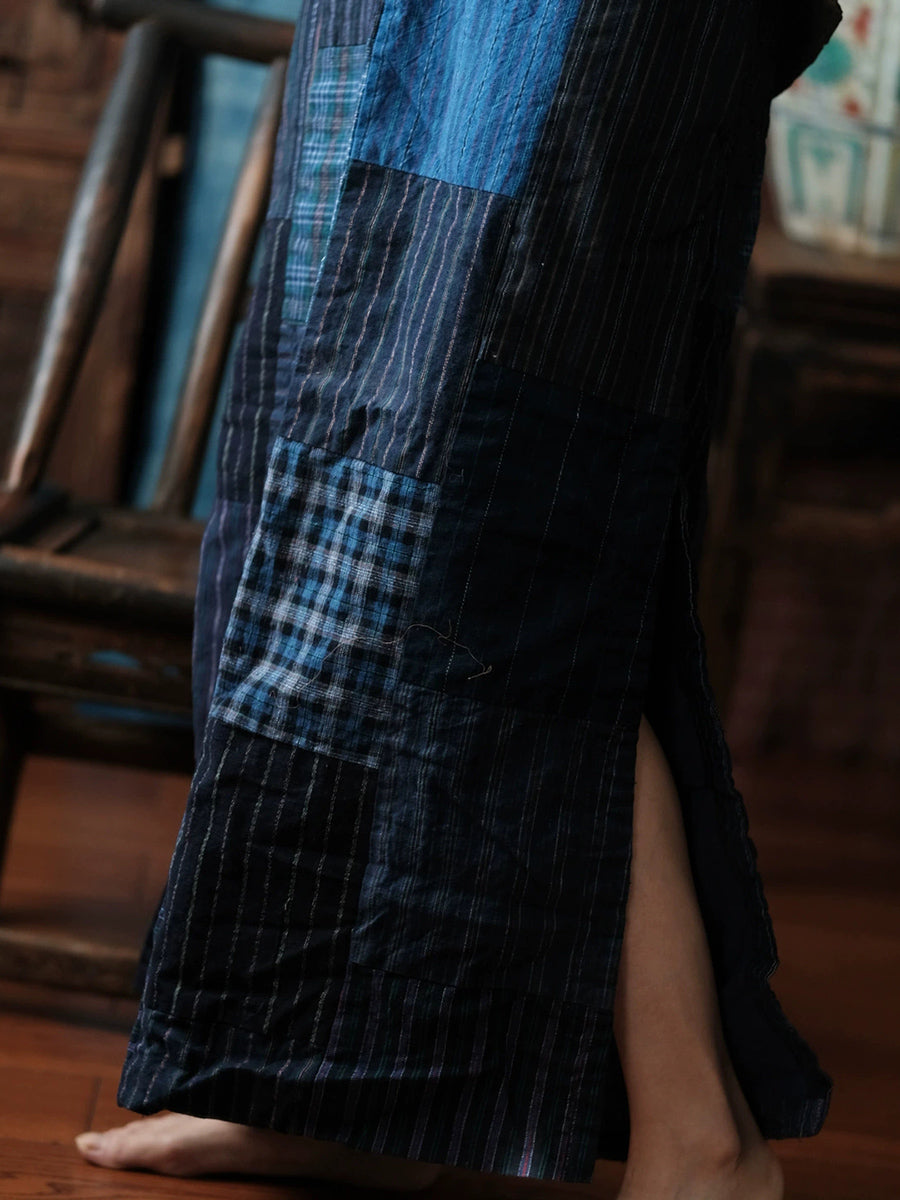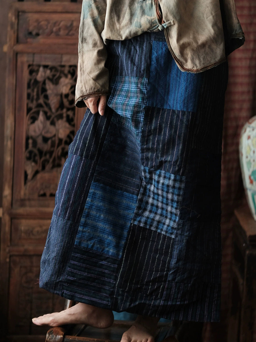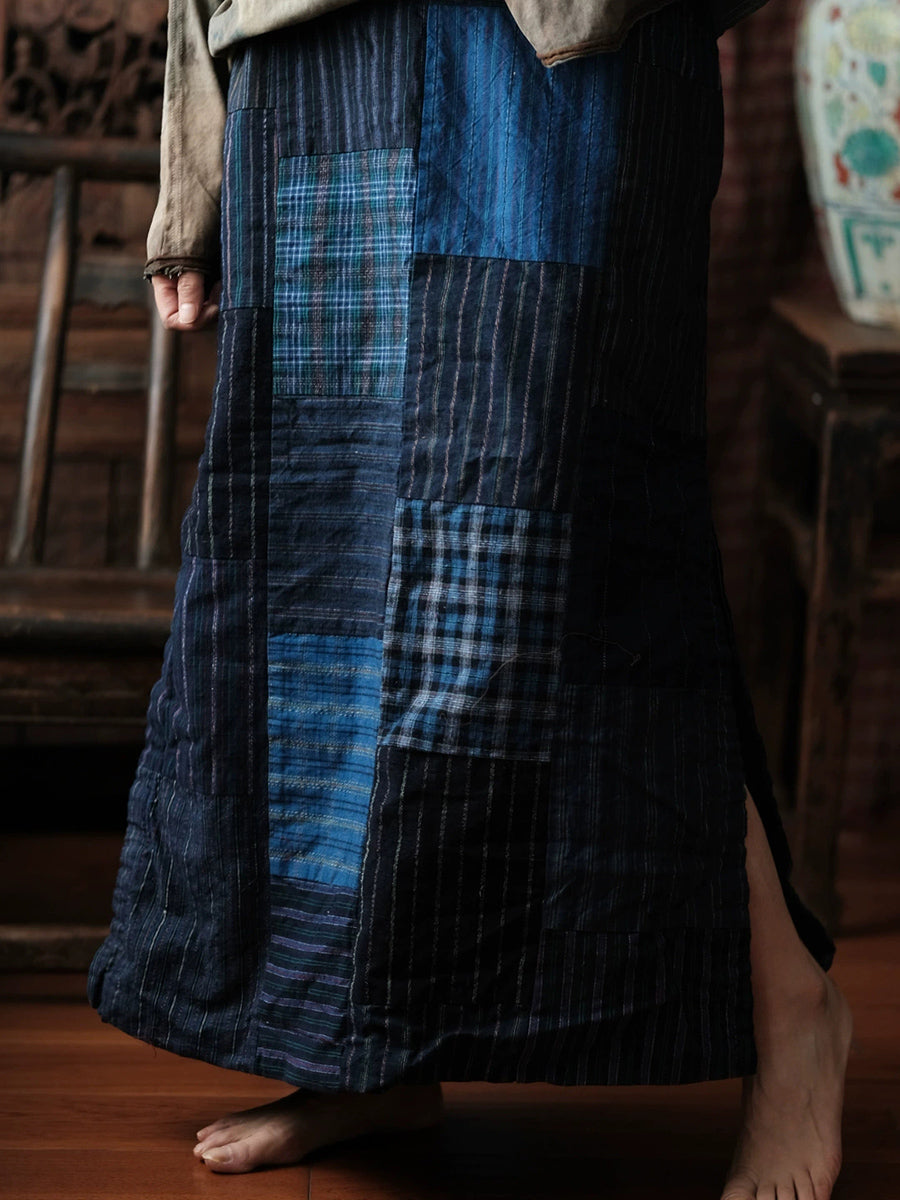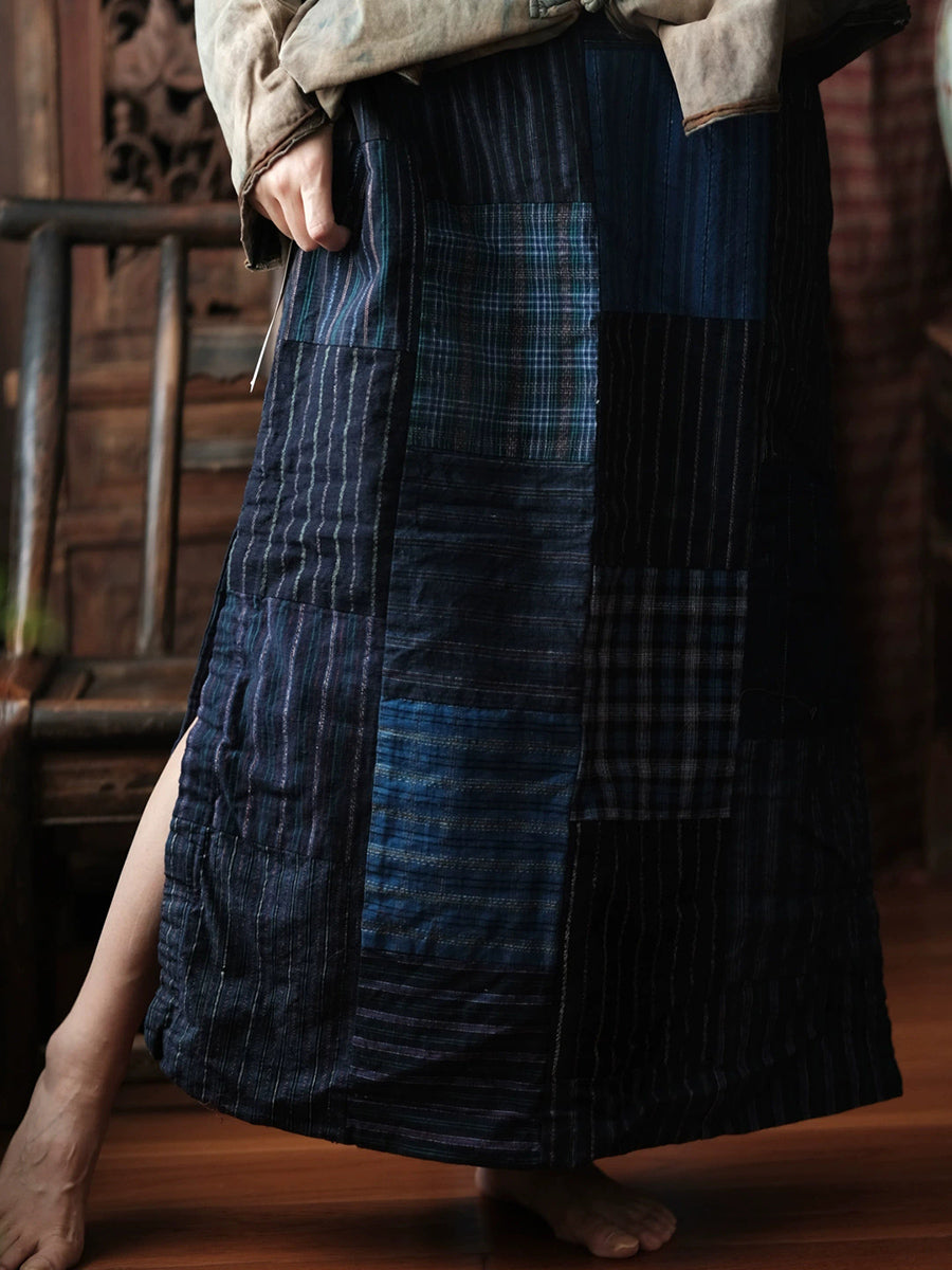 חצאית אביב רטרו טלאים מכותנה עם מכפלת מפוצלת לנשים