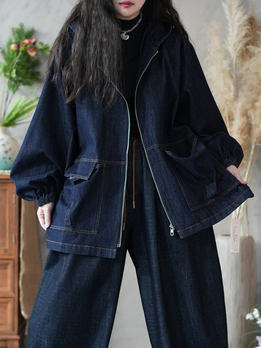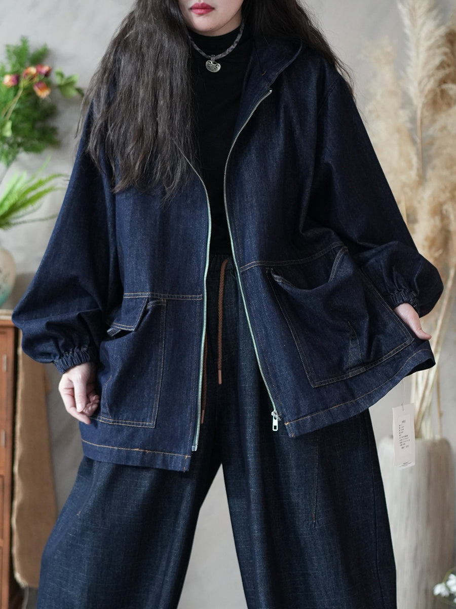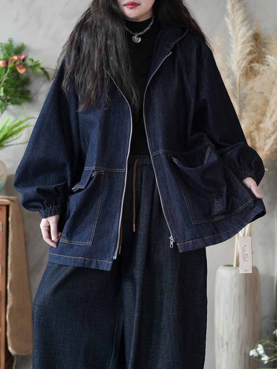 מעיל ג'ינס בצבע טהור בסגנון אביב לנשים עם קפוצ'ון
