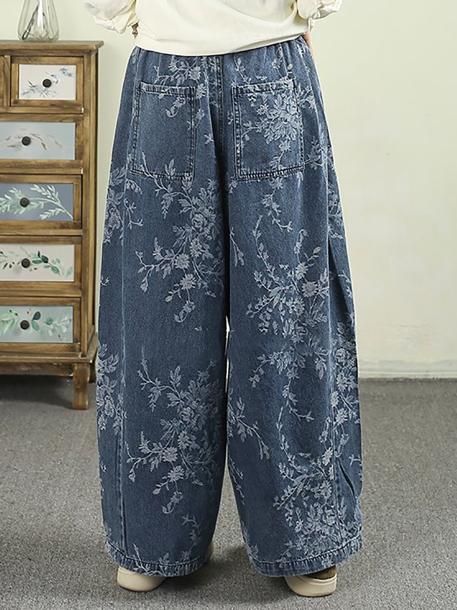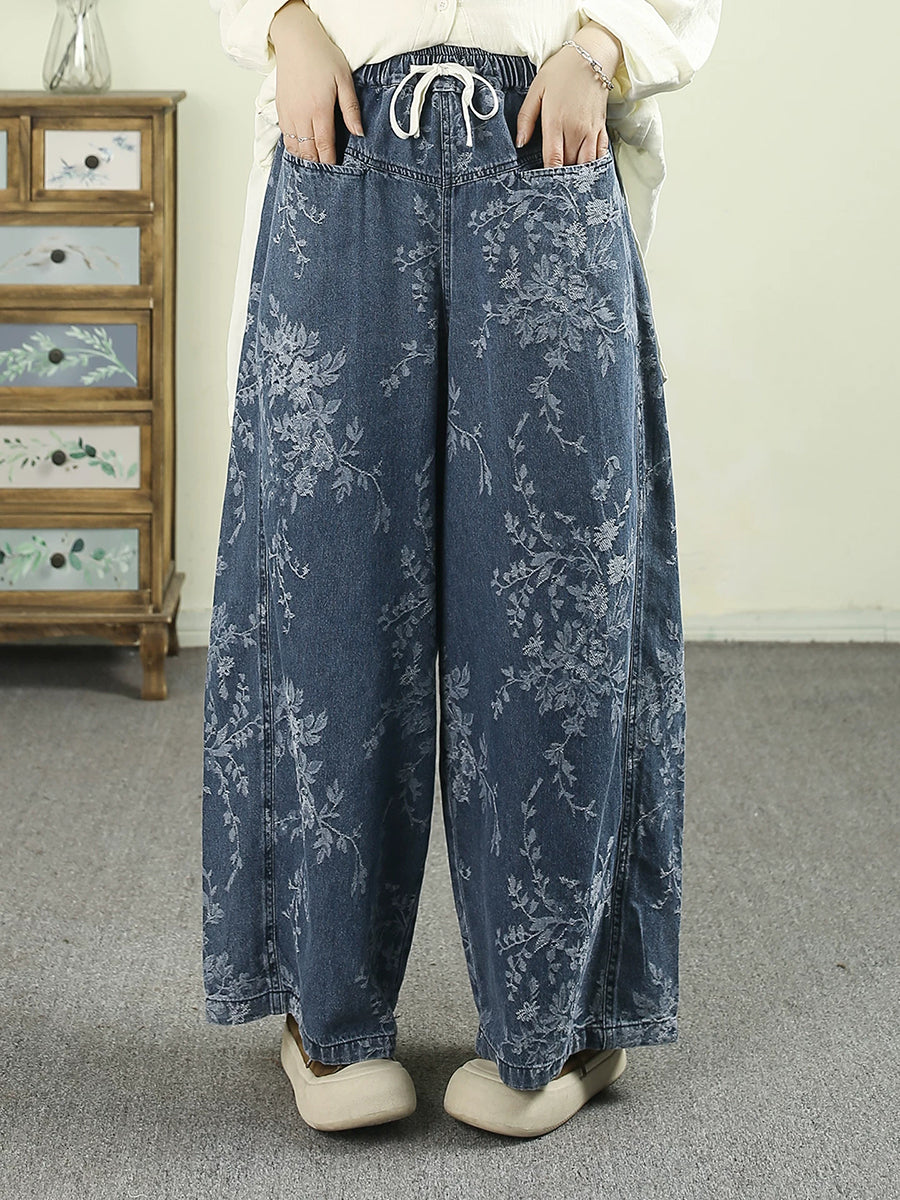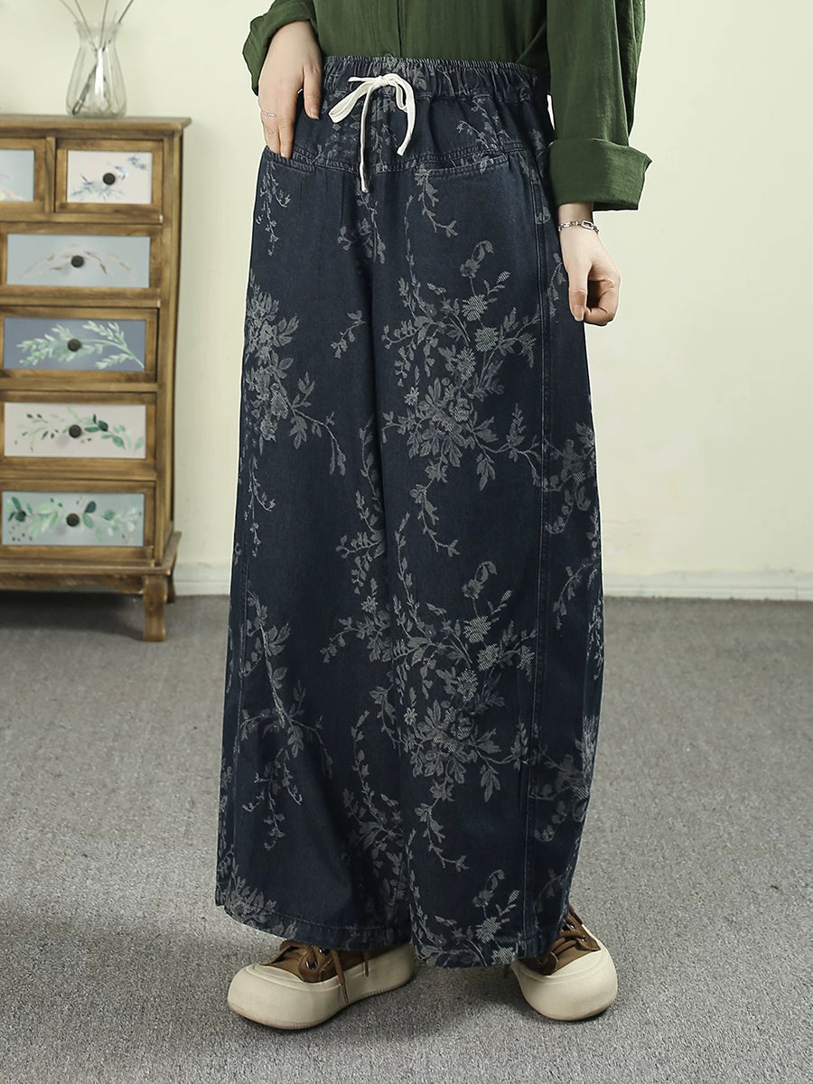 מכנסי כותנה רחבים בגזרה רחבה עם פרחים באביב לנשים