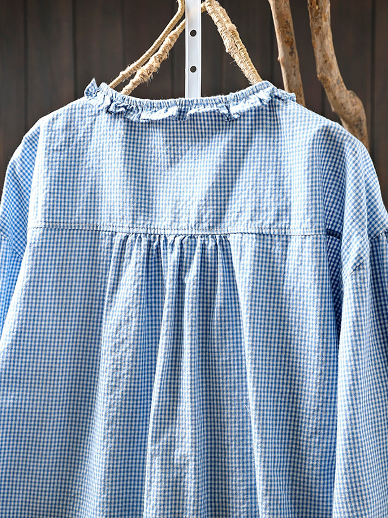 חולצת קיץ לנשים עם צווארון תחרה משובצת אמנותית 100% כותנה