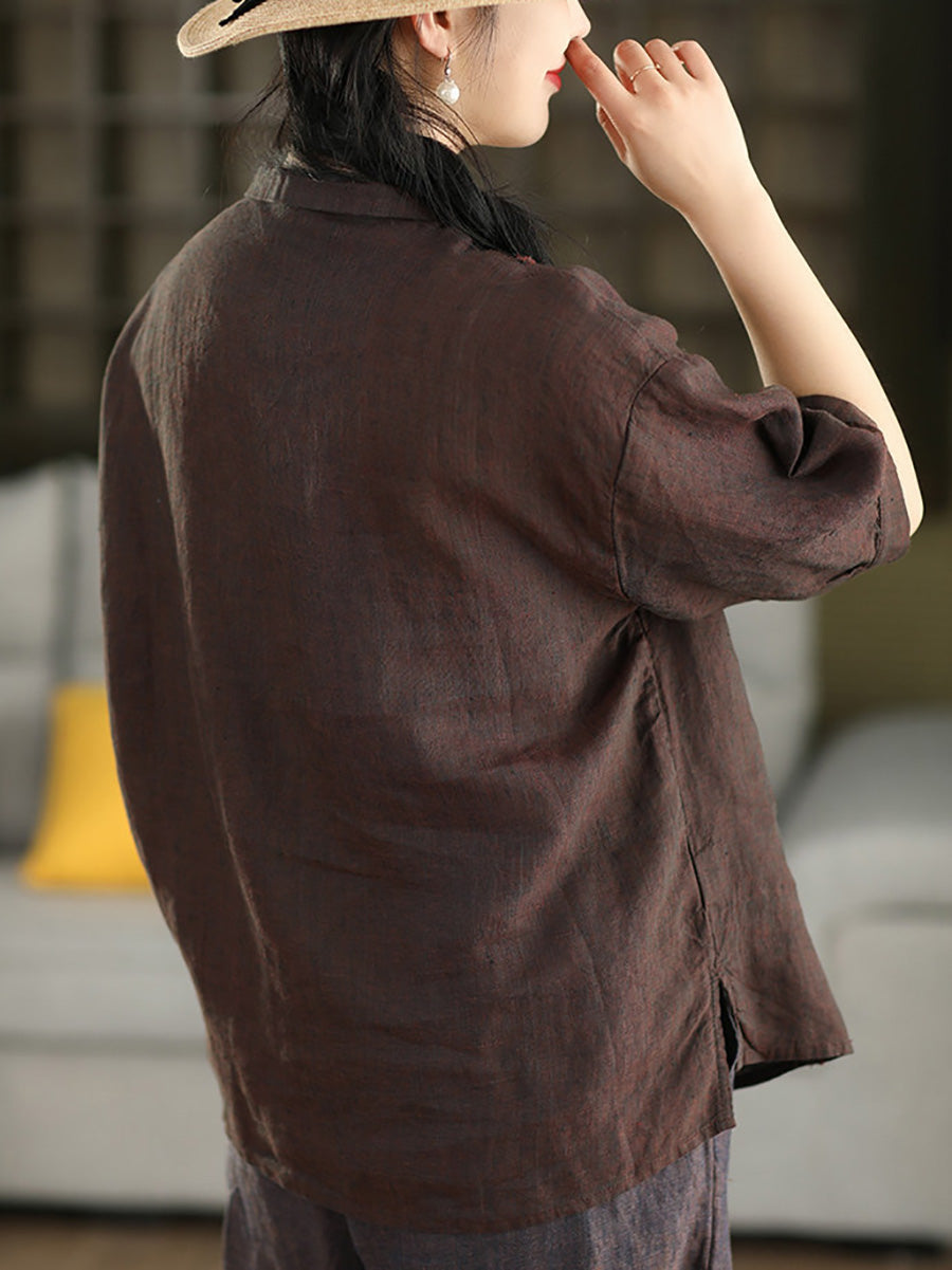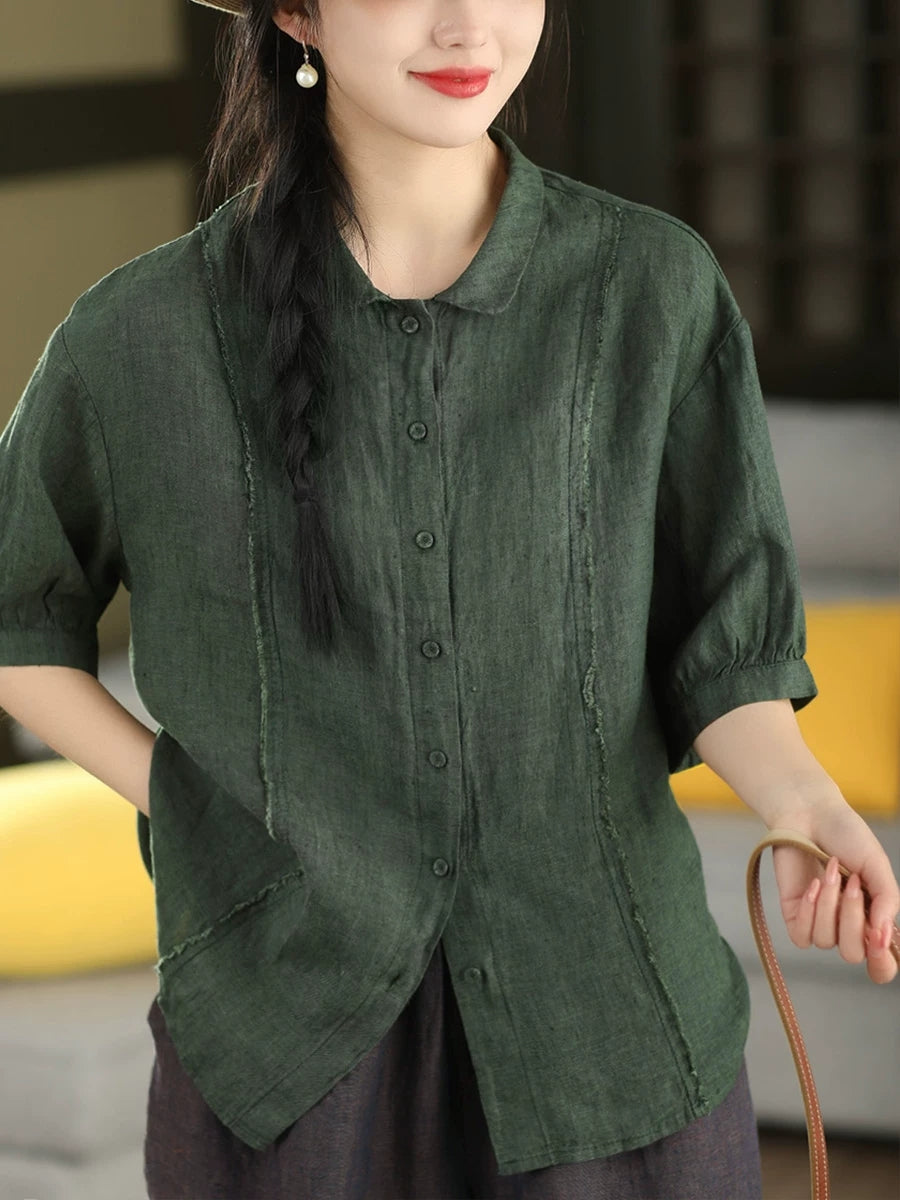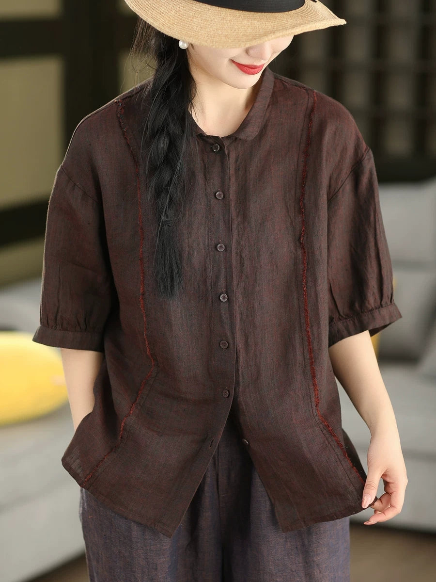 חולצת קיץ לנשים עם שוליים 100% פשתן, מודפסת בסגנון אומנותי