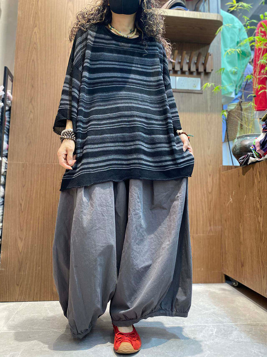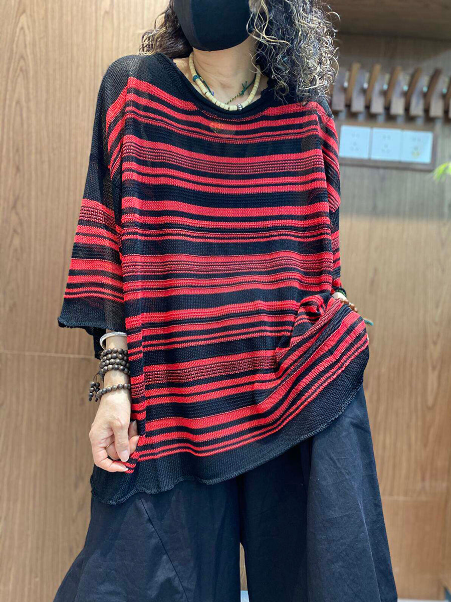 חולצה סרוגה עם צווארון O-צוואר ופסים בקיץ לנשים