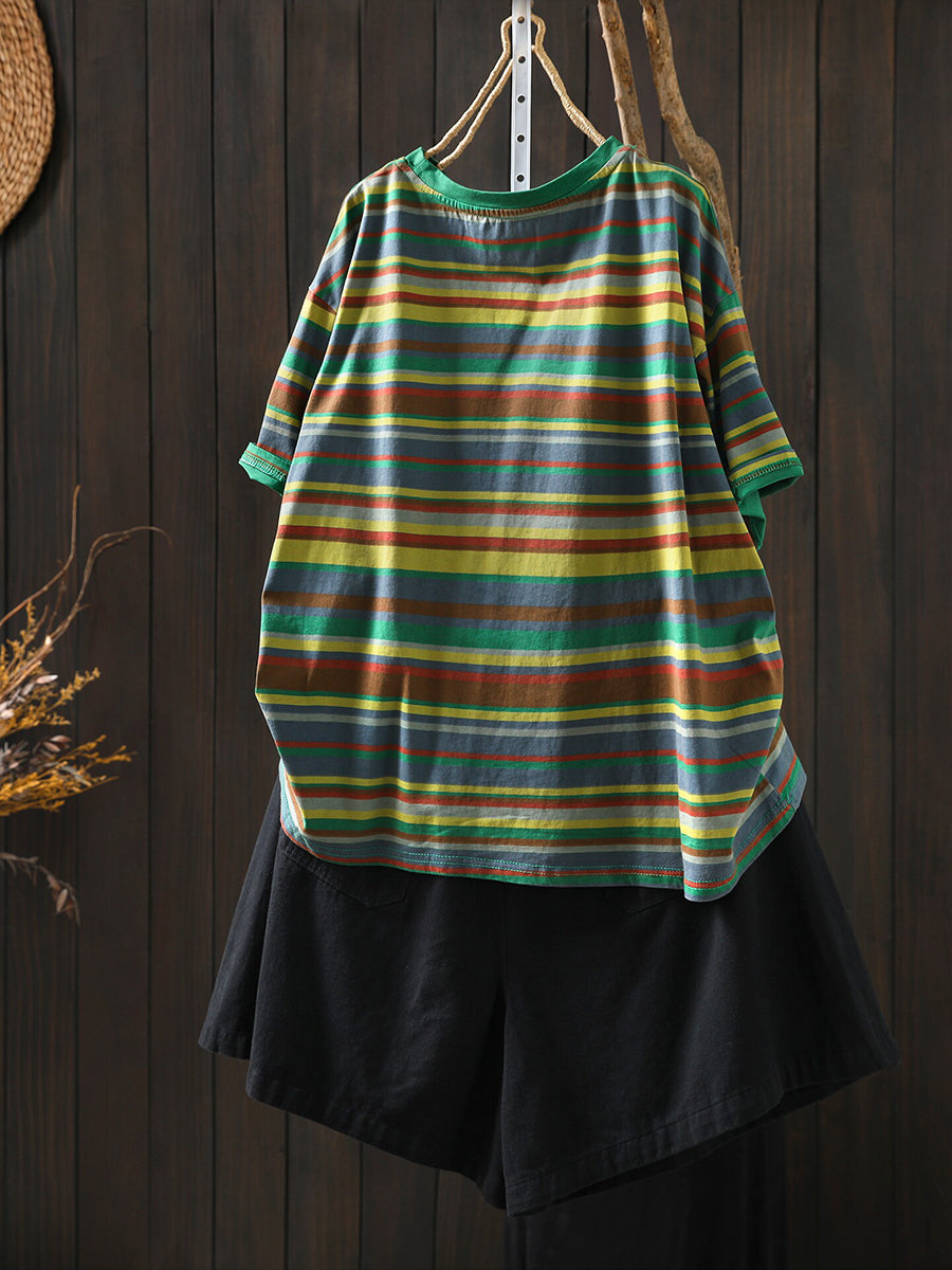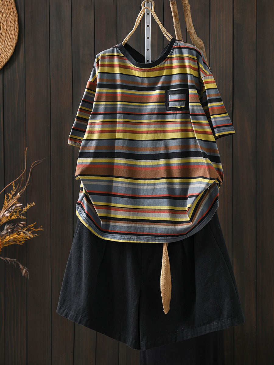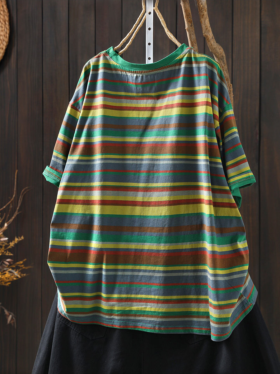 חולצת O-צוואר כותנה עם פסים מזדמנים לקיץ לנשים